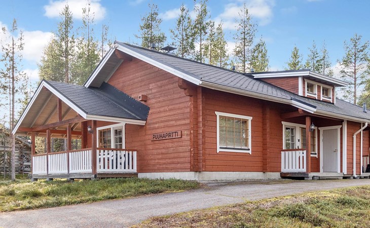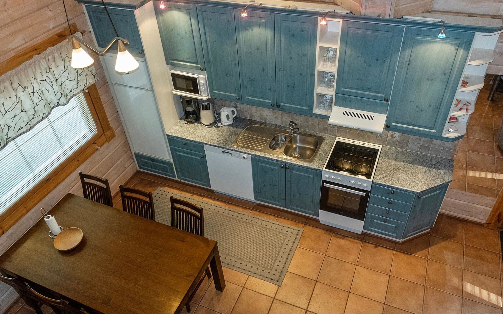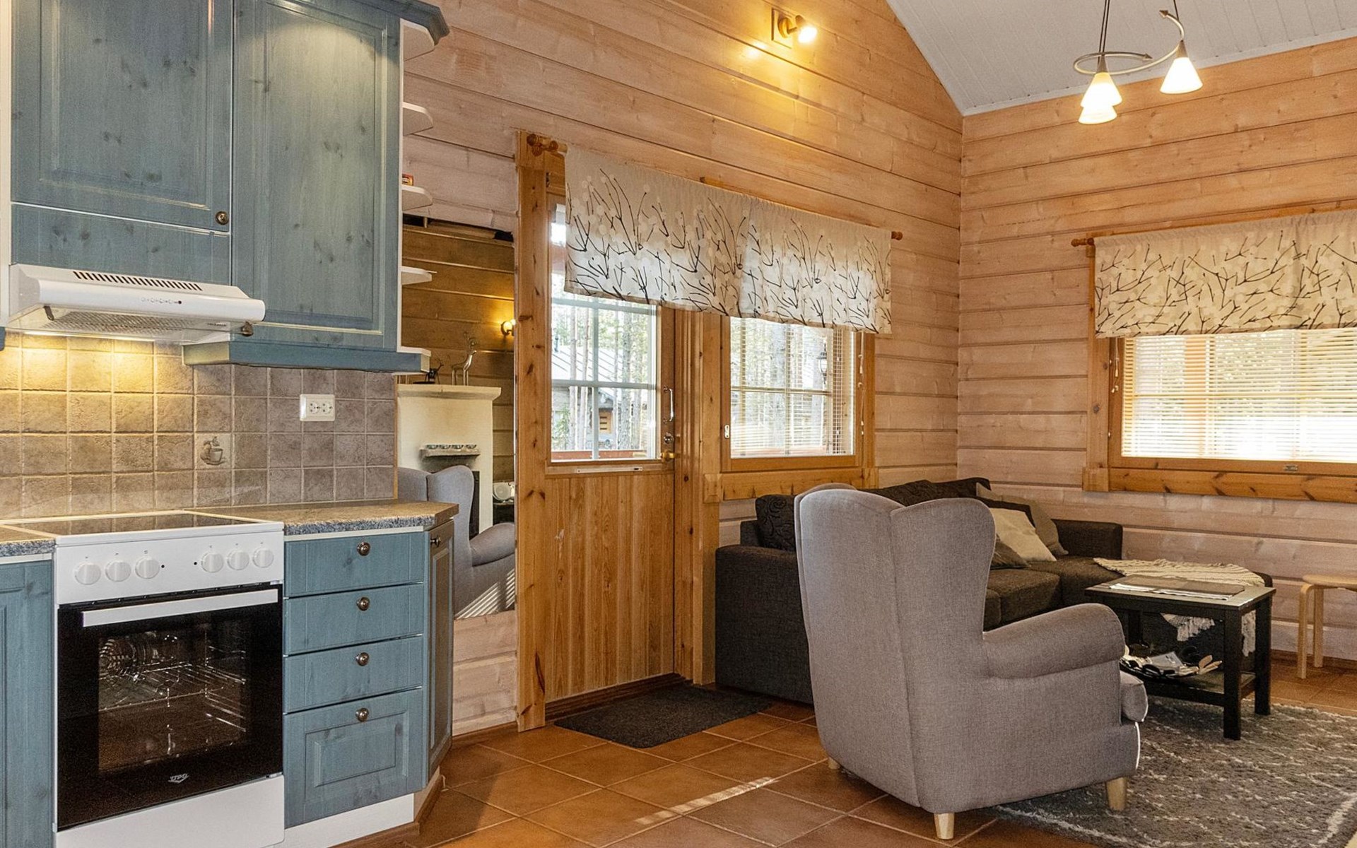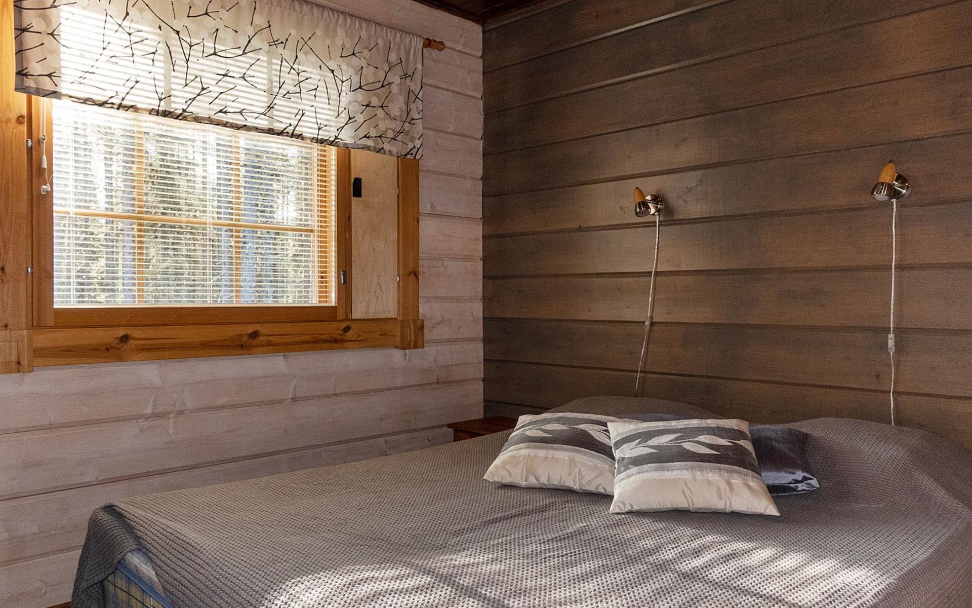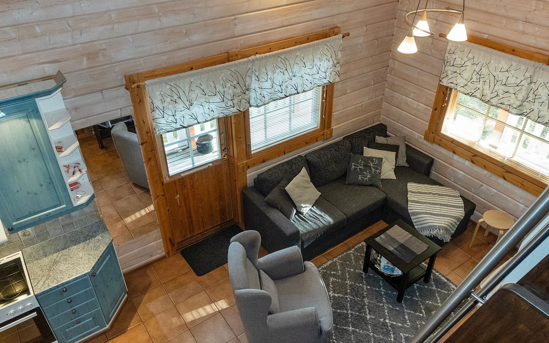 The cabin features a sauna, shower room, separate WC, storage, and a covered terrace.