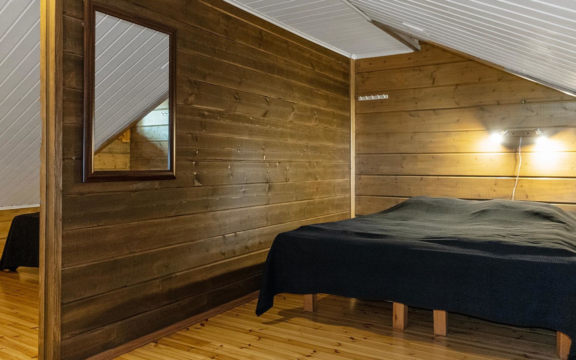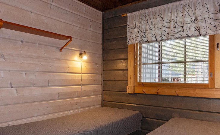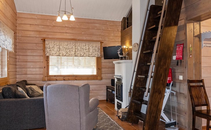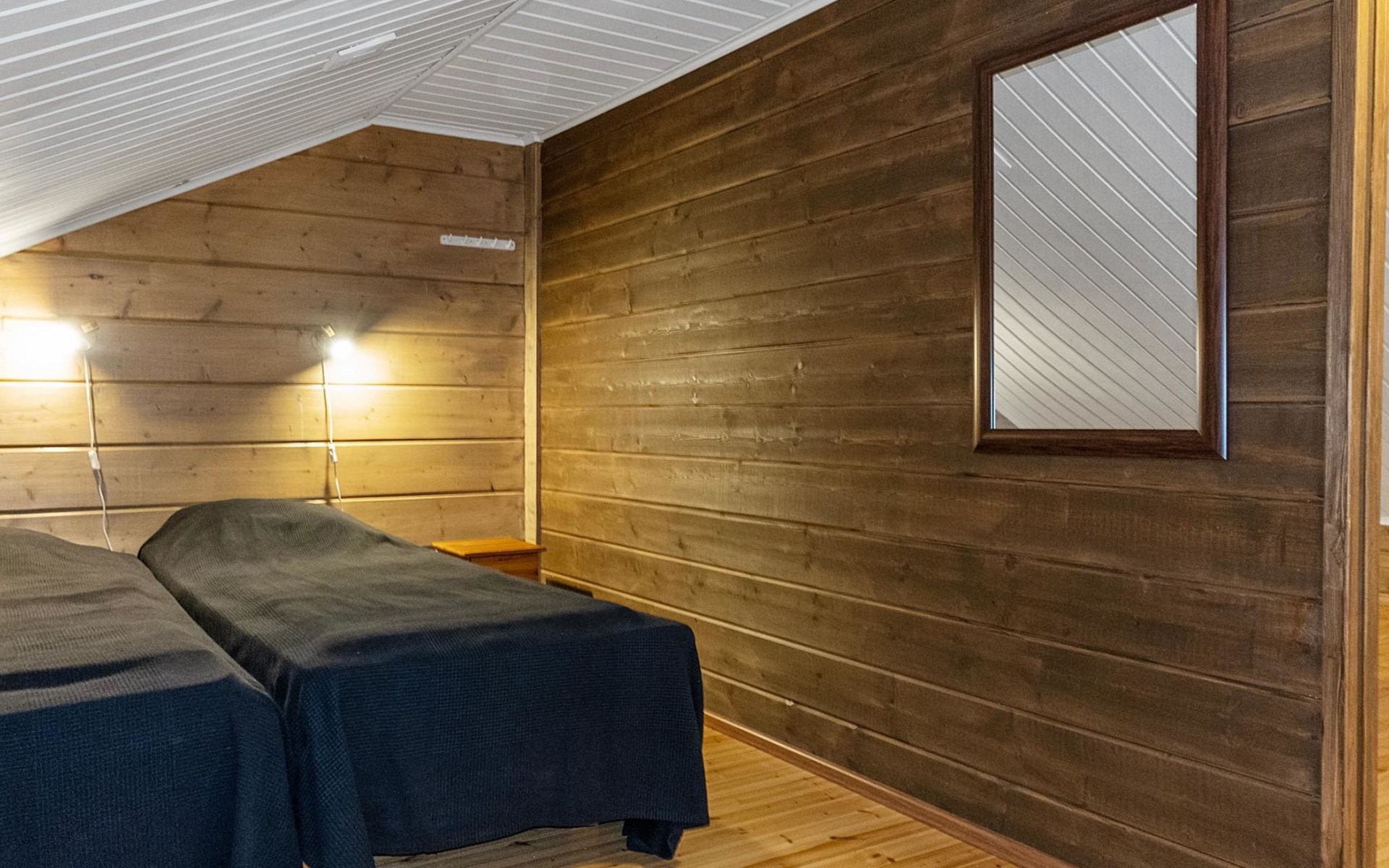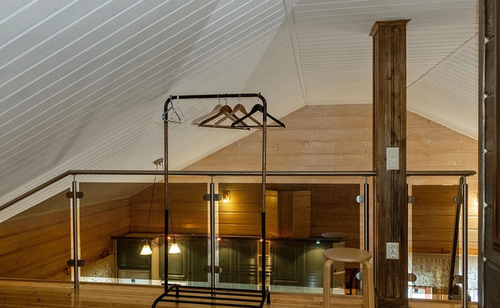 The loft has four beds in two different sections, with two beds in each section separated by a wall. Please note that the stairs to the loft are very steep, so use caution when using them. The floor area of the loft is approx. 20 m².