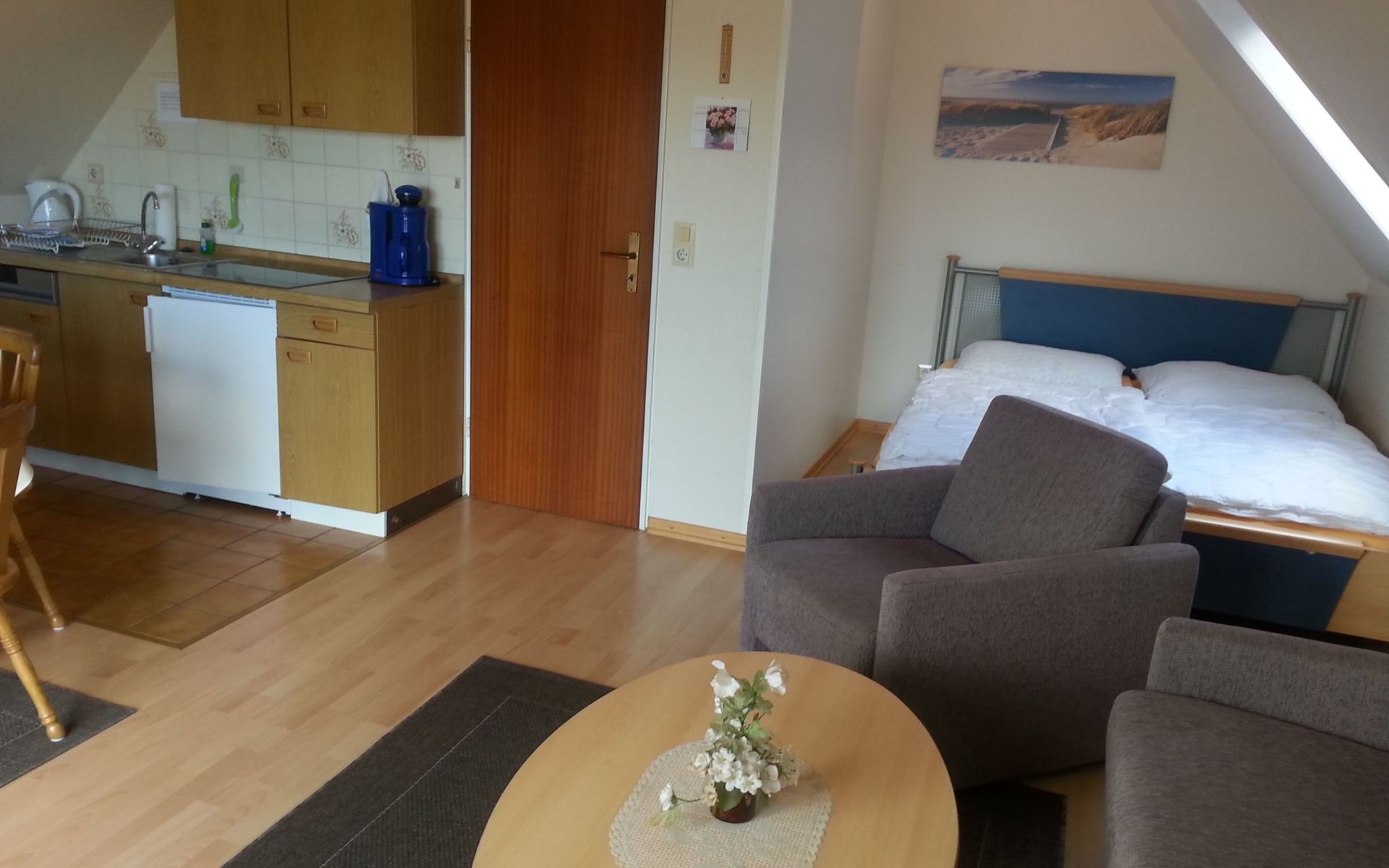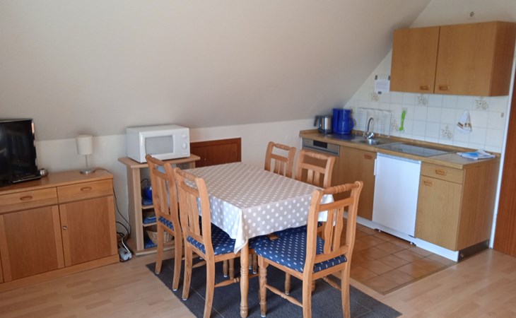 Es ist offen zu der Küchenzeile mit Geschirrspülmaschine, Mikrowelle, Cerankochfeld, Kühlschrank mit Gefrierfach, Kaffeemaschine, Wasserkocher, Toaster, Mixer, Eierkocher und Geschirr. Die Wohnung verfügt über ein Duschbad mit Dachfenster.