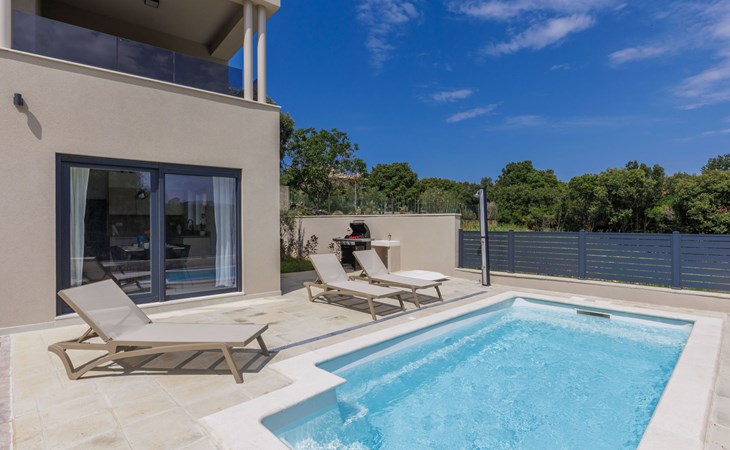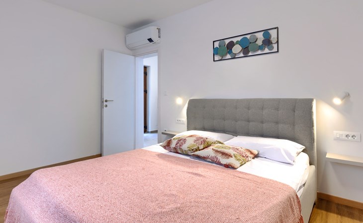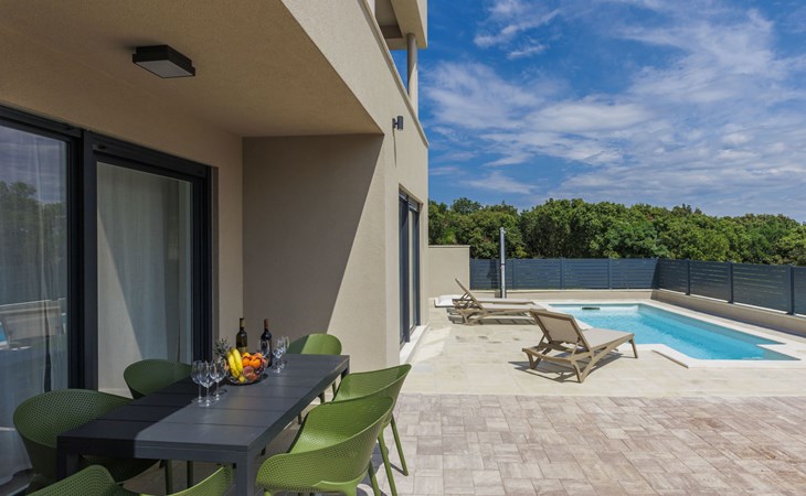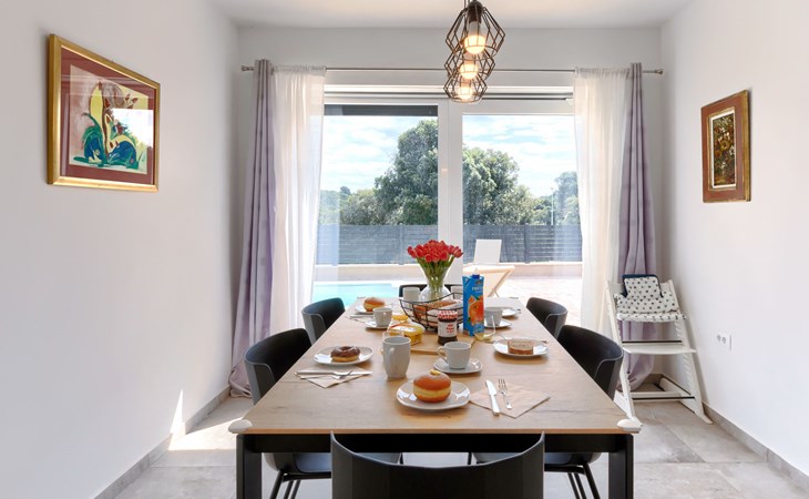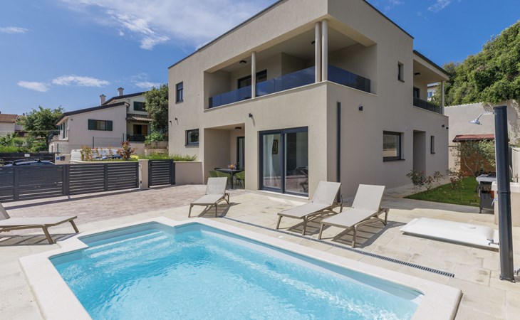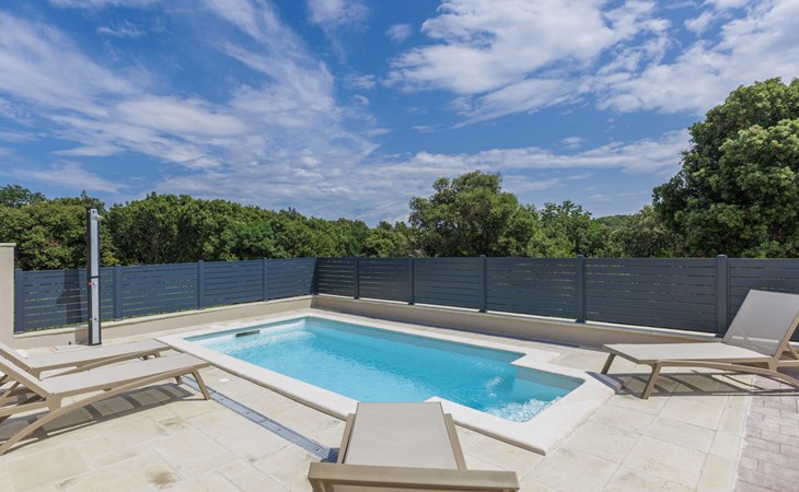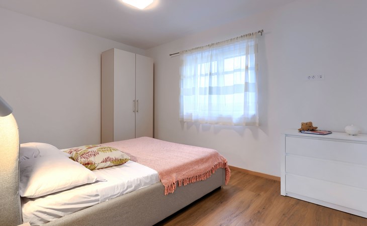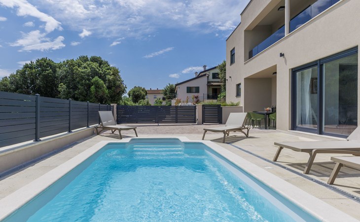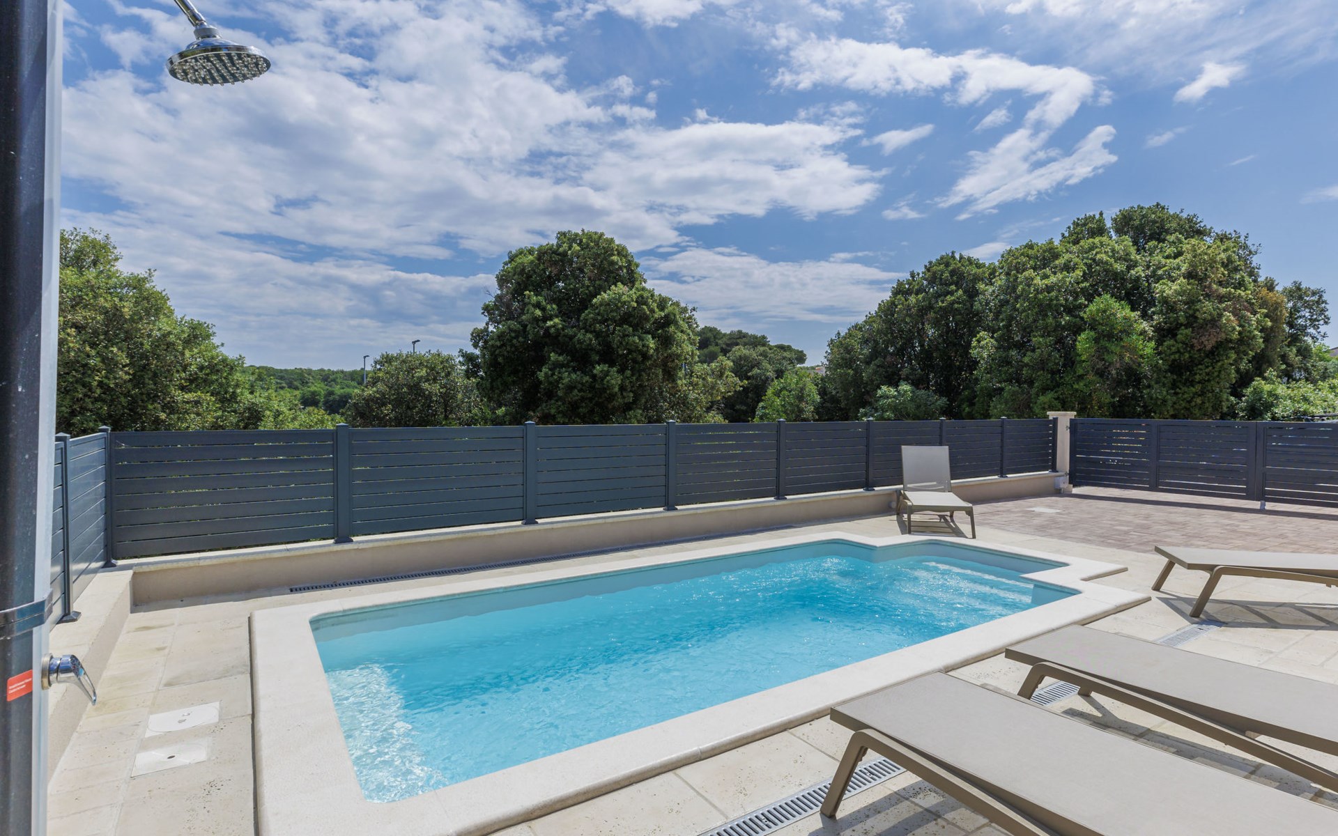 Doppelhaus "Villa Karlo". 4 km vom Zentrum von Pula, sonnige Lage, 900 m vom Meer. Zur Alleinbenutzung: Grundstück 300 m2 (eingezäunt), kleiner Garten mit Pflanzen, Schwimmbad eckig (6 x 3 m, 140 cm tief, saisonale Verfügbarkeit: 01.Mai. - 15.Okt.) mit Innentreppe. Aussendusche, Grill. Im Hause: Internetzugang, Tischtennis, Waschmaschine. Zufahrt (50 m Naturweg). Parkplatz (für 2 Autos) beim Haus auf dem Grundstück. Einkaufsgeschäft 100 m, Supermarkt 3 km, Restaurant 150 m, Bushaltestelle 260 m, Kieselstrand, Felsstrand 900 m. Surfschule 9 km, Tennis 9 km, Reitstall 9 km, Wanderwege ab Haus 100 m, Radweg 150 m. Der Besitzer akzeptiert keine Jugendgruppen.