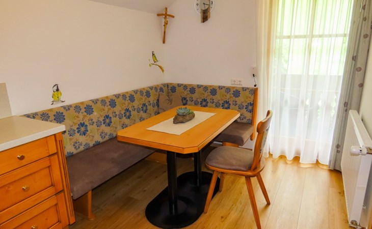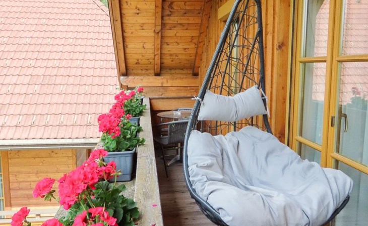 Die Wohnung verfügt sowohl über eine Terrasse als auch zwei Balkone mit Hängesesseln, die zum Entspannen im Freien einladen. Der Garten des Anwesens steht zur gemeinschaftlichen Nutzung zur Verfügung und bietet mit seiner Hängeliege und Liegestühlen einen harmonischen Rückzugsort. Direkt am Waldrand gelegen, ist dies der ideale Ausgangspunkt für Naturliebhaber und Erkundungstouren in die Umgebung.