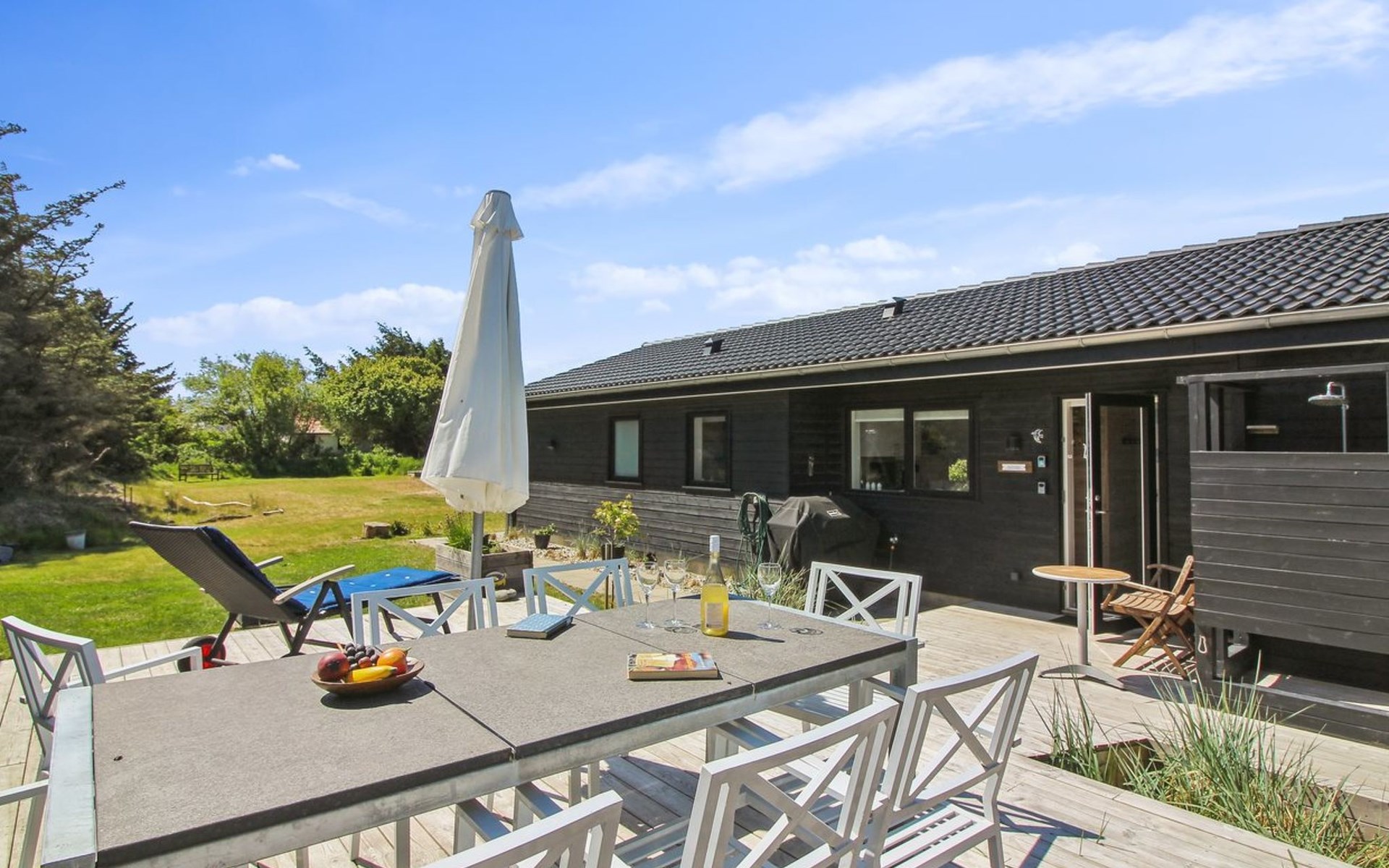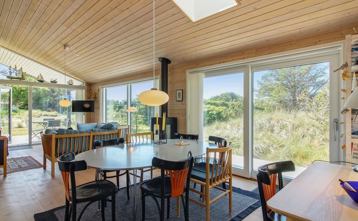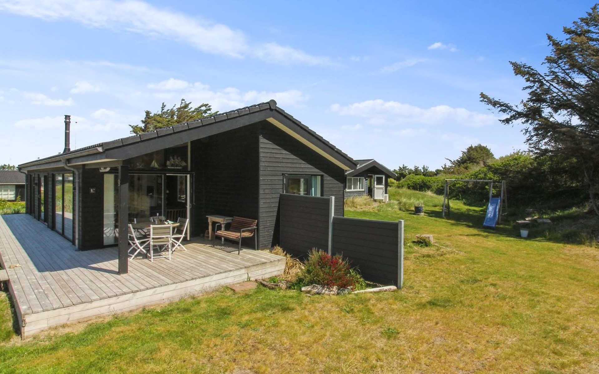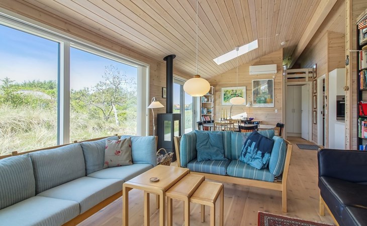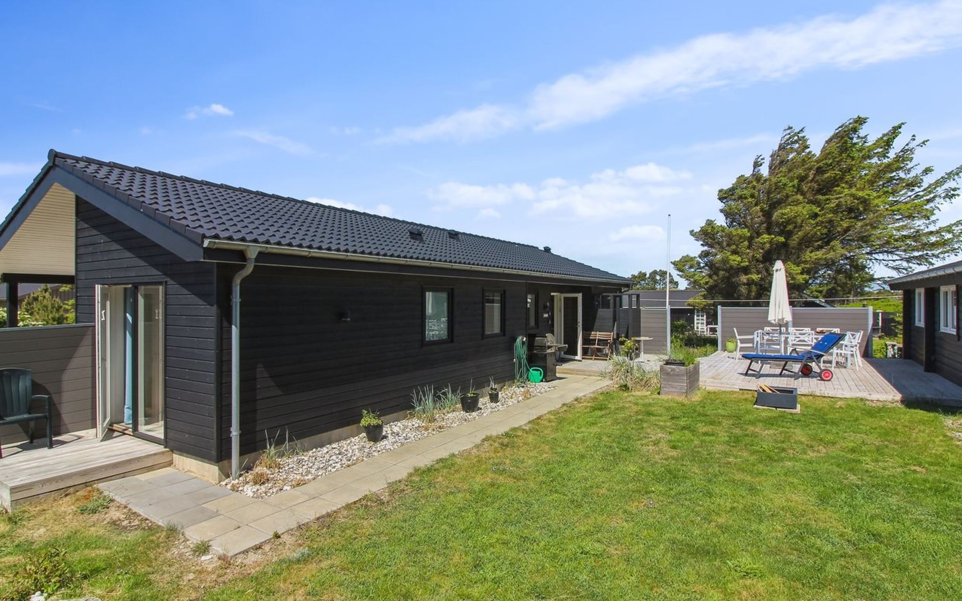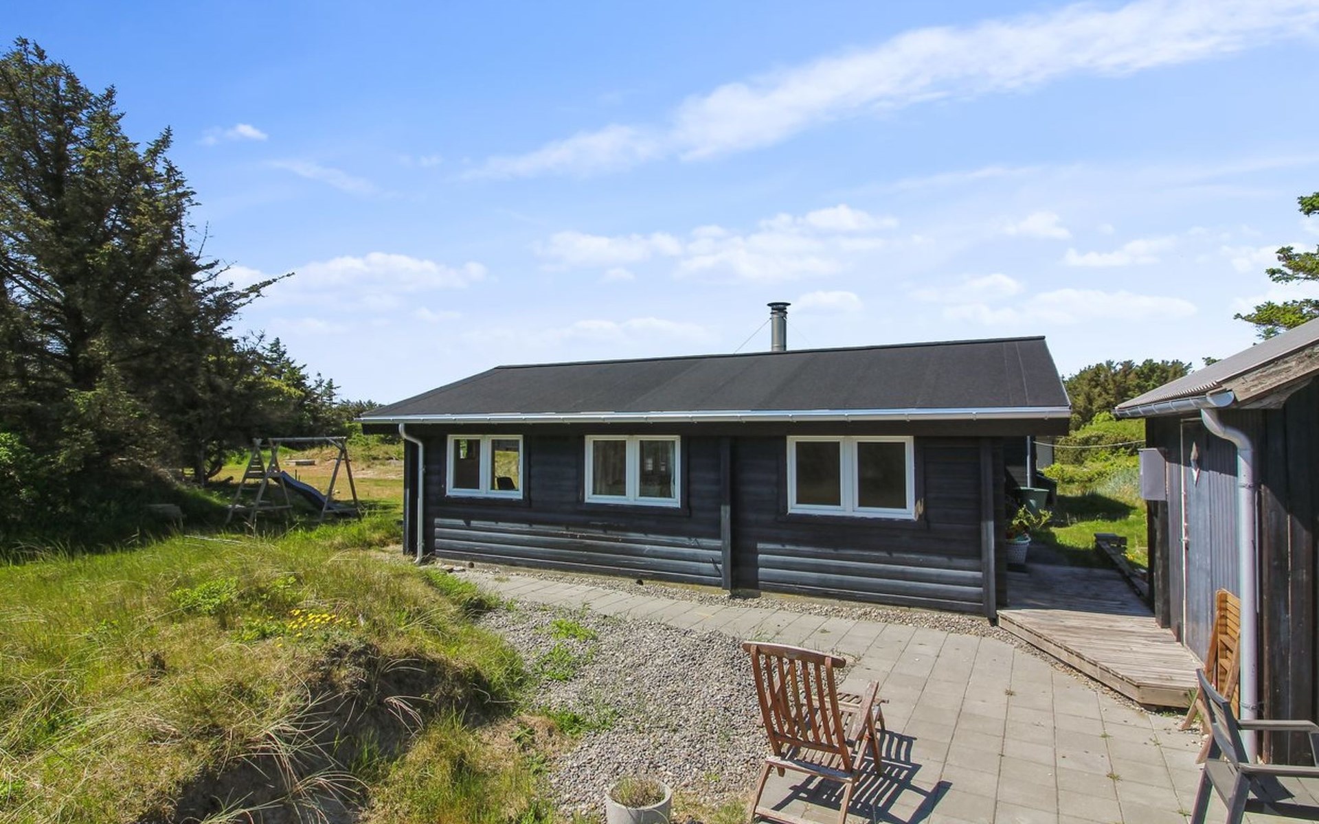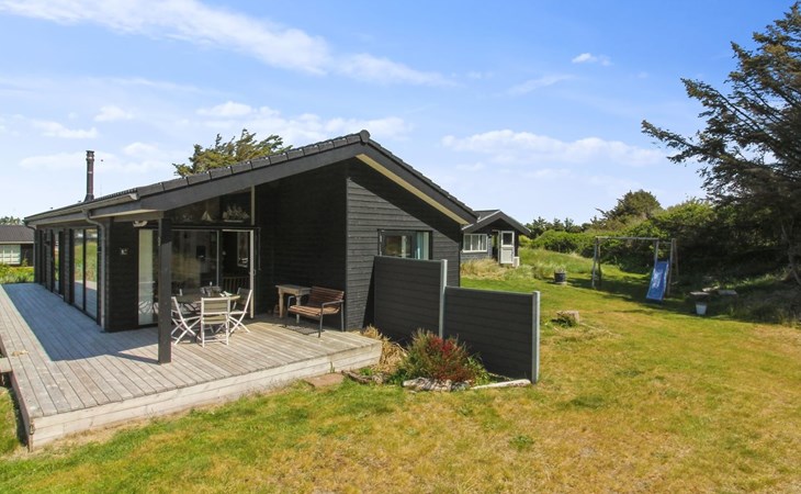 Einfamilienhaus, Baujahr 2020. 400 m vom Meer. Zur Alleinbenutzung: naturbelassenes Grundstück 1'750 m2. Aussendusche, Grill, Kinderspielplatz (Rutschbahn, Schaukel). Im Hause: Sauna, Waschmaschine. Parkplatz beim Haus. E-Ladestation. Lebensmittelgeschäft 4 km. Golfplatz 10 km. Der Besitzer akzeptiert keine Jugendgruppen.