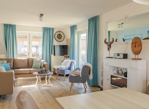Genießen Sie einen stilvollen und komfortablen Urlaub in der Vennenhof Bungalow Deluxe. Dieser geräumige und luxuriöse Bungalow bietet Platz für 6 Personen und kombiniert modernes Design mit Ruhe. Das Wohnzimmer mit offener Küche ist hell und geräumig, mit Flügeltüren, die auf eine große Terrasse mit einer bequemen Loungemöbelgruppe und Gartenmöbeln führen.