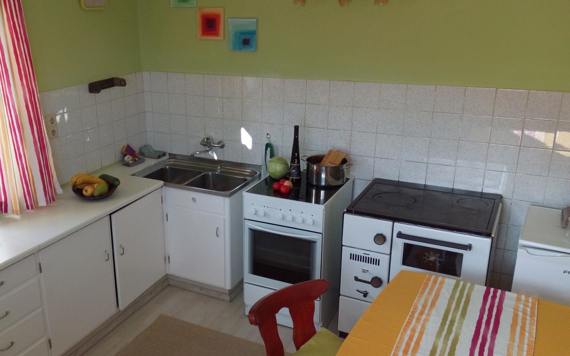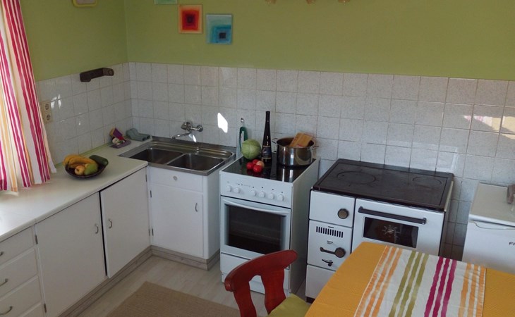 Auf 60m² ist eine Wohlfühloase im Erdgeschoss entstanden, in der bis max. 5 Personen den Arbeitsalltag hinter sich lassen können. Nach einem spannenden Tag für Erwachsene und Kinder können Sie sich in der Wohnküche mit einer großen Sitzecke auf ein gemeinsames Spiel freuen. Ein Zusatzherd gibt dem gemütlichen Ambiente eine besondere Note. Während jemand in der komplett ausgestatteten Küche mit 4- Platten Herd und Backofen, Kaffeemaschine und Kühlschrank ein Frühstück, Mittag- oder Abendessen zaubert, können sich die anderen Gäste einen spannenden Film ansehen (Sat-TV vorhanden) oder über das Internet ihre Erlebnisse mit den Freunden zu Hause teilen. Für Ihre angenehme Nachtruhe, stehen Ihnen zwei getrennte Schlafzimmer mit Doppelbetten zur Verfügung. Ein Zimmer wird nach Bedarf mit einem 5. Bett (Schlafsofa) bestückt. Im Badezimmer können Sie sich mit einer Dusche samt Massagedüsen vom erlebten Tag so richtig entspannen.