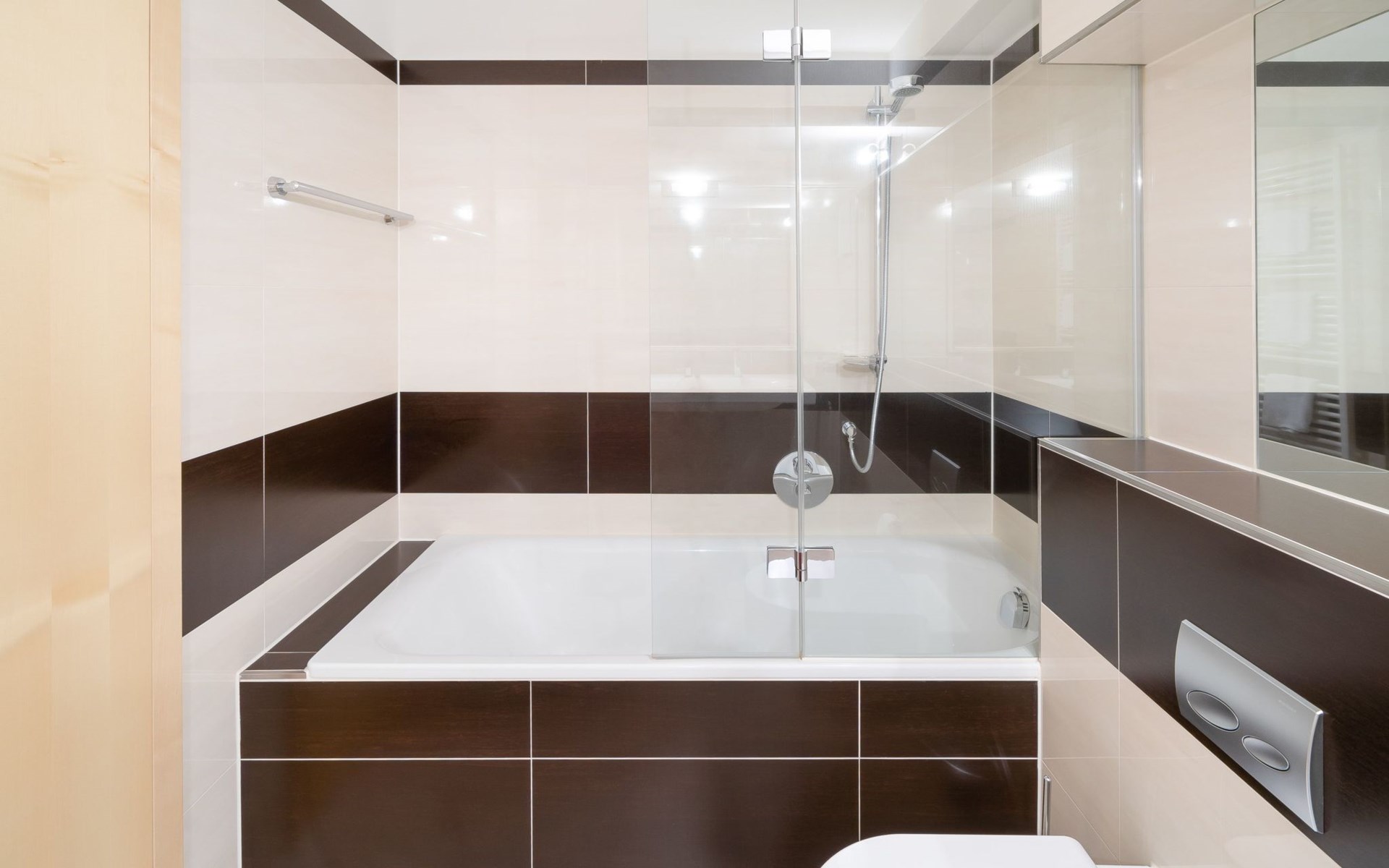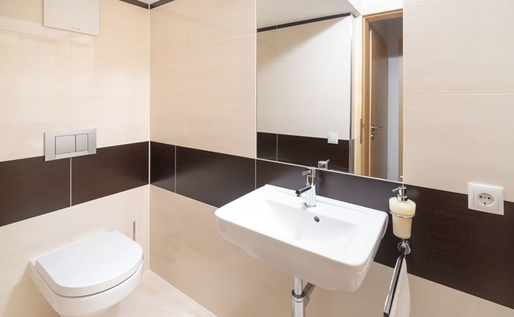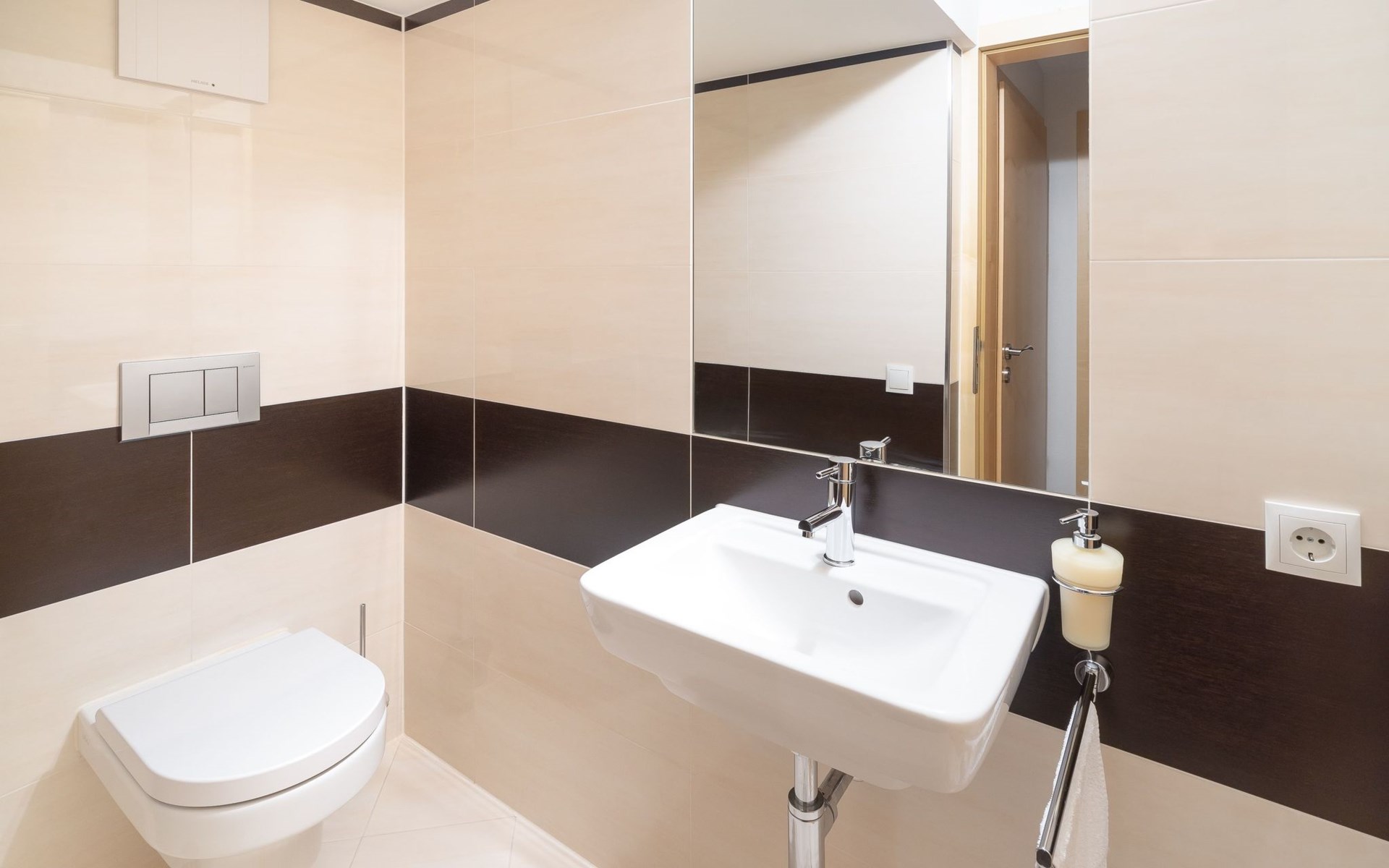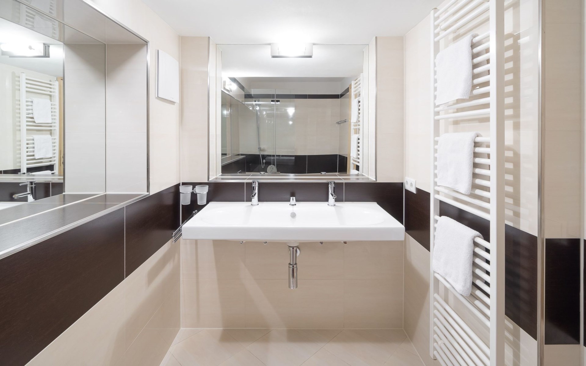 Das Bad verfügt über eine Badewanne, Doppelwaschbecken sowie ein separates WC mit Waschbecken.