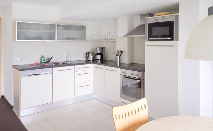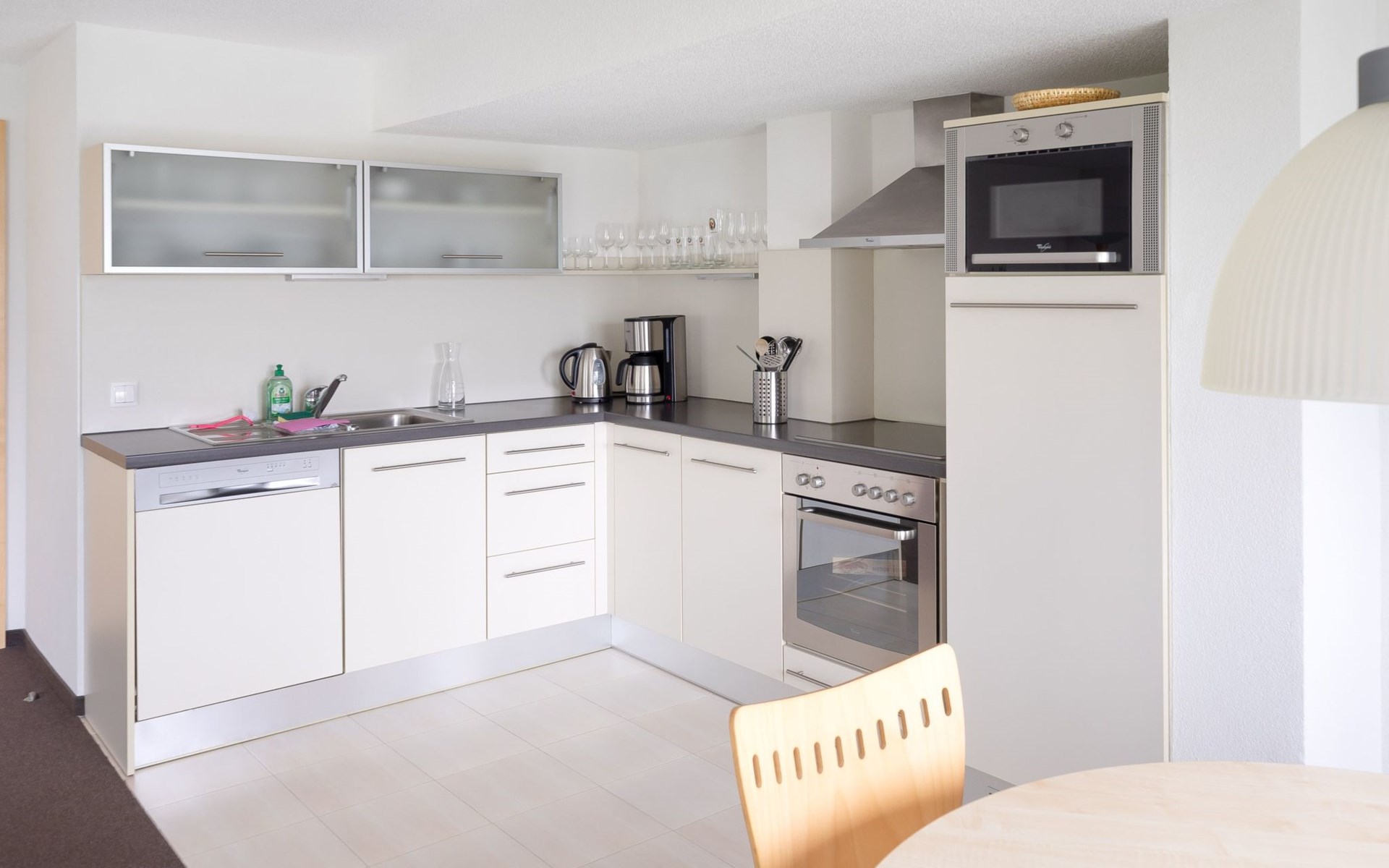 Die Küche ist mit einer Spülmaschine, Mikrowelle, Kaffeemaschine, einem Herd mit Backofen und Wasserkocher ausgestattet.