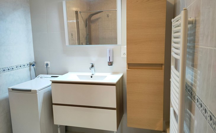 ~ Badezimmer: italienische Dusche, einfaches Waschbecken, Waschmaschine, Handtuchheizkörper.