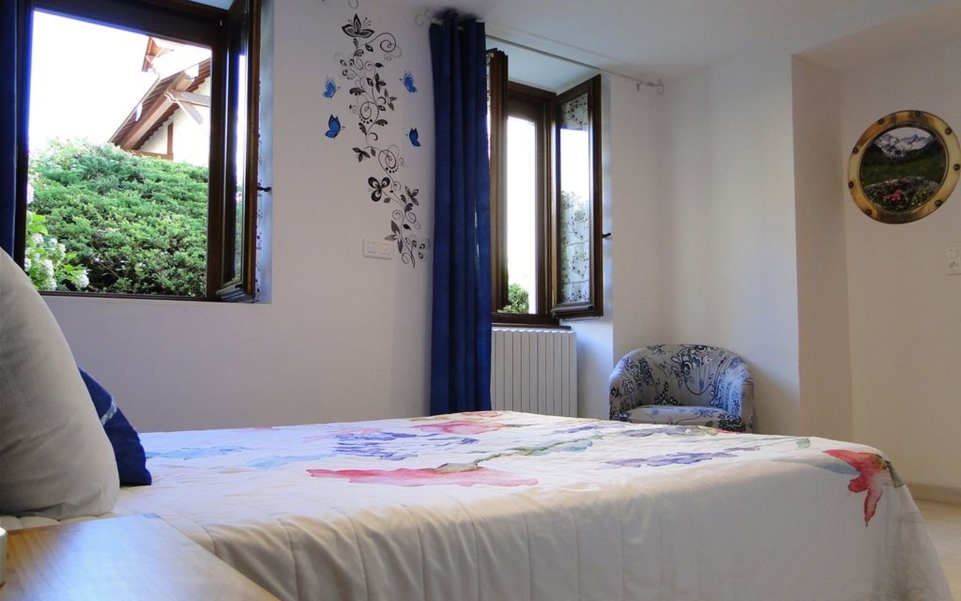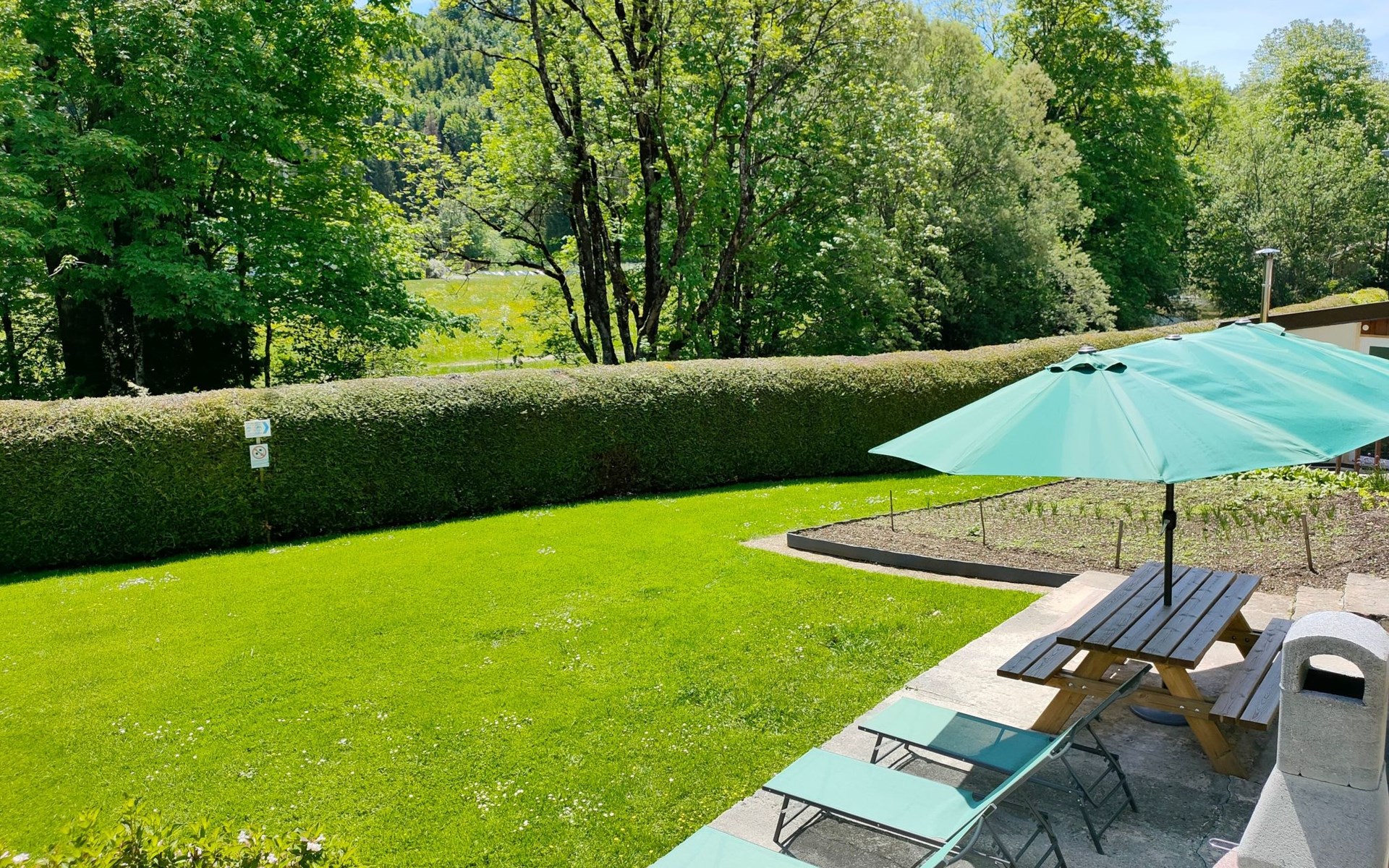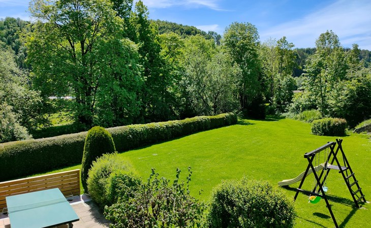 - Freier Blick auf den Garten, den Fluss und die Berge.