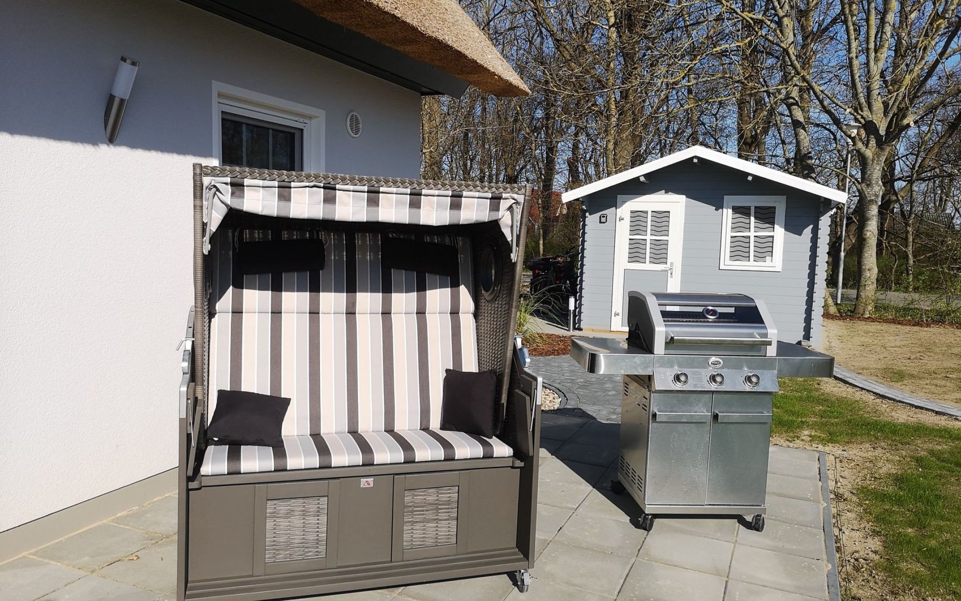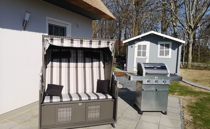 Der Großzügige Garten von ca. 600 m² (das Gesamte Grundstück umfasst 975m²) steht zu Ihrer exklusiven Nutzung zur Verfügung. Auf der großzügigen Terrasse befindet sich ein Esstisch mit 2 Bänken für bis zu 8 Personen. Der schwenkbare Sonnenschirm kann an 2 strategischen Stellen aufgestellt werden. Außerdem steht Ihnen auch ein bequemer Strandkorb zur verfügen. Wenn Sie dann Abends von Ihrer Rügen Erkundung wieder im Haus einlaufen, haben Sie auch die Möglichkeit den Gasgrill für ein kulinarisches Barbecue zu nutzen.