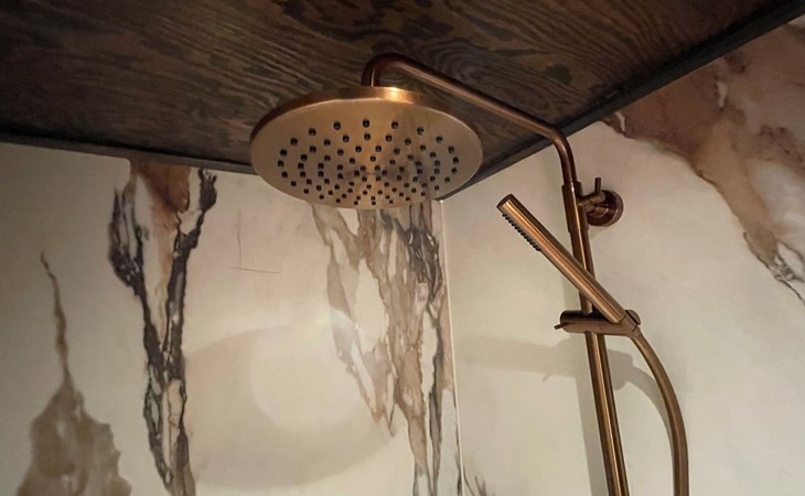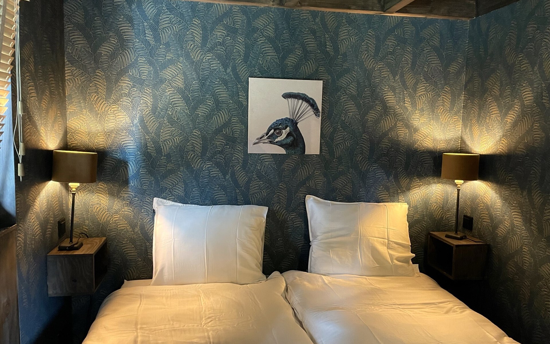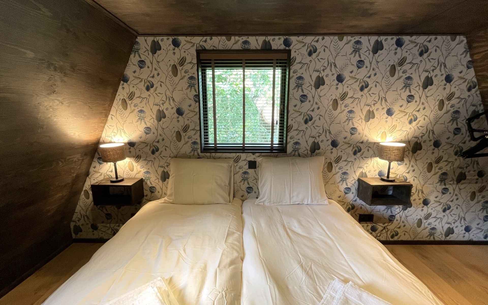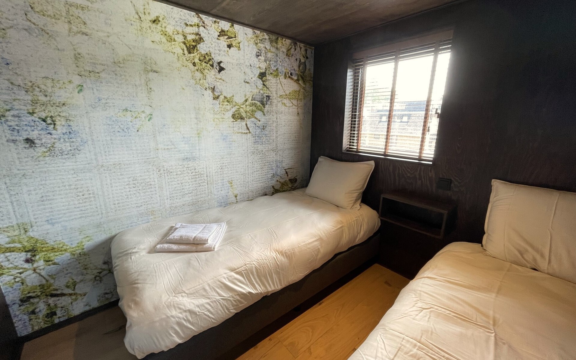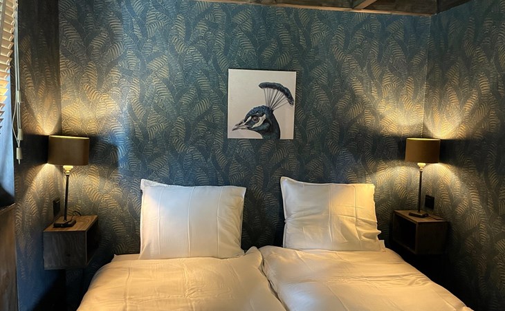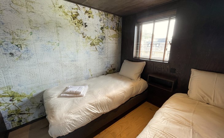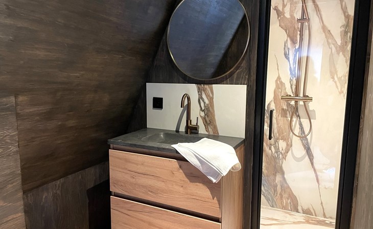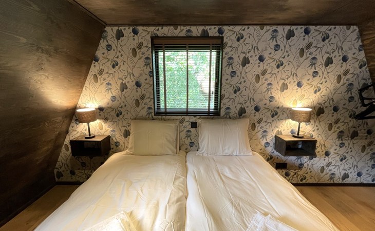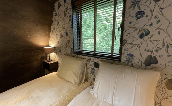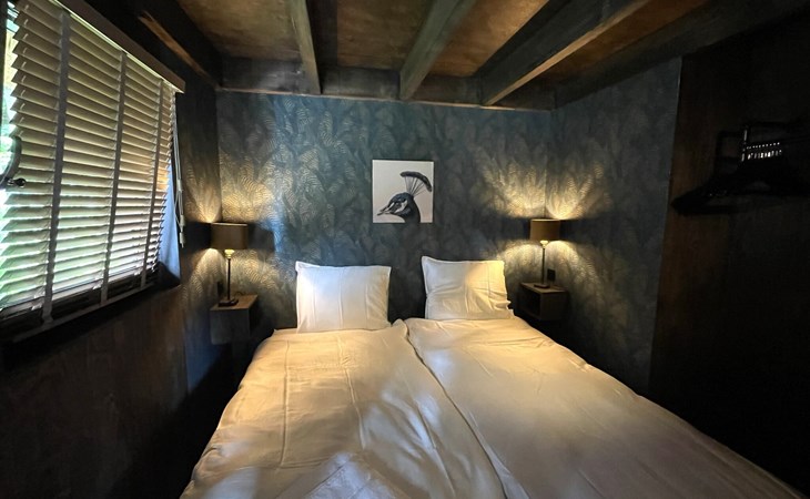 Im Obergeschoss befinden sich die beiden anderen Schlafzimmer mit gemeinsamem Bad. Ein Schlafzimmer ist mit einem Boxspring-Doppelbett ausgestattet, das zweite Schlafzimmer mit zwei Boxspring-Einzelbetten. Das luxuriöse Badezimmer verfügt neben Waschbecken und Toilette auch über eine verlockende Regendusche.