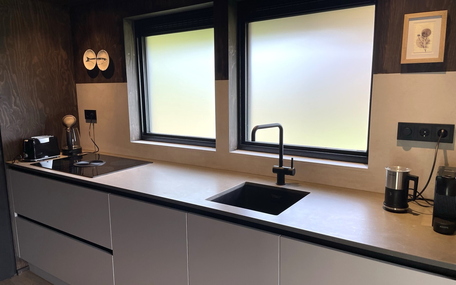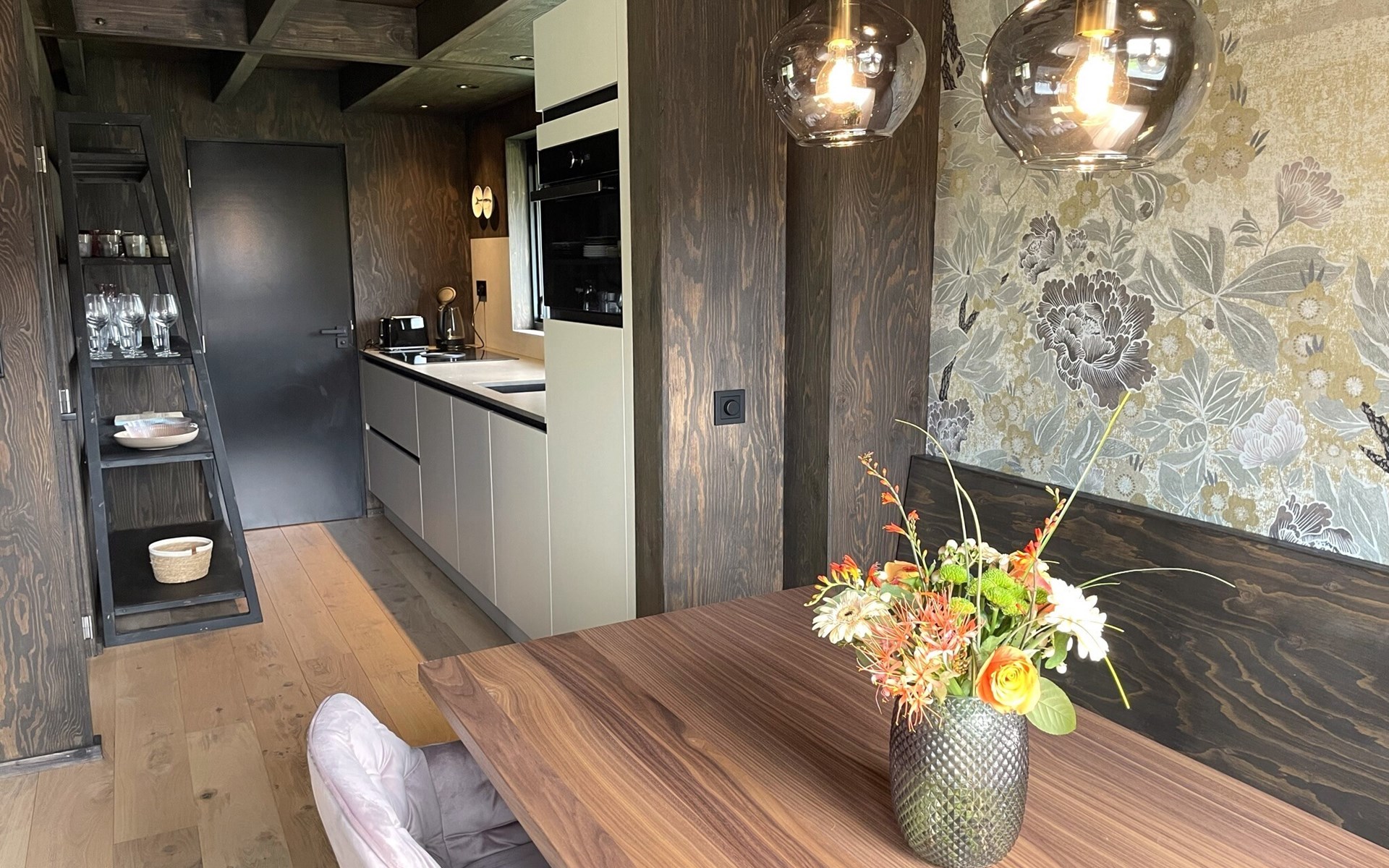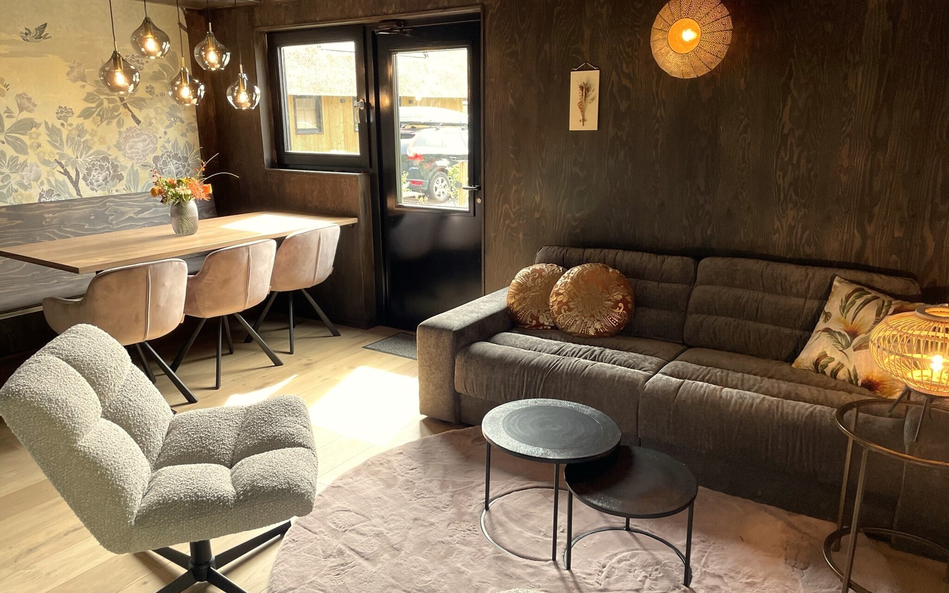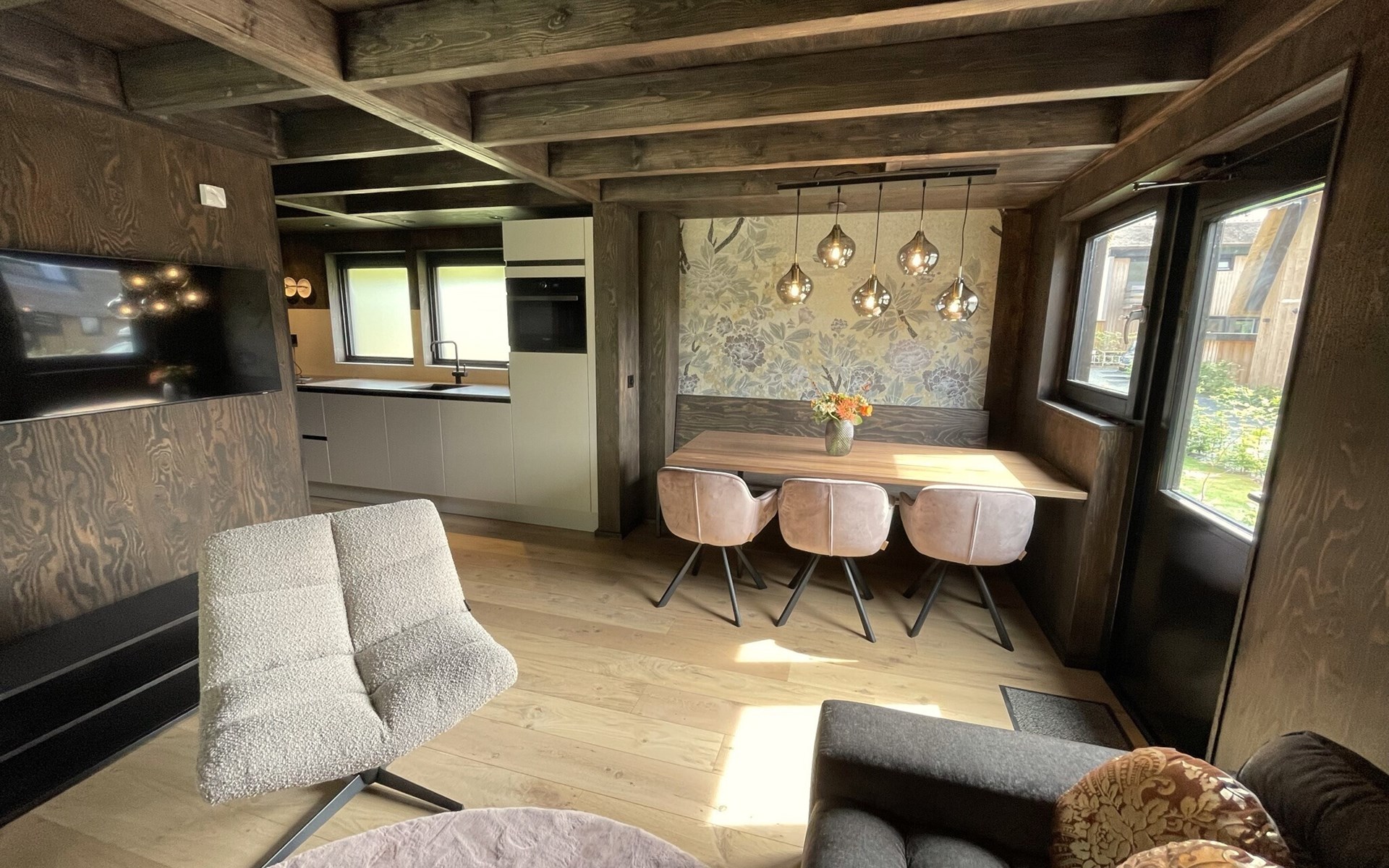 Das Wohnzimmer ist wohlig-warm und geschmackvoll eingerichtet: Es gibt eine bequeme Sitzecke, ein Smart-TV und einen schönen Esstisch. Die offene Küche ist mit allen modernen Annehmlichkeiten wie Induktionsherd, Spülmaschine, großem Kühlschrank und Kaffeemaschine ausgestattet.