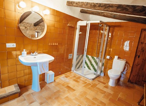 - Badezimmer mit Einzelwaschbecken, Dusche, WC und Haartrockner