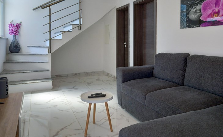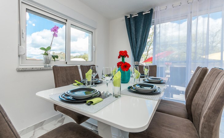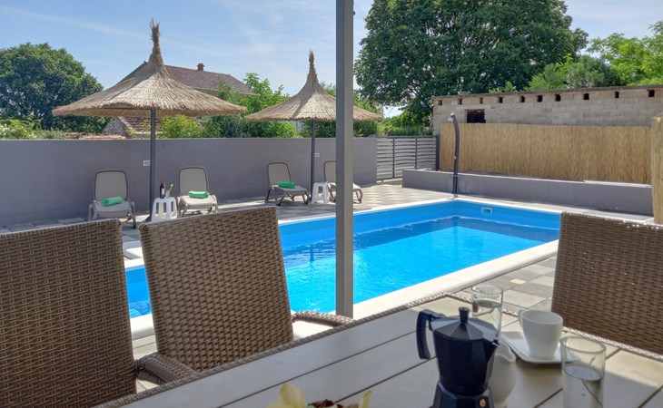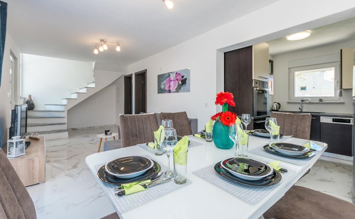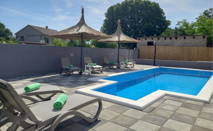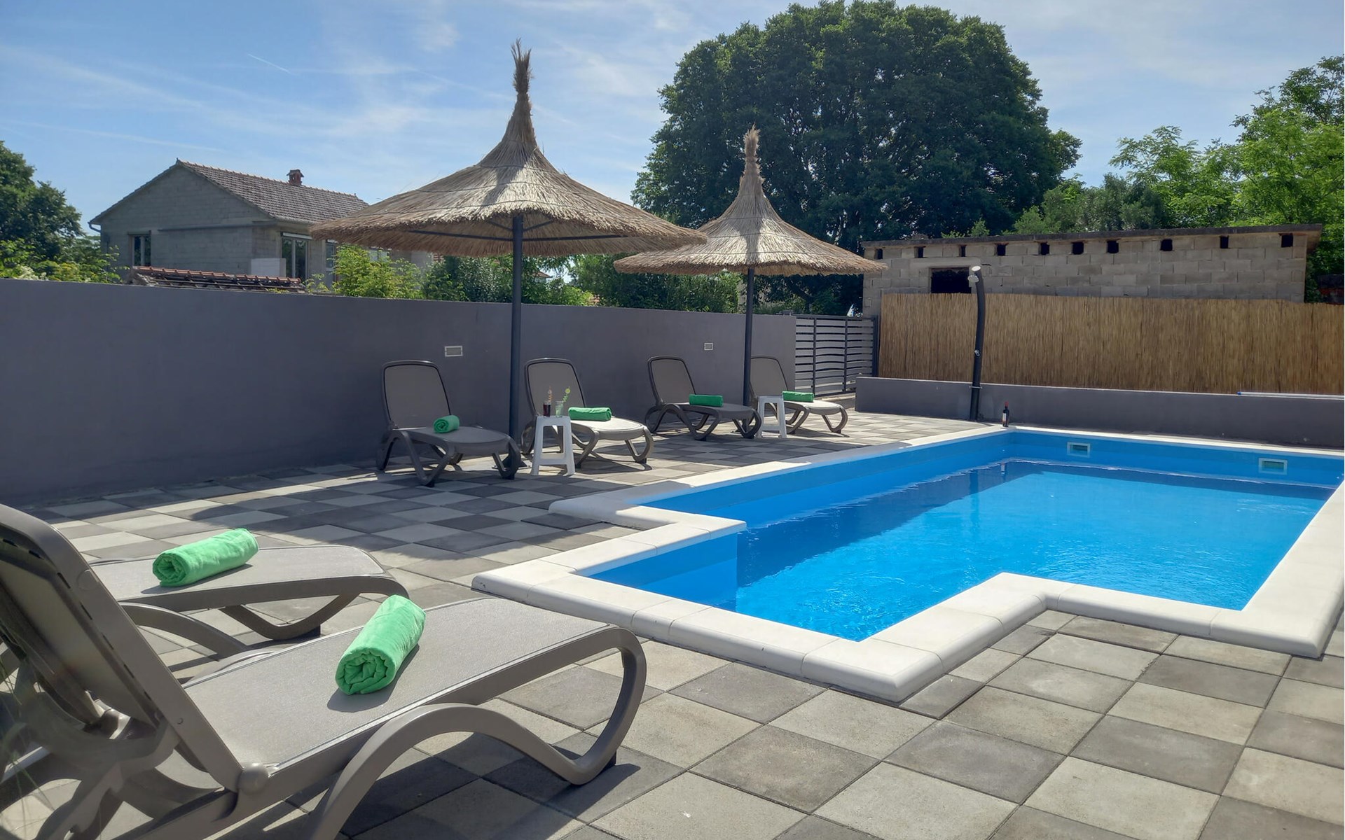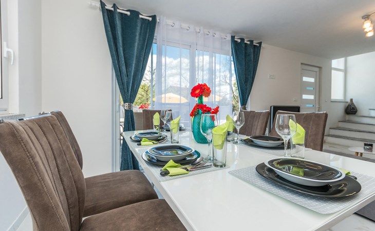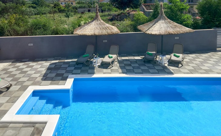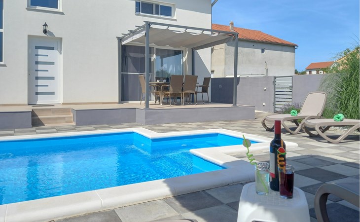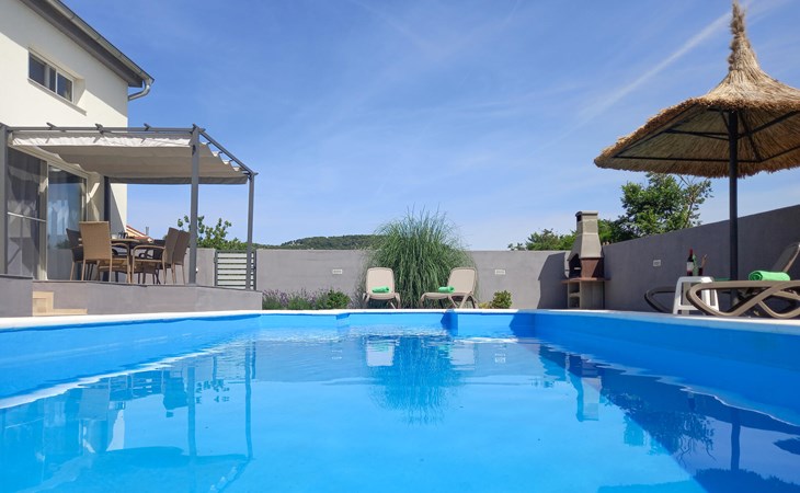 Dieses gemütlich und modern eingerichtete Ferienhaus wird Ihnen besonders gefallen. Die geschmackvollen Möbel in Verbindung mit hellen stilvollen Dekorationen erschafft eine wunderbare Atmosphäre zum Wohlfühlen. Hier können Sie es sich mit Ihrer Familie für einen Urlaub bequem machen und die Zeit in Kroatien genießen, während Sie auf nichts verzichten müssen, um einen entspannten Urlaub zu haben. Das Wohnzimmer öffnet sich auf eine geräumige Terrasse mit Außenpool, Sonnenliegen und Grill, wo Sie Ihren Morgenkaffee und Ihre Mahlzeiten gemeinsam genießen können. Auch für die kleinen Gäste gibt es einen privaten Garten in dem Sie unbeschwert spielen können.