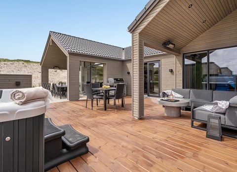 Alle Räume des gediegenen und hübschen Hauses sind mit schönen Marmor-Klinkerböden und Fußbodenheizung ausgestattet. Der große Wohnraum hat eine offene Dachkonstruktion und die nach Westen gelegene Giebelpartie sorgt für einen fantastischen Lichteinfall. Von den offenen Schlafböden, die teils als Schlafräume und teils als TV-/Spielräume eingerichtet sind, haben Sie Aussicht über die Wohnstube und gen Westen. Es steht Ihnen ebenso ein Whirlpool und eine Sauna zur Verfügung, wo Sie sich vollkommen entspannen können. Der Außenbereich lädt auch zu Aktivitäten in den Ferien ein, u.a. zum Grillen mit Ihren Freunden und Familie.