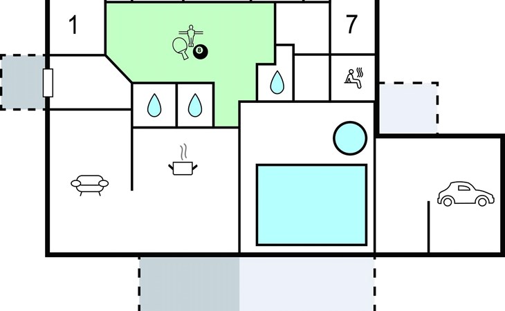 Ihr geräumiges und stilvolles Ferienhaus in Løkken bietet die ideale Unterkunft für mehrere Familien oder eine große Freundesgruppe und garantiert einen erholsamen Aufenthalt voller Abwechslung. Der moderne und komfortable Wohnbereich ist mit bequemen Sitzmöbeln und gemütlichen Dekoelementen ausgestattet. Der offene Essbereich bietet Platz für alle Gäste, und die Küche ist mit modernen Geräten bestens ausgestattet, um Ihre Lieblingsgerichte zuzubereiten. Nutzen Sie den Billardtisch und den Tischkicker für Spaß und Unterhaltung. Das absolute Highlight ist jedoch der private Pool mit einer Wasserrutsche sowie der Whirlpool und die Sauna, die für zusätzliche Entspannung sorgen.