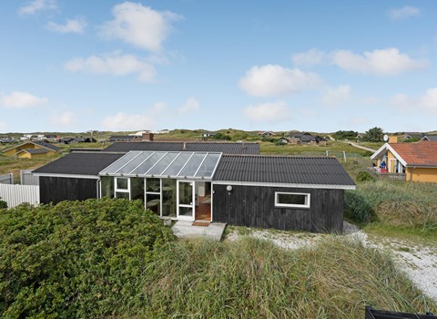 On a natural plot close to Lakolk beach and the shopping center lies this stylish luxury house, built as an energy saving house and made of only the best materials. It is ideal for two families and offers every conceivable comfort, including an extra TV on the sleeping loft and two luxury bathrooms - one with whirlpool and sauna. There are no stairs or doorsteps. A large, beautiful and partially fenced terrace surrounds the house on three sides. For playing there is plenty of space on the large property despite the terrace set between the dunes. Visit this beautiful area of Denmark and enjoy peace and relaxation!