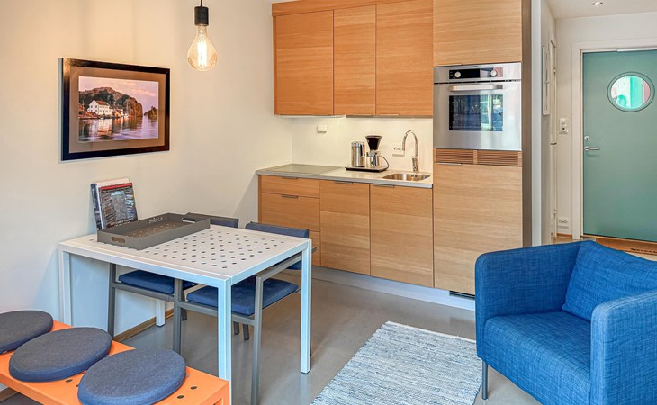 This bright and airy holiday apartment enjoys a sheltered location by the harbour on the beautiful island of Ny-Hellesund and offers you a comfortable home away from home during a nature-filled break by the sea. Conjure up energising dishes in the beautiful, open-plan kitchen and look forward to meals together at the bright dining table. Organise cosy games evenings or immerse yourself in an exciting book on the comfortable sofa.