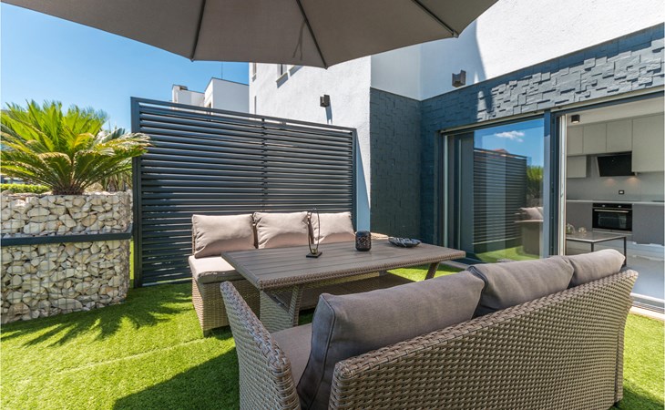 Also on the 2nd floor is the terrace with outdoor jacuzzi for 4 people, enjoy wonderful relaxing baths here with beautiful views. Also in the private fenced garden with seating you can enjoy the sun, also you can use the large common property on the community barbecue to prepare delicious dishes.