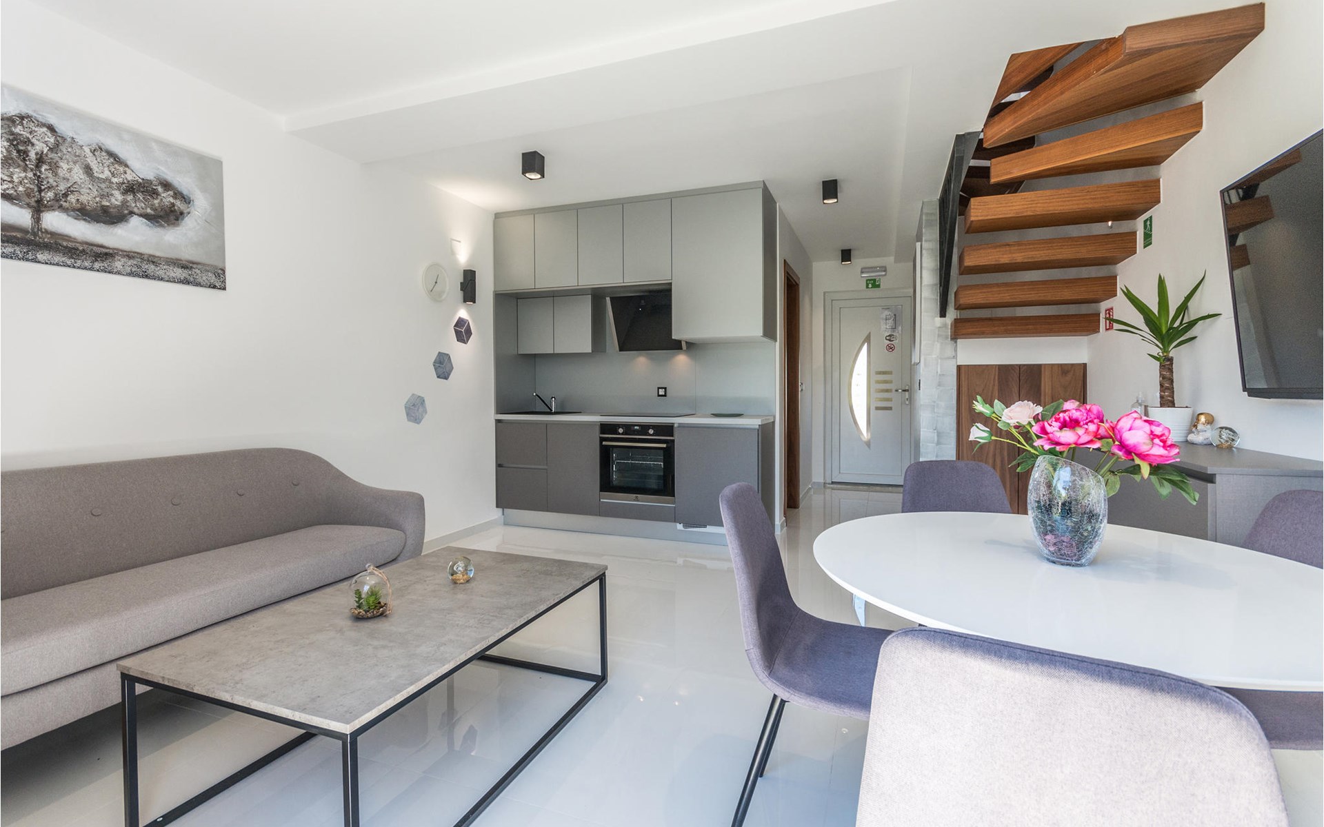 The terraced house has three floors connected by an interior staircase. On the first floor there is a kitchen with living room and bathroom, on the 1st floor 2 bedrooms with 1 bathroom and on the 2nd floor there is a party room with billiards, e-darts and smart TV. Air conditioning ensures pleasant temperatures even on hot summer days.