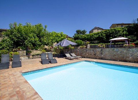 Tucked away in the hills between Arezzo and Siena, near the Renaissance town of Monte San Savino (4 km), lies this spacious and comfortably furnished vacation home in a small wood. From almost everywhere you have a view and exit to terraces and outdoors and countless are the possibilities to enjoy the property: On the terrace, in the shade of the pine trees, under the roof of the pool house or directly under the warm sun of the south - everywhere you are undisturbed; whether you swim in the large pool, sunbathe, barbecue, play billiards, browse or even just take in the beautiful view over the Chiana Valley. If you don't feel like cooking, you can dine in the nearby ristorante. Air conditioning in the three bedrooms upstairs. Free of charge: Three bicycles and a treadmill. In addition, numerous excursion destinations are available from here: Siena, Arezzo, Cortona and Lake Trasimeno.