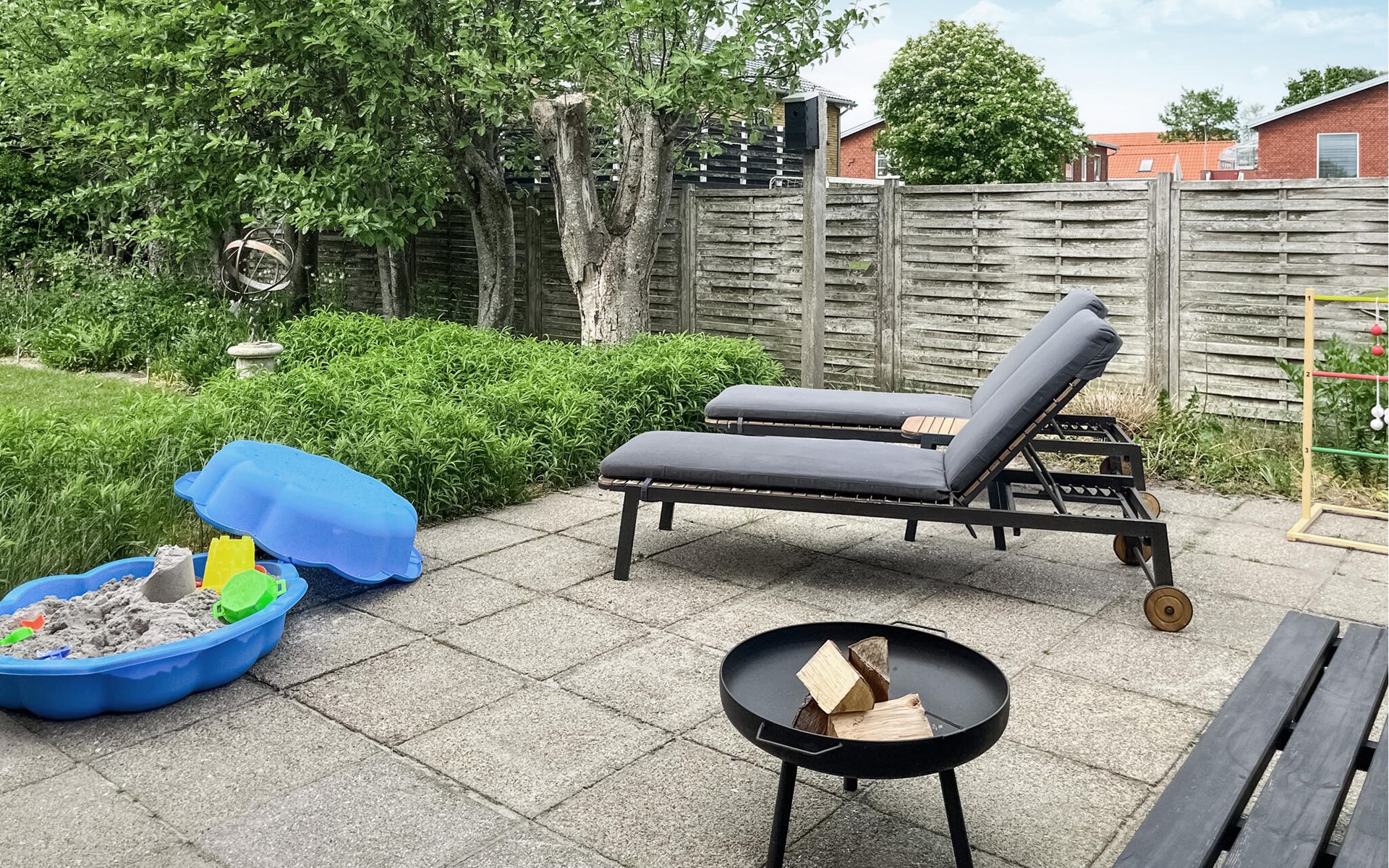 The sheltered garden attracts the whole family outdoors with a variety of activities. Let the children play football or dig in the sandpit, play a game of boules, relax on the sun lounger or chat in the lounge. You can fire up the barbecue on the terrace and enjoy wonderful summer evenings.
