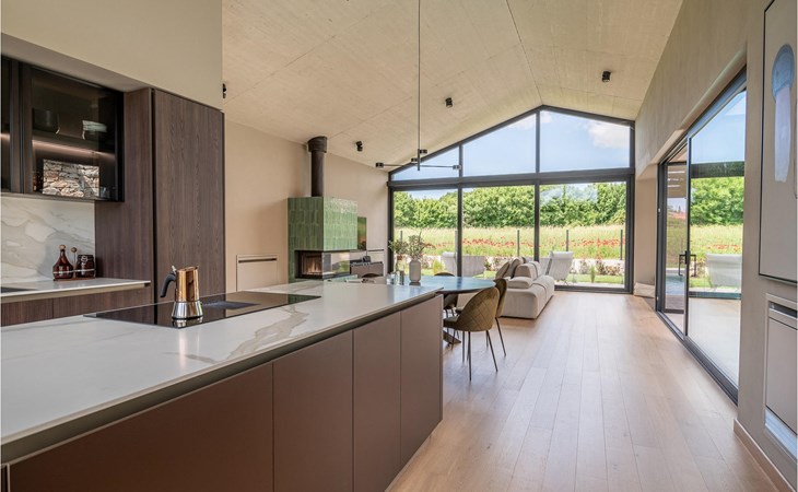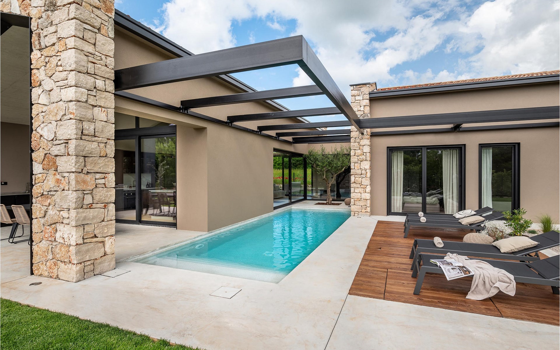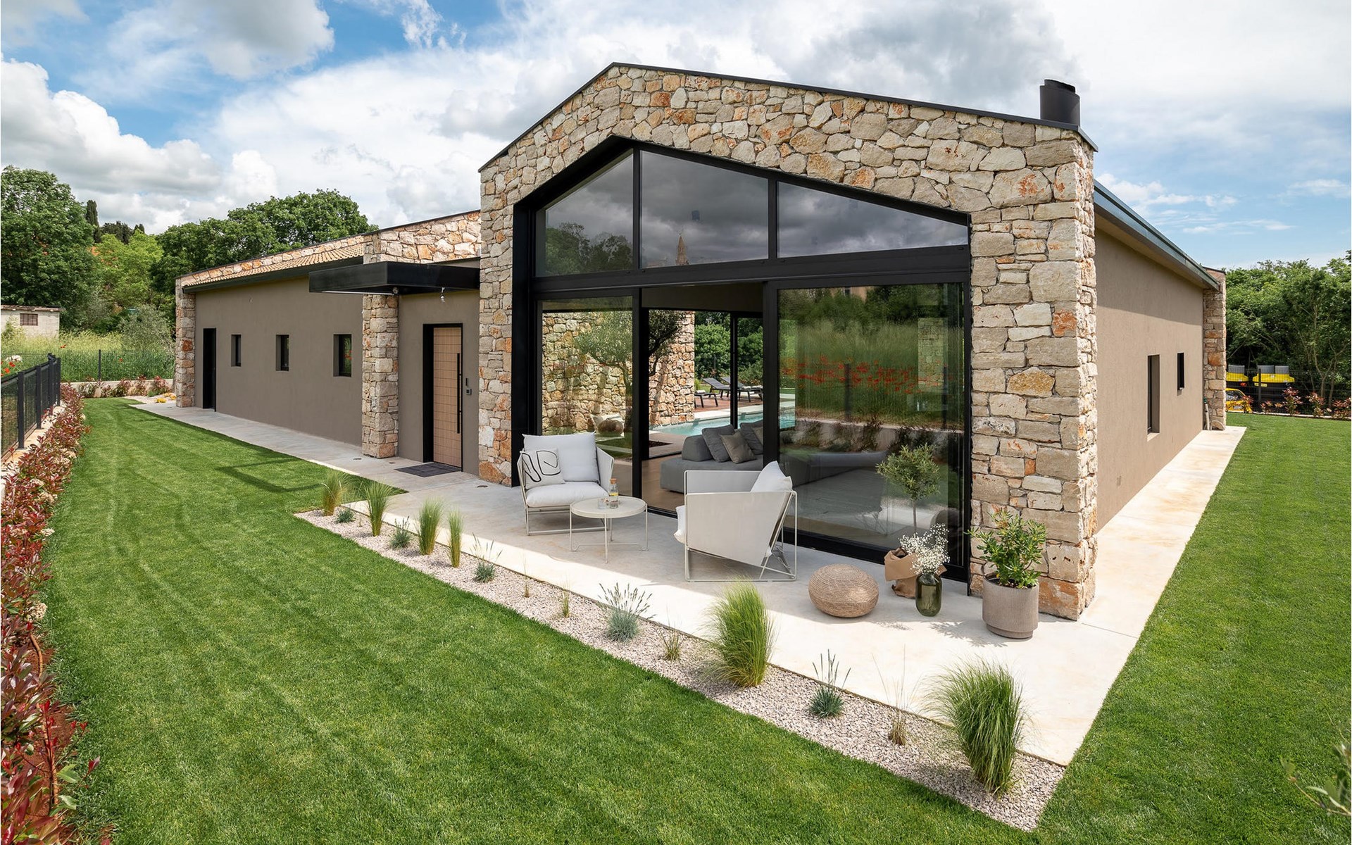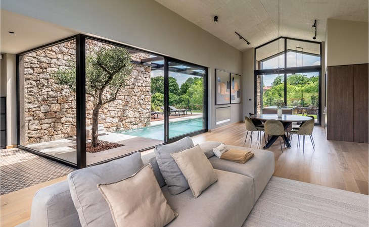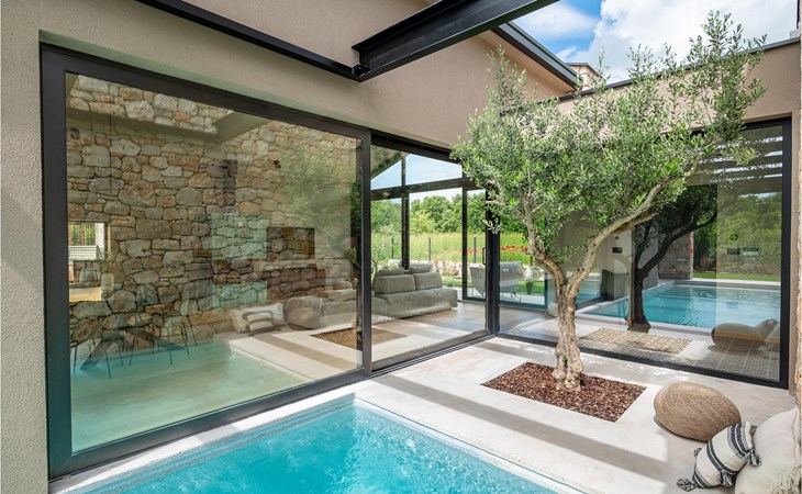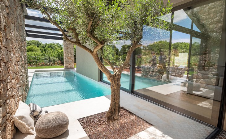 The luxury villa Silente is located in Istria, in the small stone town of Bale. This place bears the title of one of the most beautiful jewels of Istria and is located on the west coast of Istria. Istria is a well-known tourist destination for domestic and foreign guests who have decided to spend a wonderful vacation in peace and quiet while exploring historical sights and natural beauties. If you want to treat yourself and your family to an unforgettable vacation, now is the time! Villa Silente will delight you at first sight thanks to its wonderful contemporary architectural style. It was built in 2023 and offers a living area of 200 m2. The total area of the property is 874 m2. It is 7.7 km to the clean Adriatic Sea, which is not far as you are sure to arrive by car. You should definitely not miss a visit to the stone beach of Colone, where you will have as much fun as your heart desires in your favorite company. It has two beautifully furnished bedrooms with double beds (160 x 200). The villa also has two bathrooms with shower cubicles. The living room is really something special, it contains a sofa, a coffee table and a TV. There is also a romantic fireplace and right next to the living room there is a direct exit to the outdoor terrace with seating. You will certainly spend the morning hours there drinking coffee and reading your favorite book. A dining room with dining table and a modern and fully equipped kitchen are just part of the luxury that awaits you! The outdoor terrace offers the best: refreshment on hot summer days in a heated pool of 27 m² and 1.4 meters deep. There are 4 sun loungers on the lawn for you to rest and relax. You can use a barbecue, a washing machine and an iron. A high chair and a baby crib are available for children. Additional services offered by prior arrangement and for a fee are: Cook, babysitter, cleaner, gardener, transfer from the airport and private excursions. This historic stone town is situated on a hill and is surrounded by olive groves and vineyards. The picturesque Istrian medieval town is only 13 kilometers from Rovinj and 20 kilometers from Pula. These towns are also worth visiting and exploring. Taste the delicious gastronomic offer in the restaurants and enjoy like a king! Welcome to the beautiful Villa Silente!