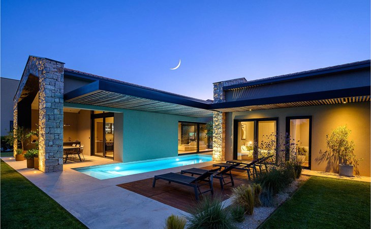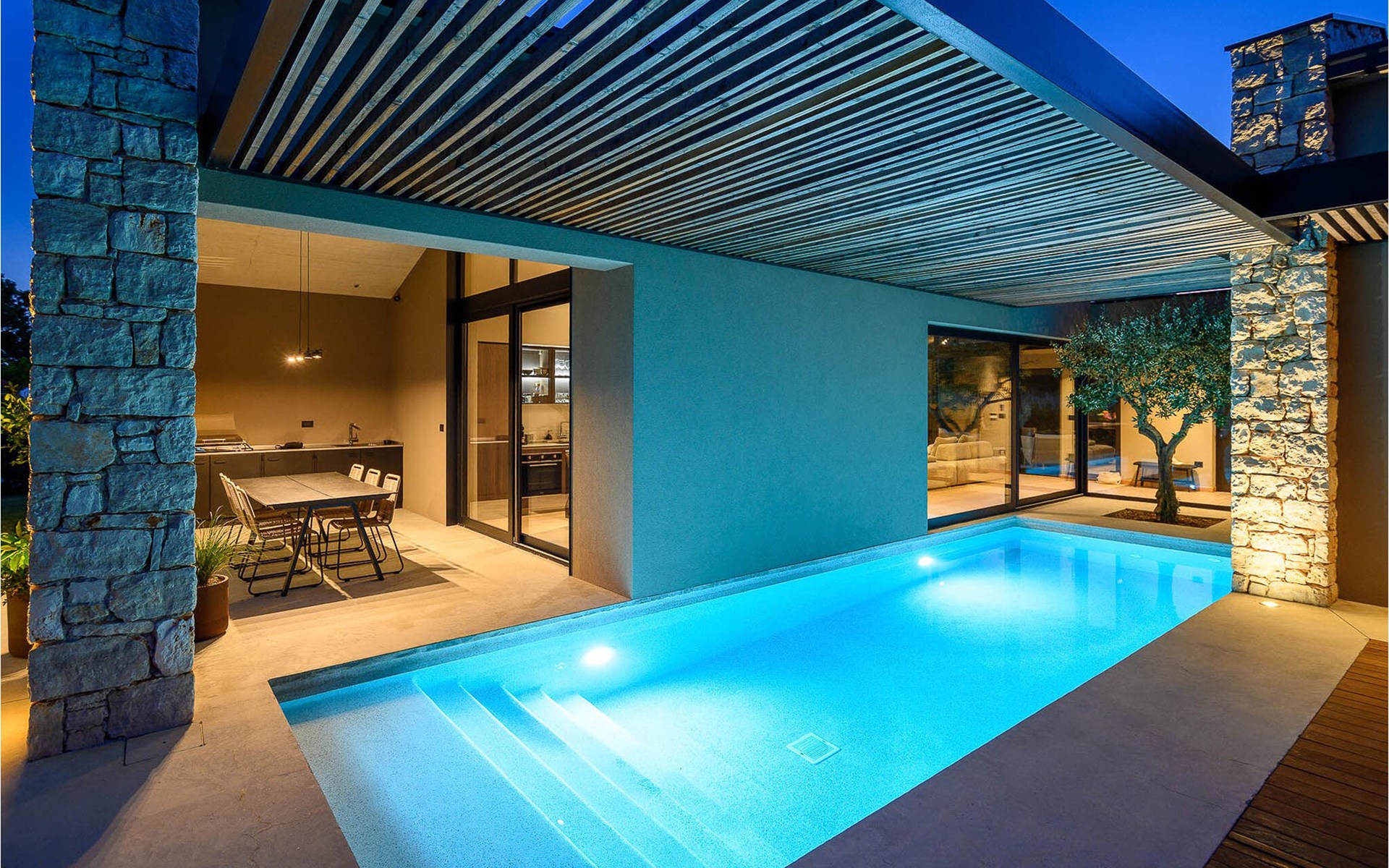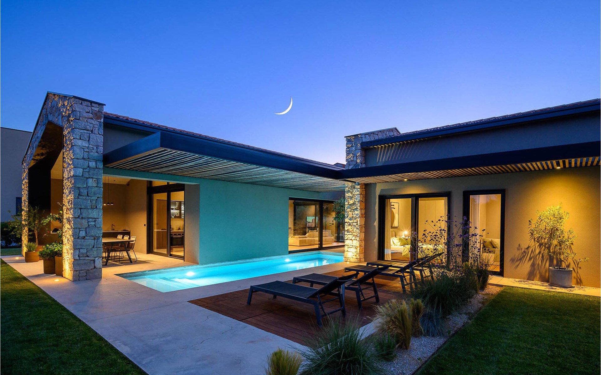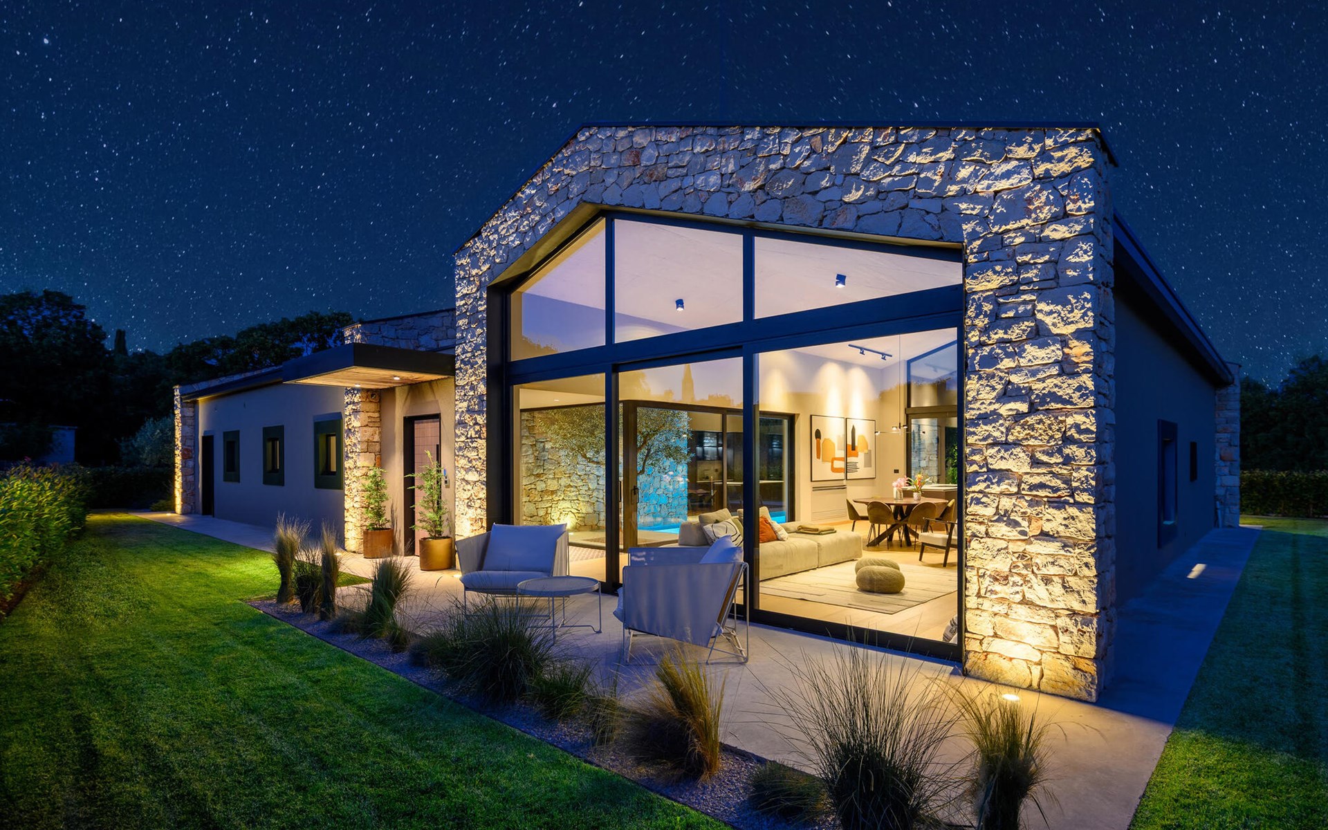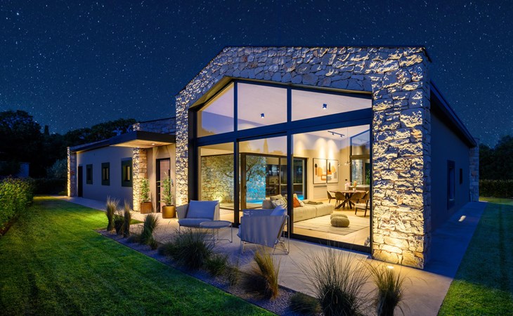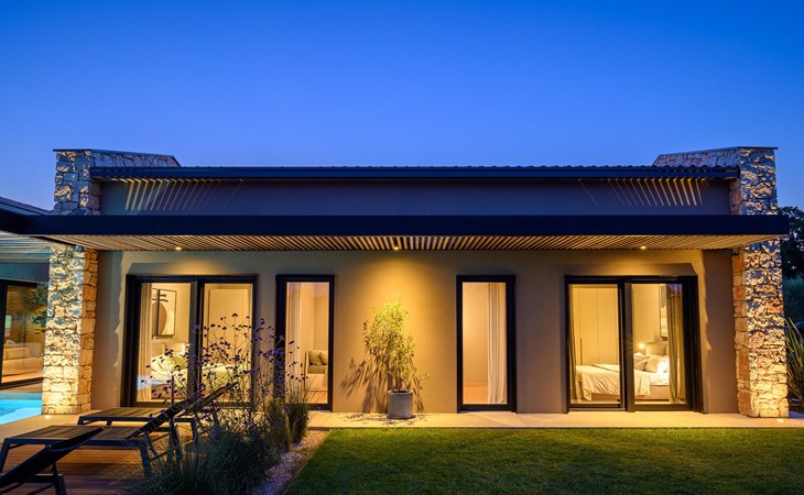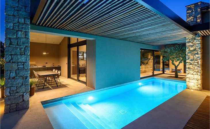 The luxury villa Silente is located in Istria, in the small stone town of Bale. This place bears the title of one of the most beautiful jewels of Istria and is located on the west coast of Istria. Istria is a well-known tourist destination for domestic and foreign guests who have decided to spend a wonderful vacation in peace and quiet while exploring historical sights and natural beauties. If you want to treat yourself and your family to an unforgettable vacation, now is the time! Villa Silente will delight you at first sight thanks to its wonderful contemporary architectural style. It was built in 2023 and offers a living area of 200 m2. The total area of the property is 874 m2. It is 7.7 km to the clean Adriatic Sea, which is not far as you are sure to arrive by car. You should definitely not miss a visit to the stone beach of Colone, where you will have as much fun as your heart desires in your favorite company. It has two beautifully furnished bedrooms with double beds (160 x 200). The villa also has two bathrooms with shower cubicles. The living room is really something special, it contains a sofa, a coffee table and a TV. There is also a romantic fireplace and right next to the living room there is a direct exit to the outdoor terrace with seating. You will certainly spend the morning hours there drinking coffee and reading your favorite book. A dining room with dining table and a modern and fully equipped kitchen are just part of the luxury that awaits you! The outdoor terrace offers the best: refreshment on hot summer days in a heated pool of 27 m² and 1.4 meters deep. There are 4 sun loungers on the lawn for you to rest and relax. You can use a barbecue, a washing machine and an iron. A high chair and a baby crib are available for children. Additional services offered by prior arrangement and for a fee are: Cook, babysitter, cleaner, gardener, transfer from the airport and private excursions. This historic stone town is situated on a hill and is surrounded by olive groves and vineyards. The picturesque Istrian medieval town is only 13 kilometers from Rovinj and 20 kilometers from Pula. These towns are also worth visiting and exploring. Taste the delicious gastronomic offer in the restaurants and enjoy like a king! Welcome to the beautiful Villa Silente!
