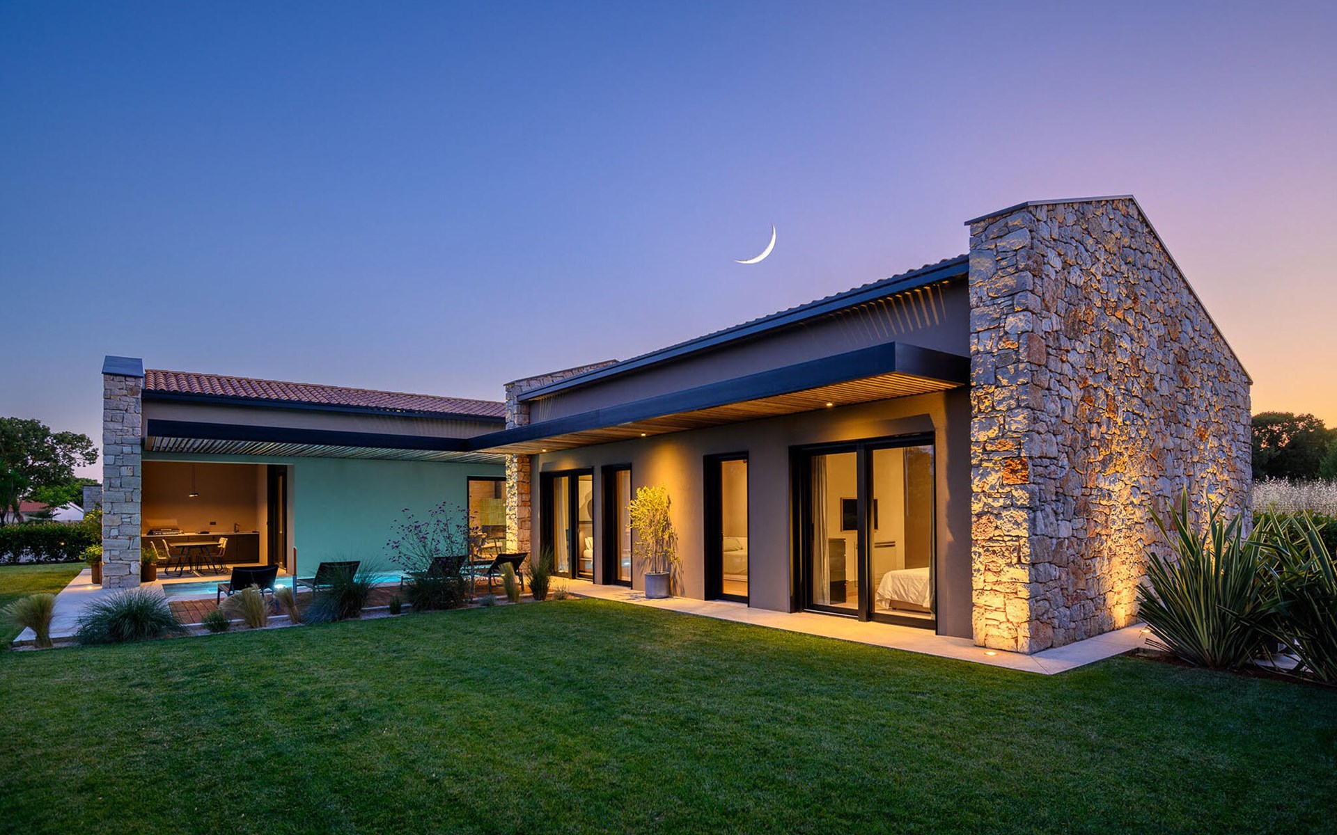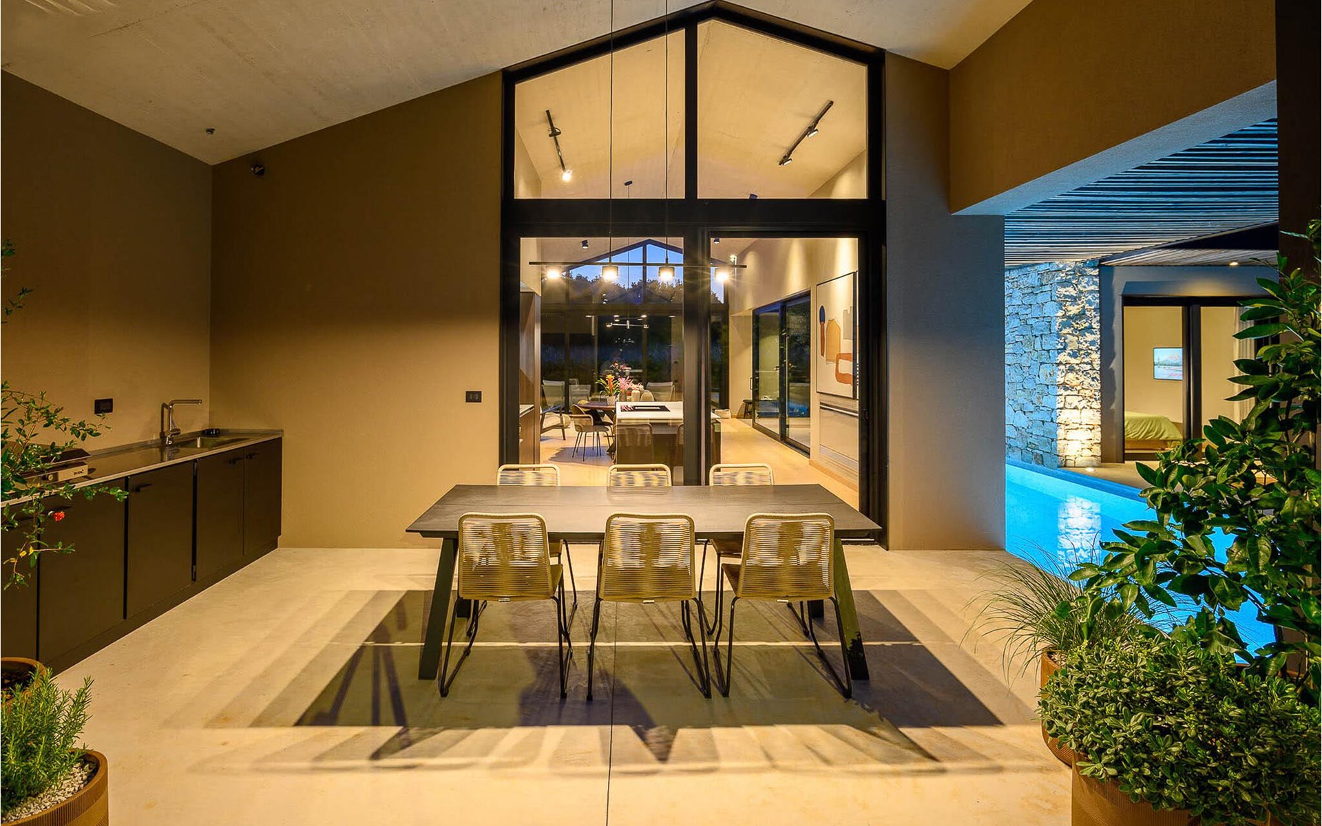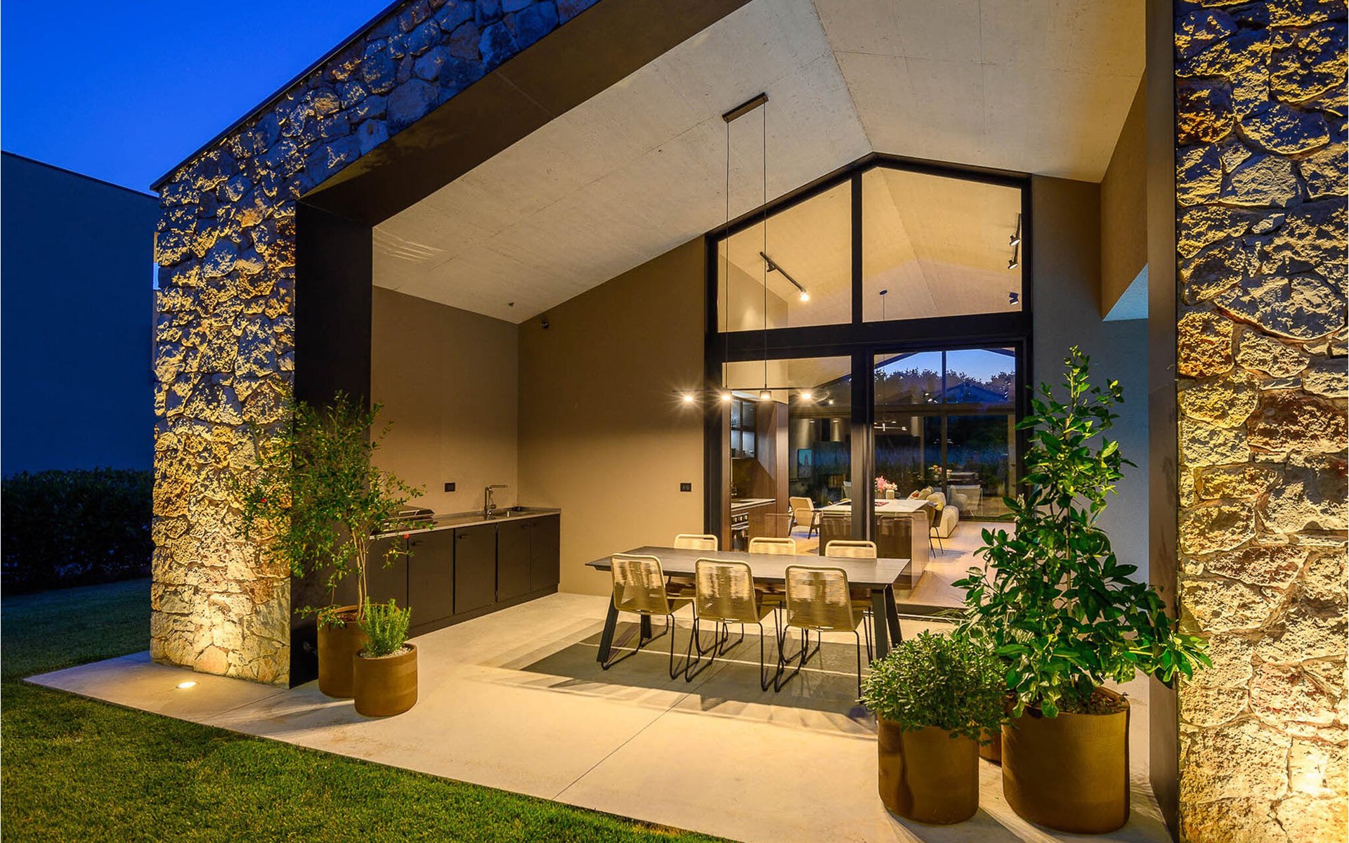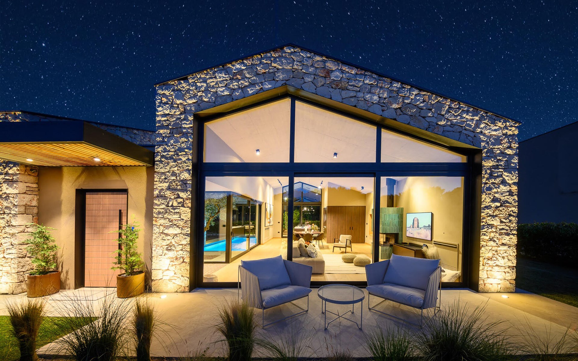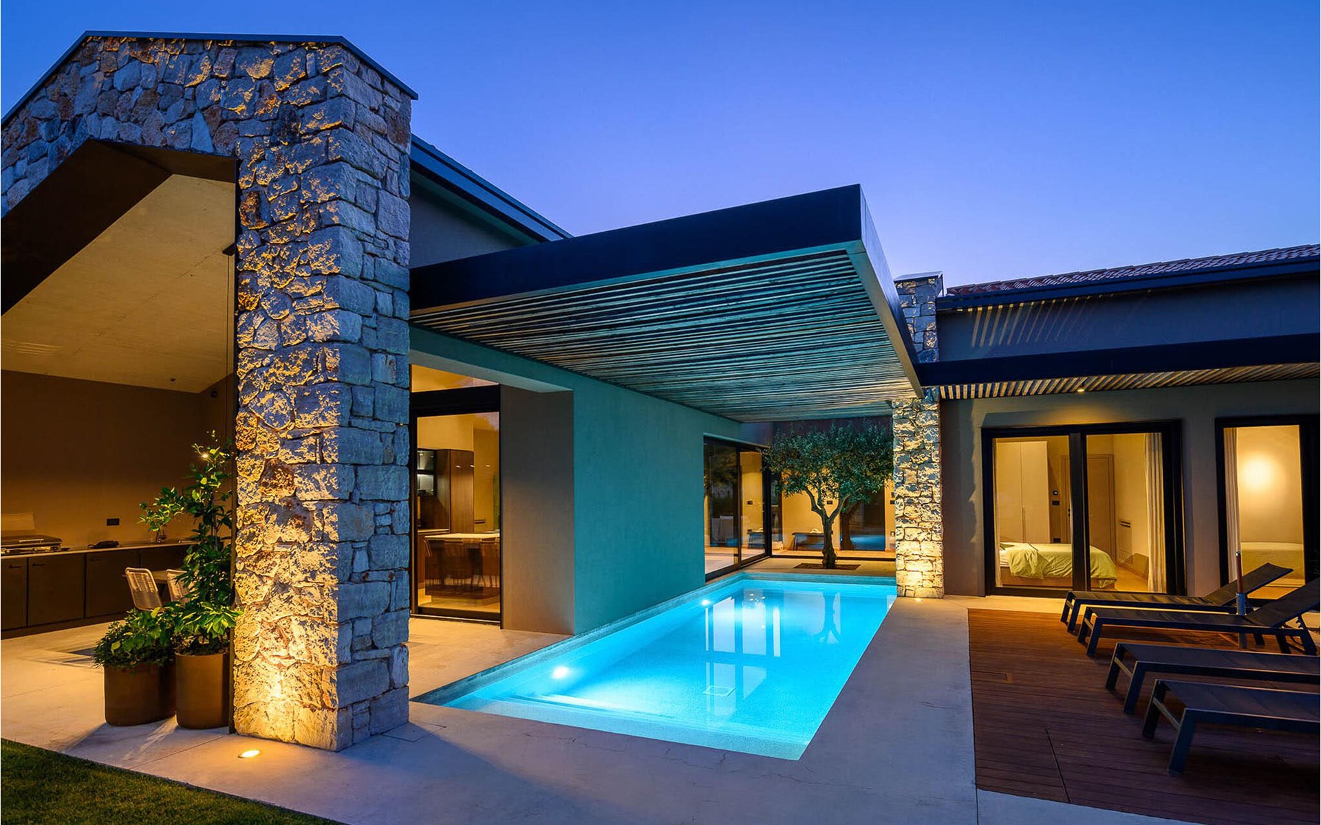 The luxury villa Silente is located in Istria, in the small stone town of Bale. This place bears the title of one of the most beautiful jewels of Istria and is located on the west coast of Istria. Istria is a well-known tourist destination for domestic and foreign guests who have decided to spend a wonderful vacation in peace and quiet while exploring historical sights and natural beauties. If you want to treat yourself and your family to an unforgettable vacation, now is the time! Villa Silente will delight you at first sight thanks to its wonderful contemporary architectural style. It was built in 2023 and offers a living area of 200 m2. The total area of the property is 874 m2. It is 7.7 km to the clean Adriatic Sea, which is not far as you are sure to arrive by car. You should definitely not miss a visit to the stone beach of Colone, where you will have as much fun as your heart desires in your favorite company. It has two beautifully furnished bedrooms with double beds (160 x 200). The villa also has two bathrooms with shower cubicles. The living room is really something special, it contains a sofa, a coffee table and a TV. There is also a romantic fireplace and right next to the living room there is a direct exit to the outdoor terrace with seating. You will certainly spend the morning hours there drinking coffee and reading your favorite book. A dining room with dining table and a modern and fully equipped kitchen are just part of the luxury that awaits you! The outdoor terrace offers the best: refreshment on hot summer days in a heated pool of 27 m² and 1.4 meters deep. There are 4 sun loungers on the lawn for you to rest and relax. You can use a barbecue, a washing machine and an iron. A high chair and a baby crib are available for children. Additional services offered by prior arrangement and for a fee are: Cook, babysitter, cleaner, gardener, transfer from the airport and private excursions. This historic stone town is situated on a hill and is surrounded by olive groves and vineyards. The picturesque Istrian medieval town is only 13 kilometers from Rovinj and 20 kilometers from Pula. These towns are also worth visiting and exploring. Taste the delicious gastronomic offer in the restaurants and enjoy like a king! Welcome to the beautiful Villa Silente!