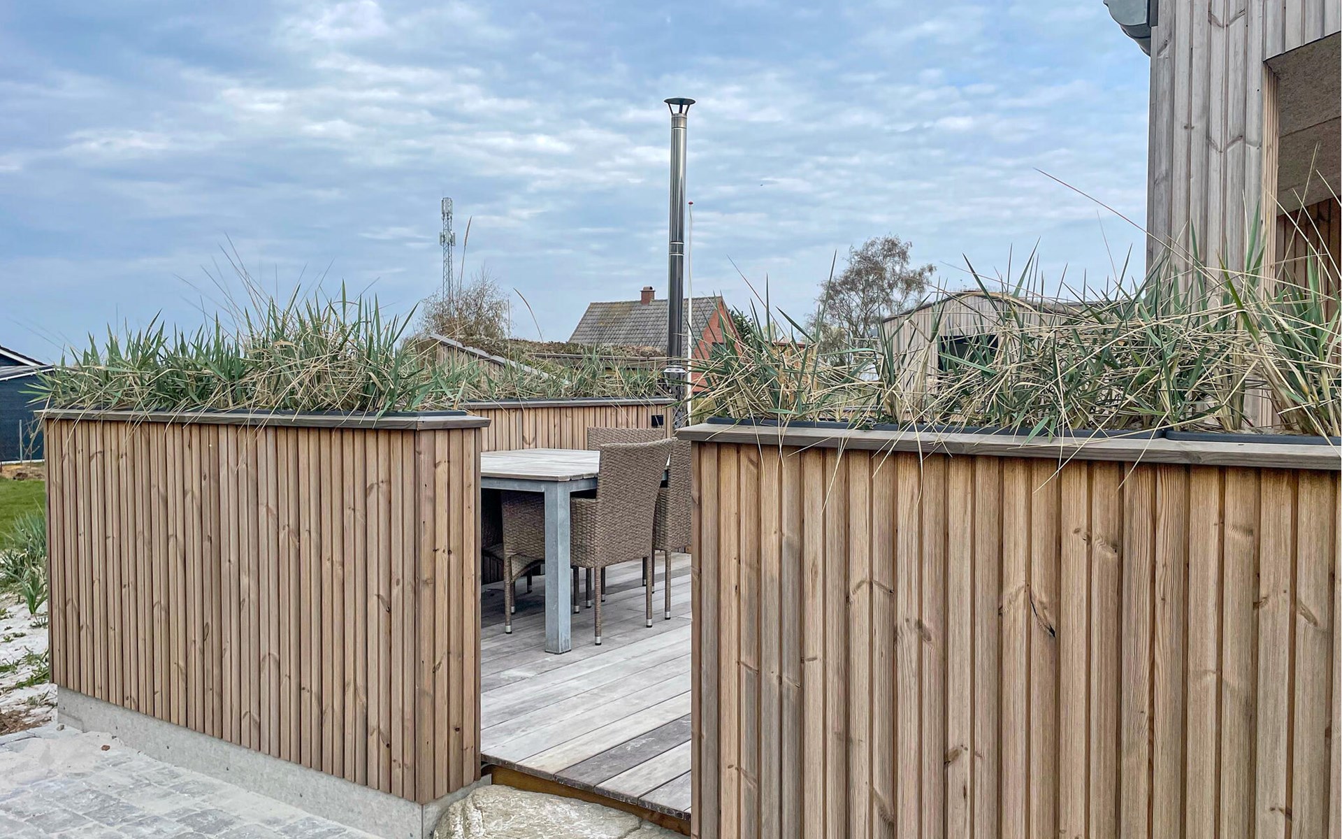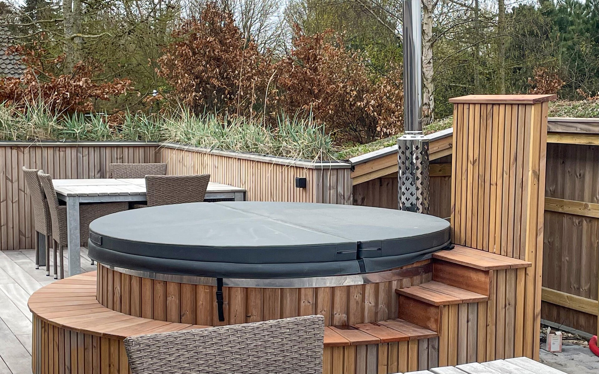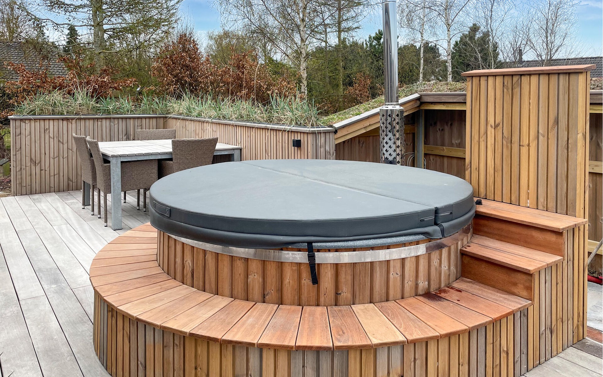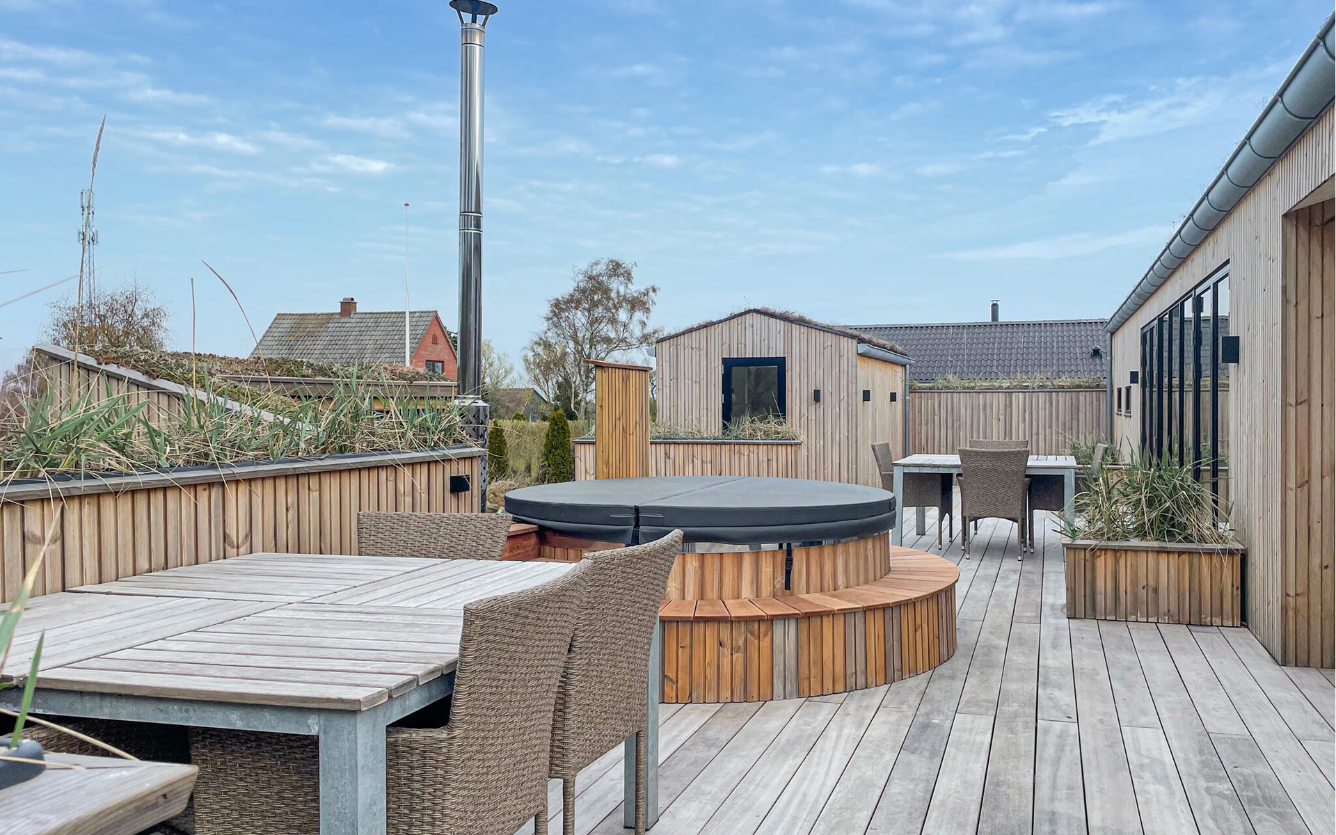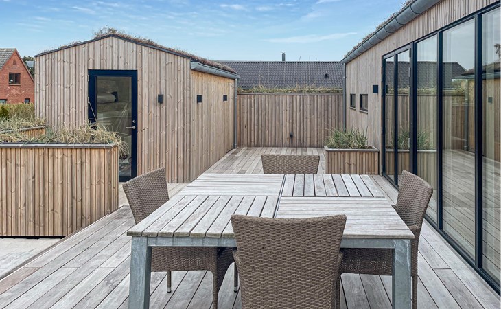 Walk barefoot across the wooden terrace and treat yourself to some time out in the Finnish wooden bath or indulge in the soothing warmth of the sauna. The spacious lawn offers plenty of opportunities for young and old to play and run around together.