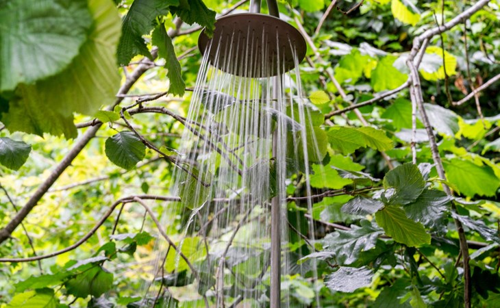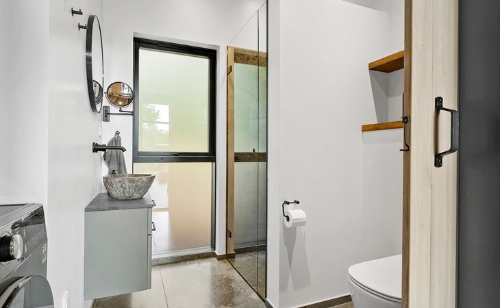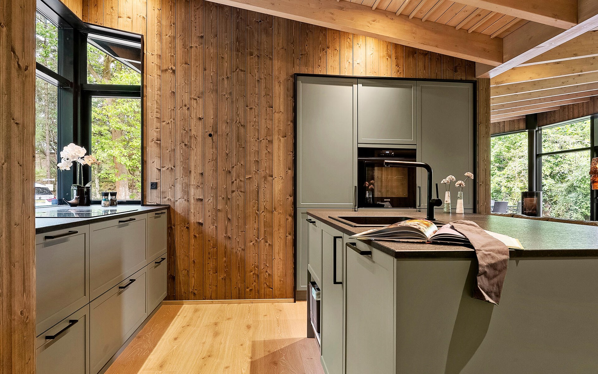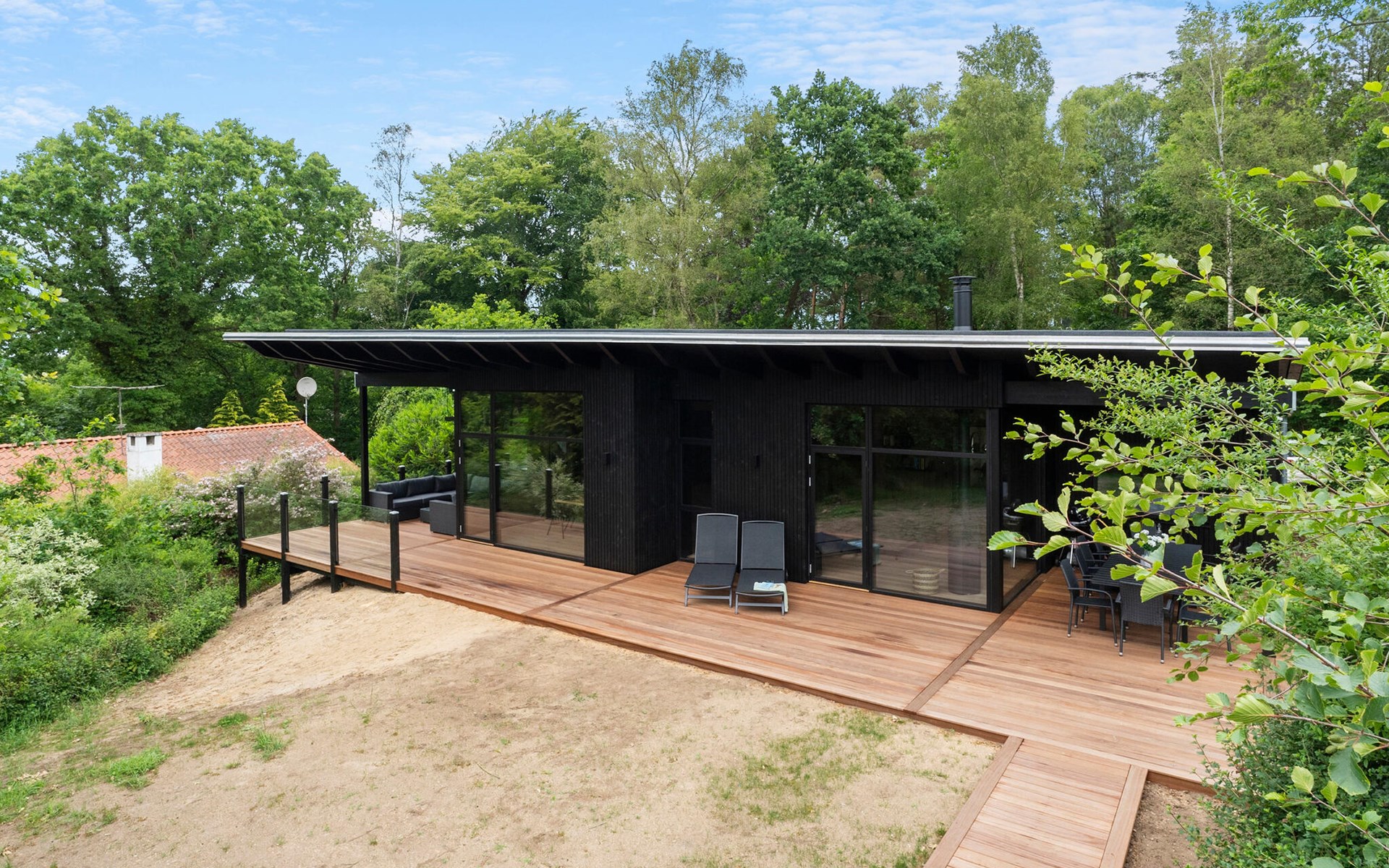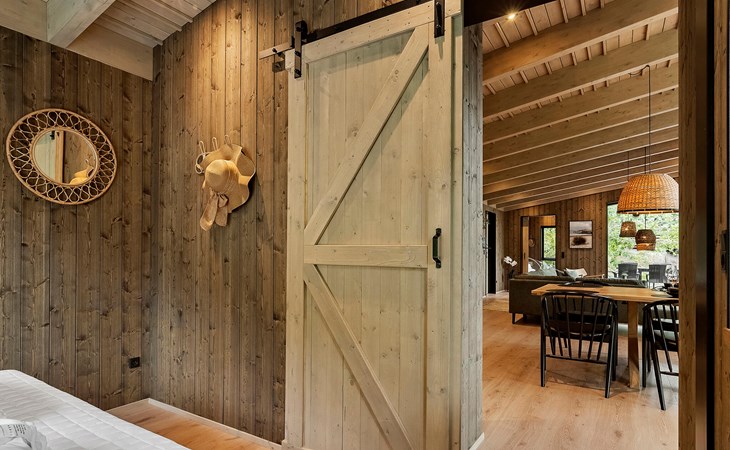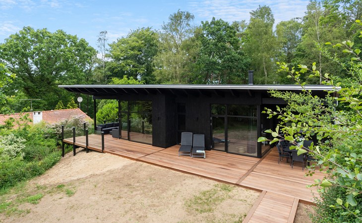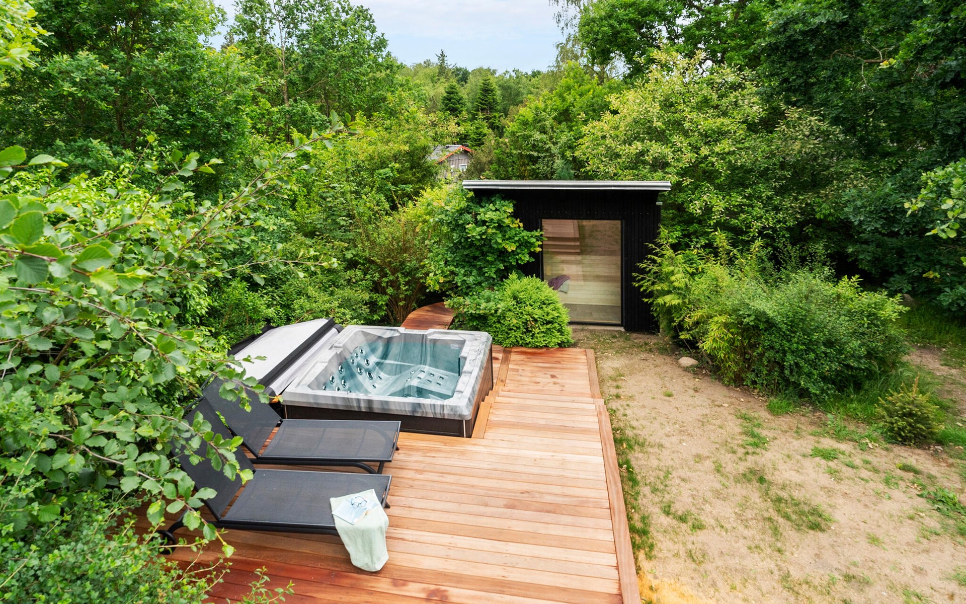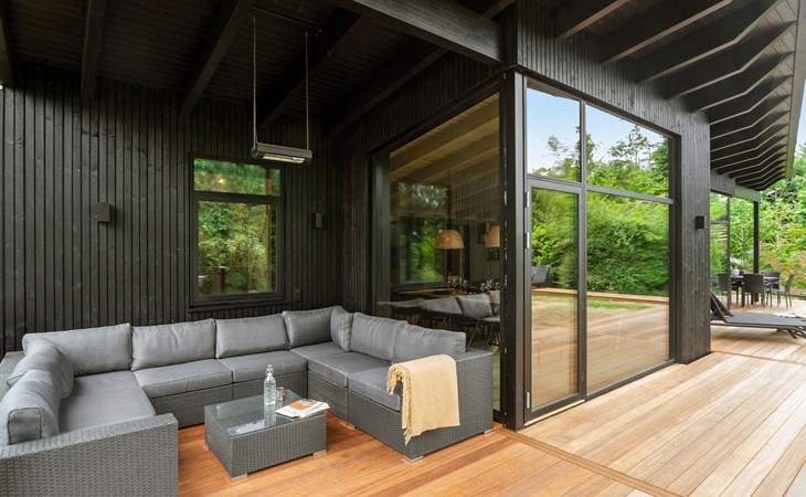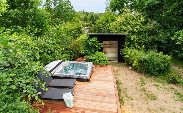 Enjoy the spacious terrace area with various seating options, an open-air hot tub and an outdoor shower surrounded by greenery. Relax on the comfortable sun loungers with a view of the lush greenery. The sheltered wooden terrace surrounds the house and creates a pleasant connection between inside and outside.