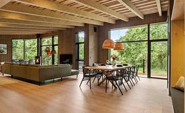 Your exclusive holiday home offers ideal conditions for a relaxing break in the midst of beautiful nature. The surrounding area of Hvidbjerg with its forests, dunes and sweeping sea views invites you to enjoy a slow-paced holiday away from everyday life. The stylishly designed interior offers plenty of wood, large windows and an open feeling of space. Relax on the spacious sofa area by the wood-burning stove or gather around the long dining table with the whole family. Use the modern kitchen with kitchen island to cook together. The cosy wall niche is a wonderful place to read or snooze and relax in the sauna.