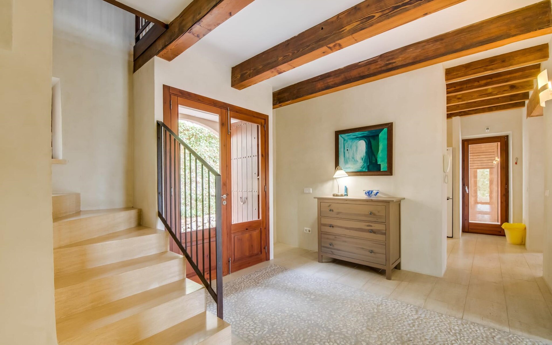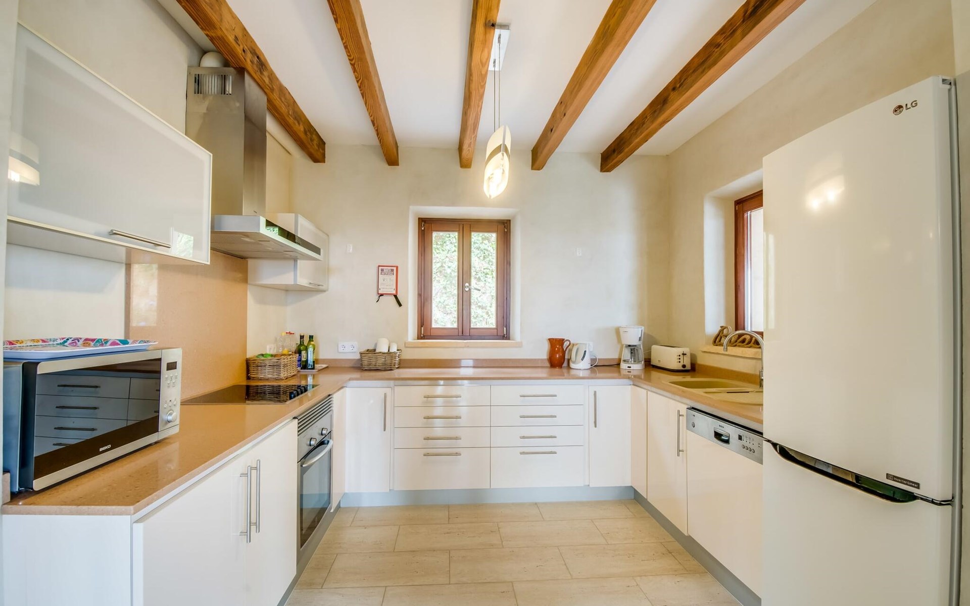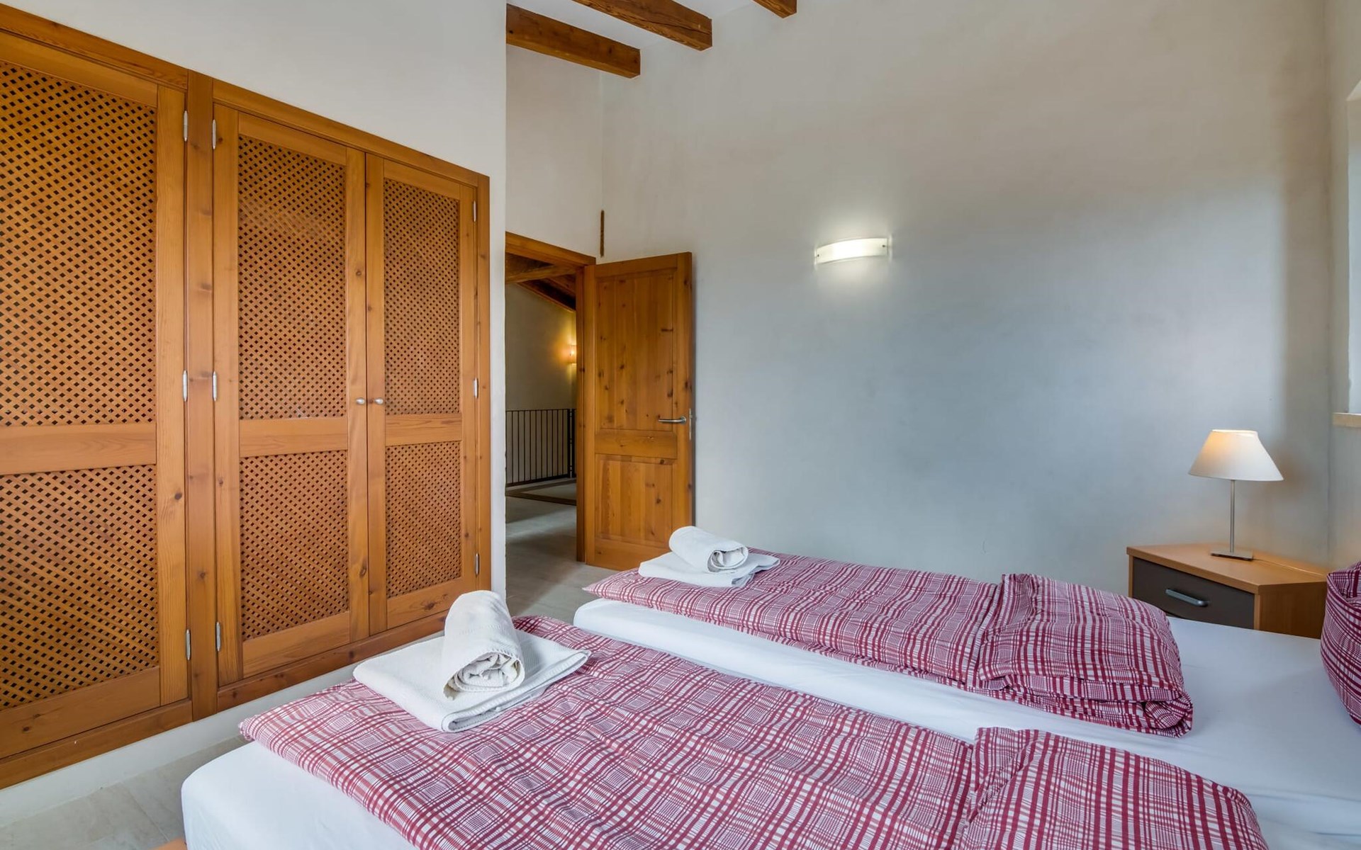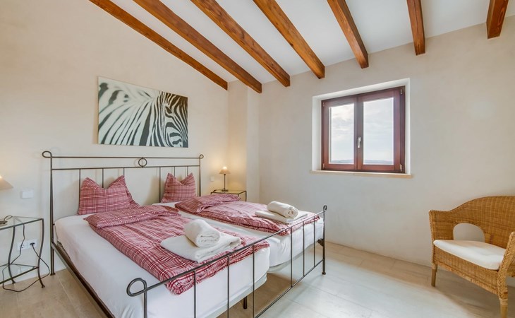 Upstairs there is a master bedroom with en-suite bathroom and two further bedrooms, each with two single beds, which share a stylish bathroom with walk-in shower. Natural materials, high ceilings and smooth plastered walls create a pleasant ambience.