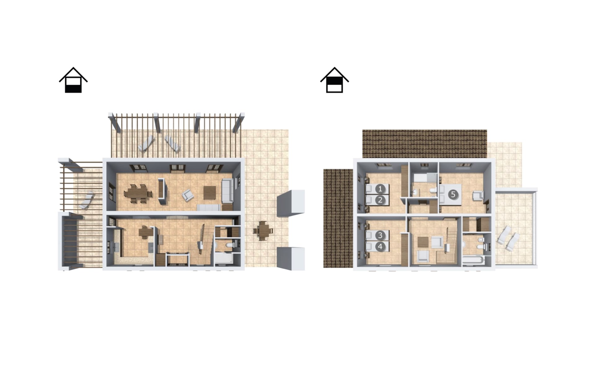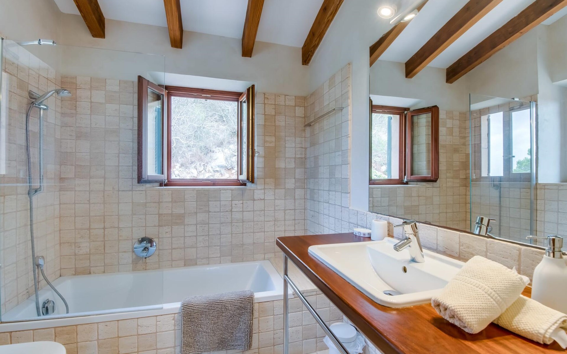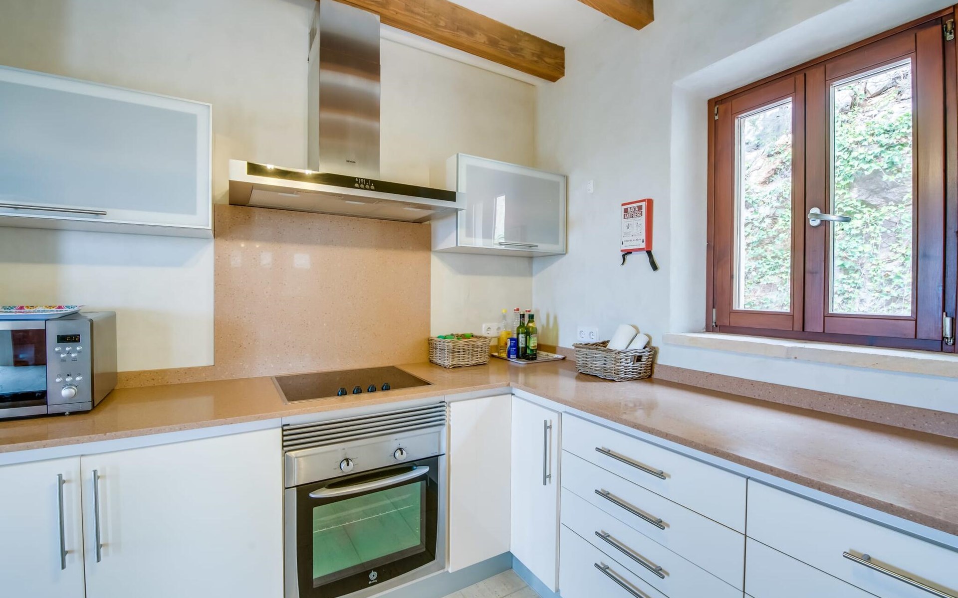 Upstairs there is a master bedroom with en-suite bathroom and two further bedrooms, each with two single beds, which share a stylish bathroom with walk-in shower. Natural materials, high ceilings and smooth plastered walls create a pleasant ambience.