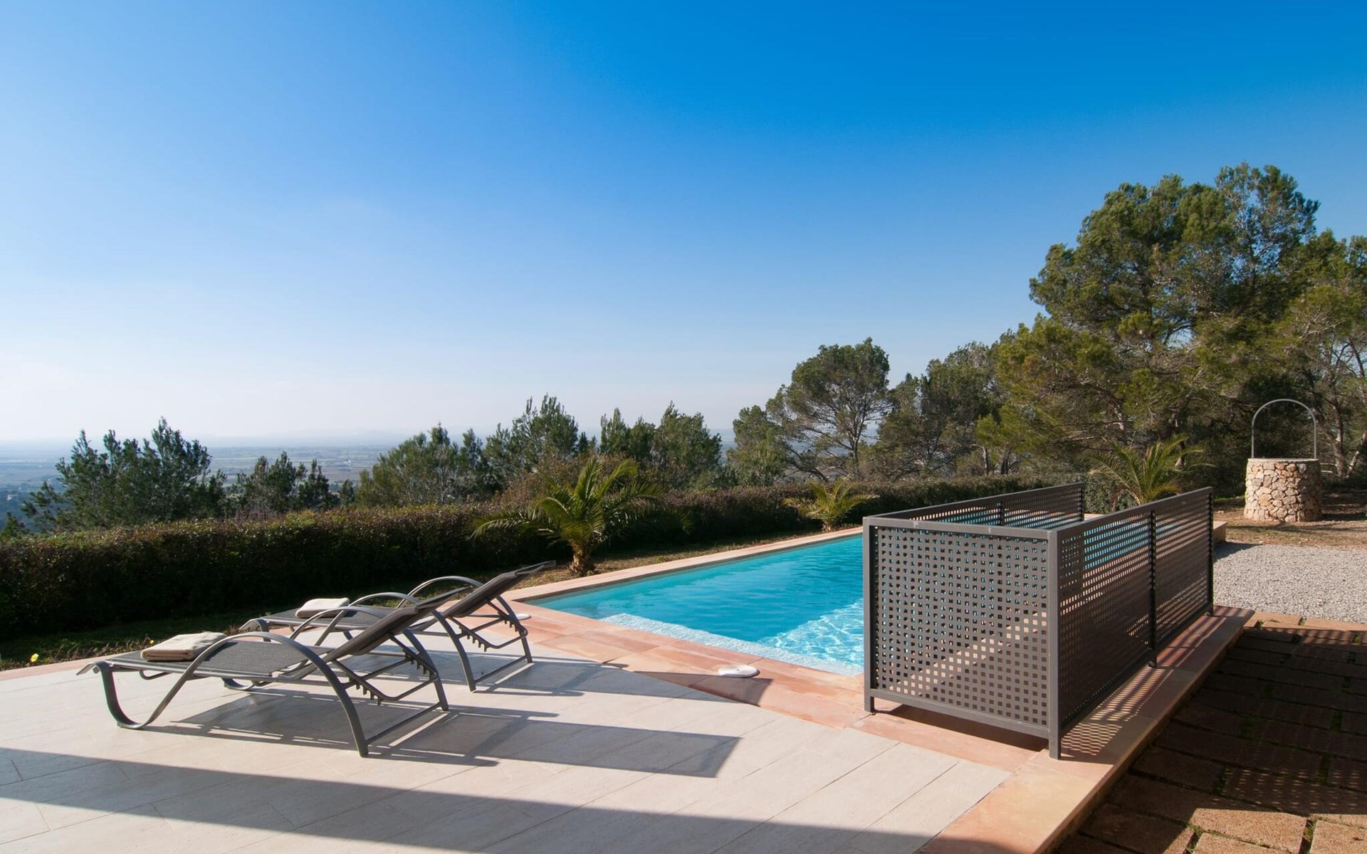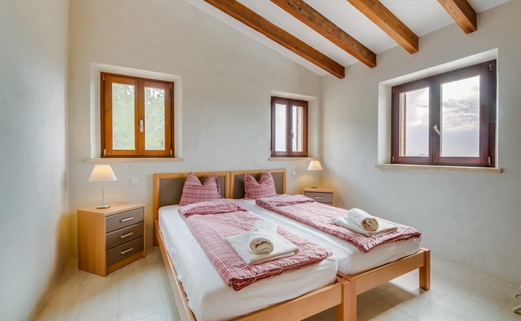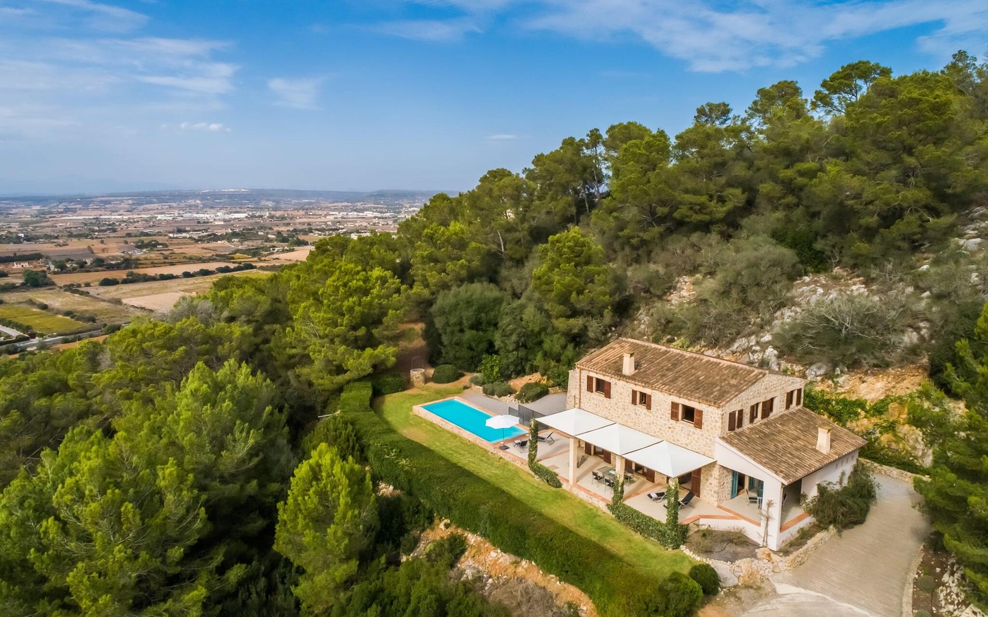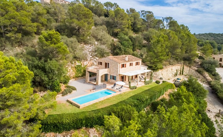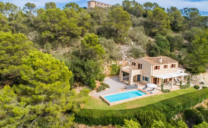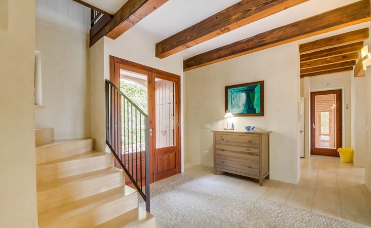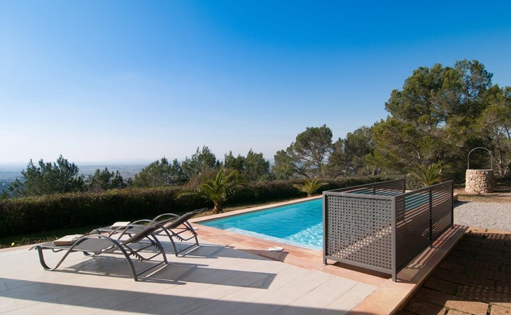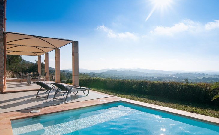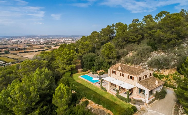 Welcome to "Lejania", a stylish and newly built villa located just 1 km from Manacor, Mallorca's third largest municipality. Situated on an 11,000 m² estate, this secluded retreat has been welcoming guests since 2013 and offers breathtaking views over the Plà de Mallorca, which stretches all the way to Puig Major. The natural and sustainable design of the villa blends seamlessly into the surroundings and creates a tranquil atmosphere for relaxation.