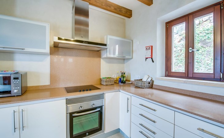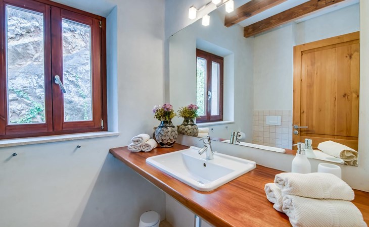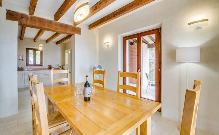 Enter the villa from different sides, where large wooden windows fill the ground floor with light. The open-plan communal spaces include a cosy living area with two comfortable sofas, a modern kitchen equipped with all the essentials and a rustic dining area that comfortably seats six people. The beautiful blue shutters help to regulate the temperature on warmer days.
