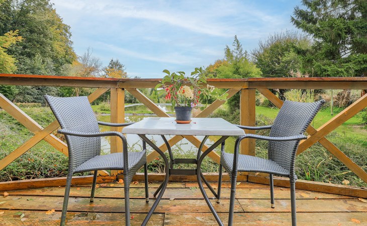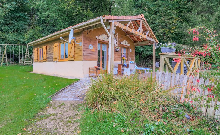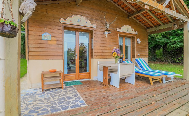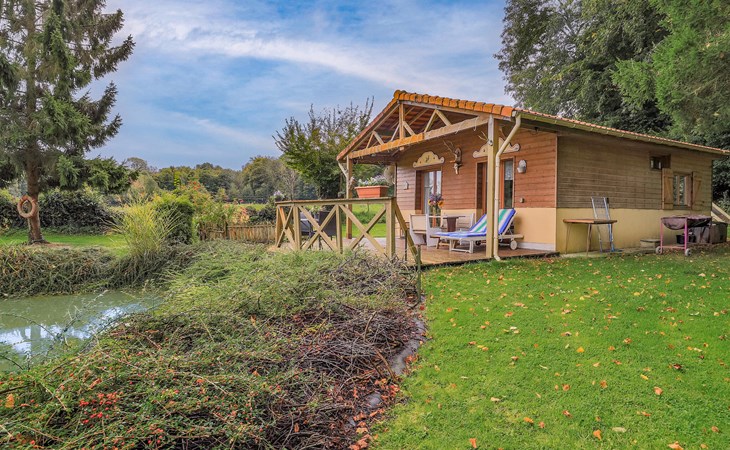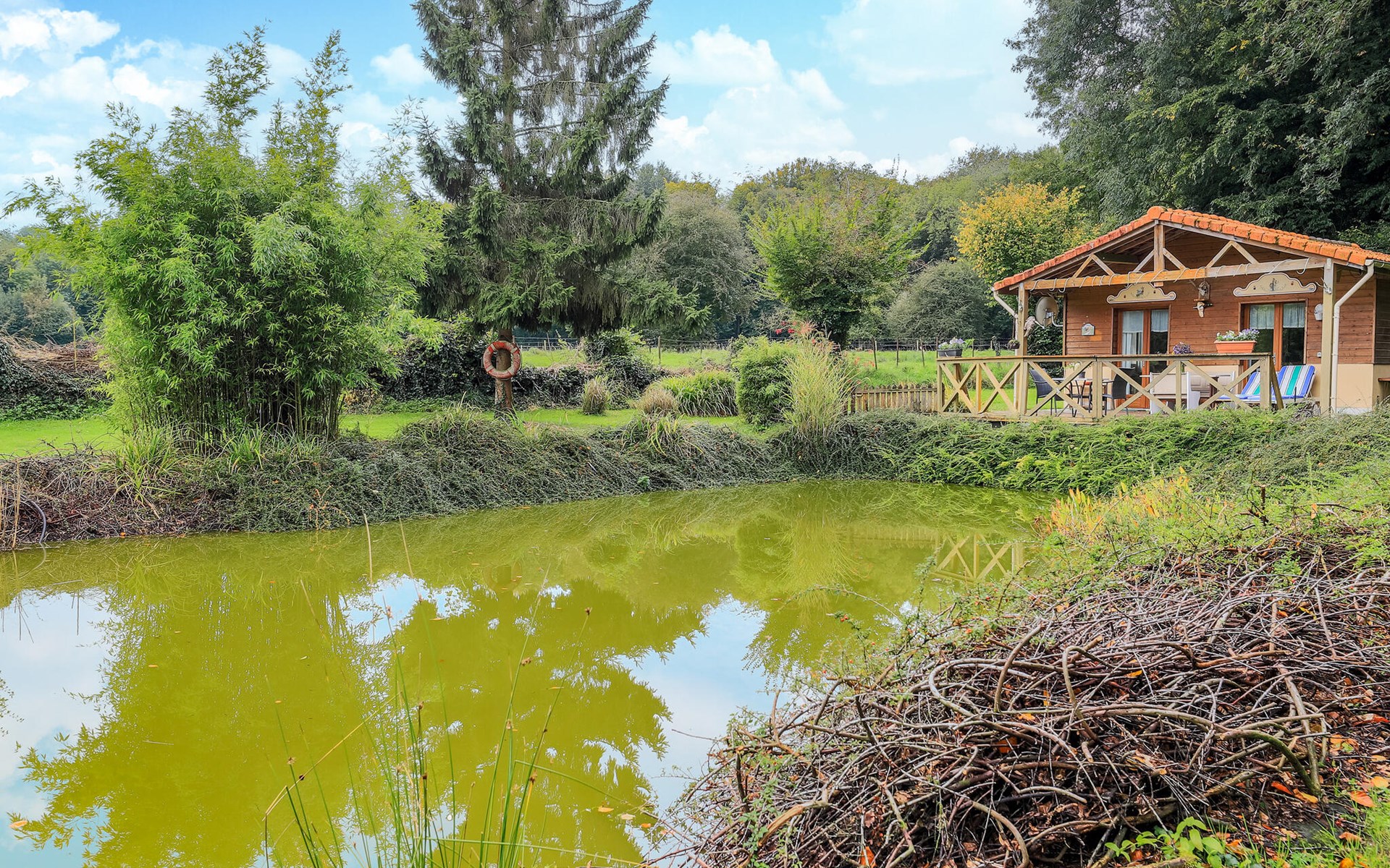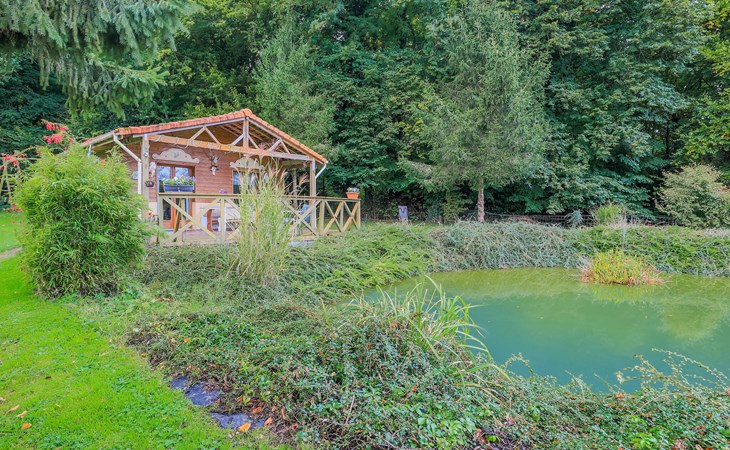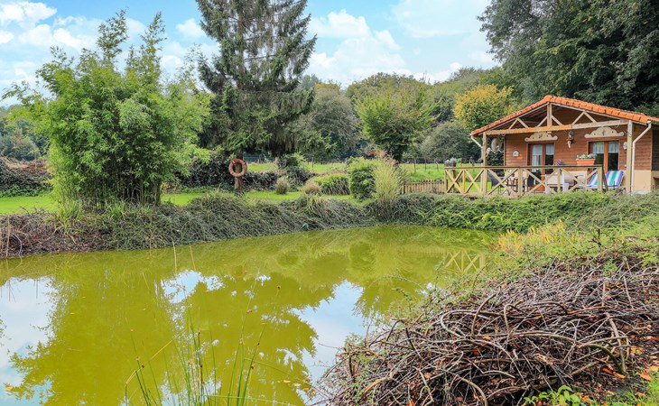 Relax in a quiet chalet with a wooden terrace and a view of the private pond.