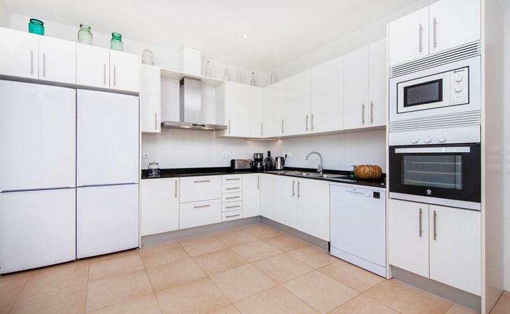 Inside, there are four double bedrooms, each with bright, modern furniture and comfortable beds. Two rooms have en-suite bathrooms, while the other two share a bathroom with an additional guest WC. The spacious living room with white sofa and TV invites you to relax, while the fully equipped kitchen makes cooking a pleasure. The owners are on hand to ensure that their guests have an unforgettable stay.
