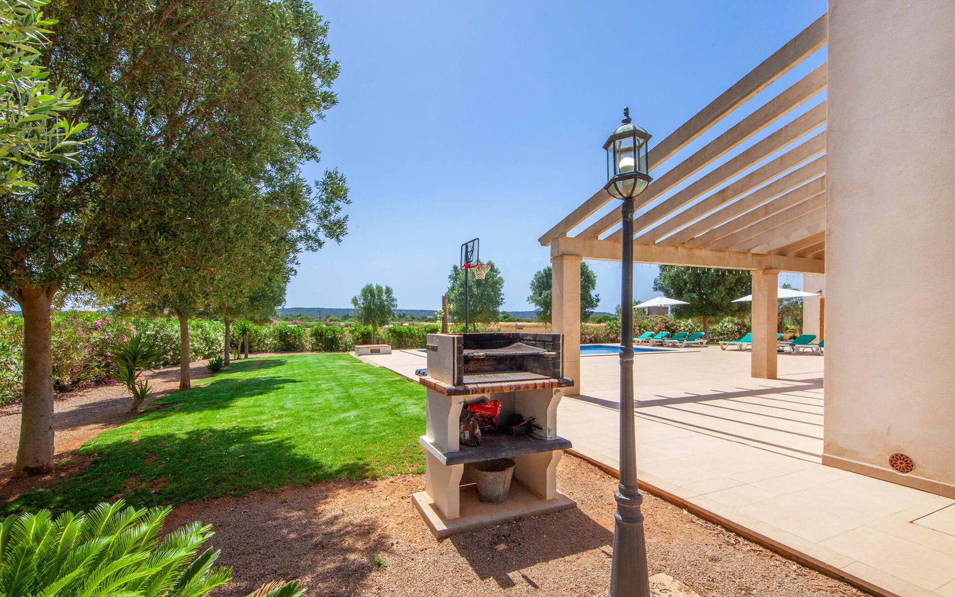 The L-shaped villa is surrounded by a lush garden with young trees growing into a bright future. The property is located in a tranquil landscape, typical of the south of the island, and offers sweeping views for you to enjoy. This is a place for those who appreciate the clean lines of minimalist design. The classic rectangular pool invites you to swim at any time, surrounded by comfortable sun loungers for relaxing after a swim. When the weather calls for it, fire up the barbecue for an evening feast. The covered terrace has two dining tables, ideal for larger groups.