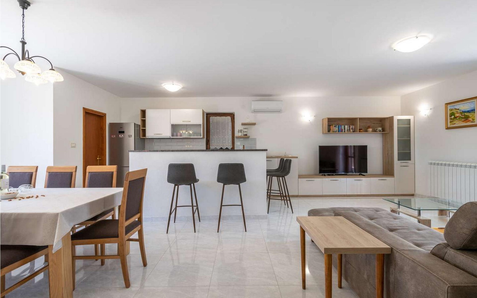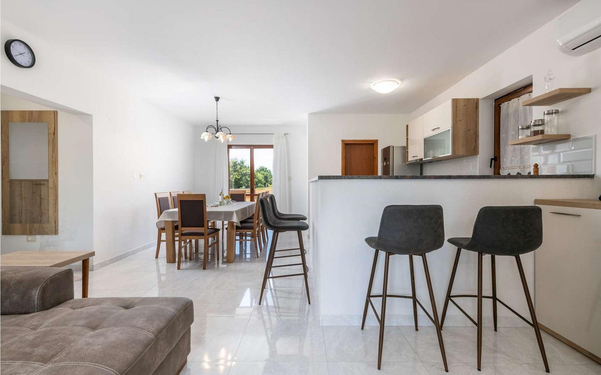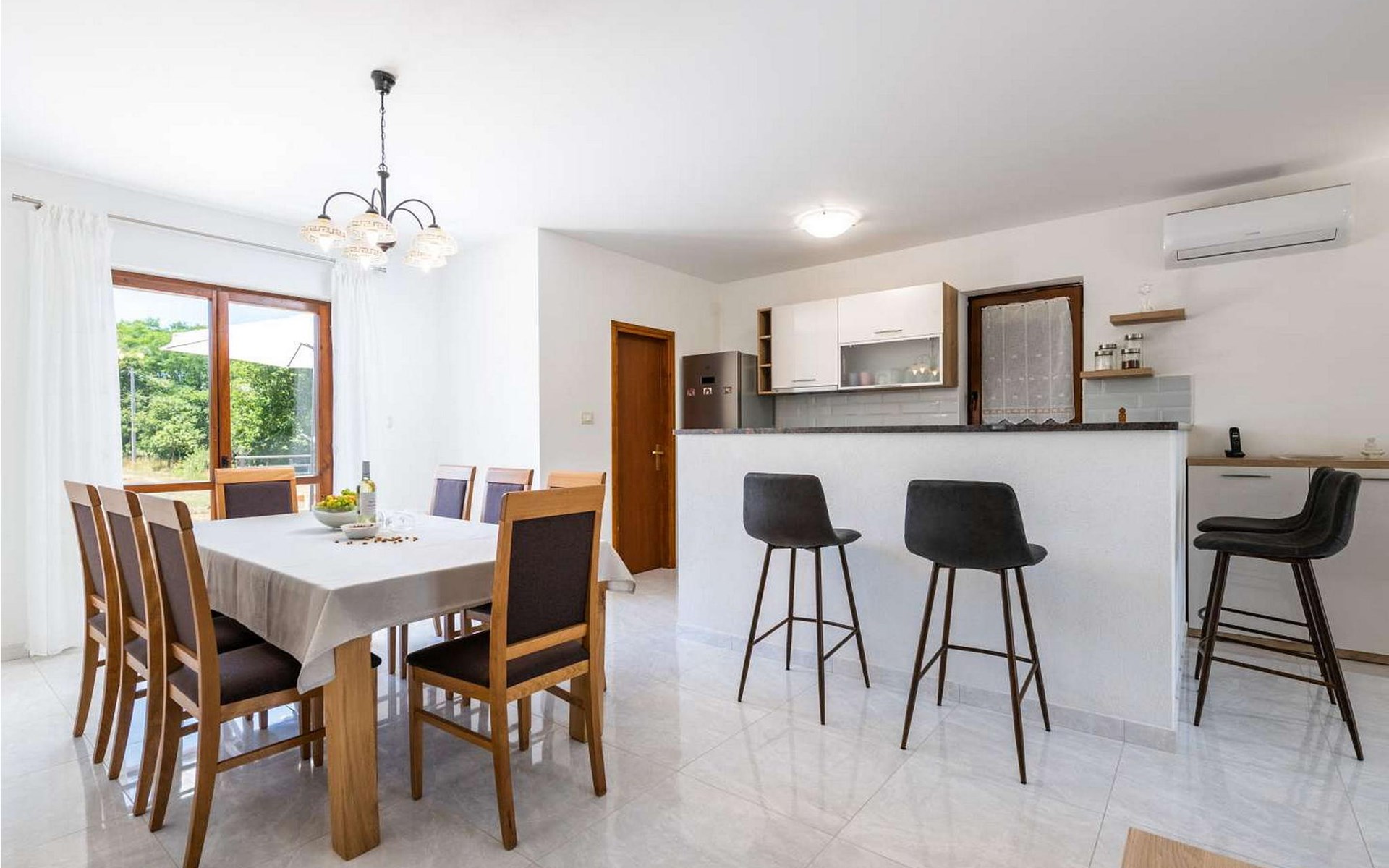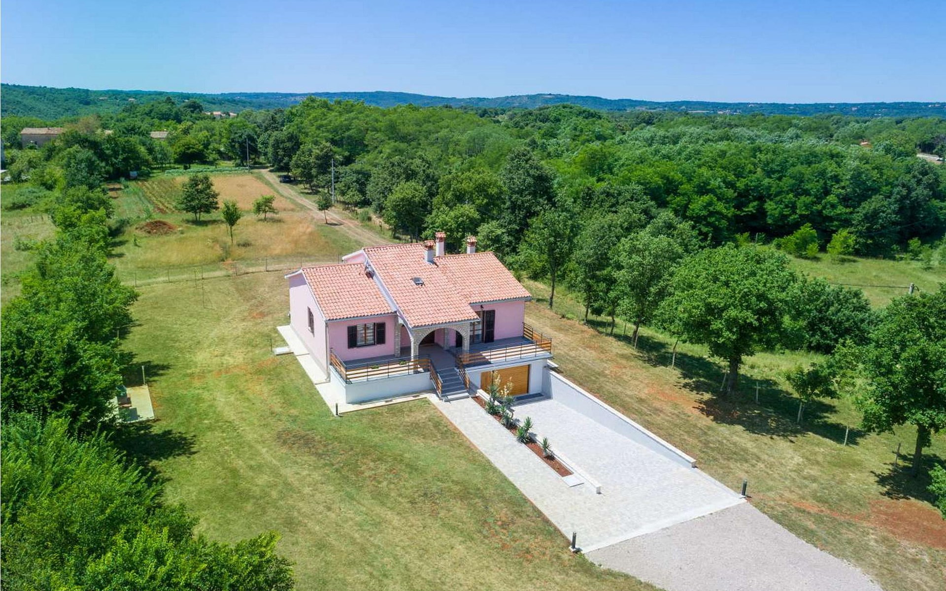 The tourist town Rabac with its beaches and varied gastronomic and sports facilities is 12 km away. On completely enclosed property it offers to the guests two terraces, sun loungers, barbecue, seating set, badminton/volleyball net and several parking spaces.