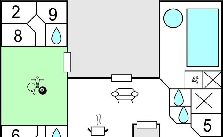In the pool area of the house there is a swimming pool with water slide and counter-current system for an extensive swimming workout. There is also a whirlpool for 6 people, as well as a sauna and a separate bathroom. In the large activity room you can play billiards, table tennis, darts, table soccer and PlayStation4. The bar offers ample facilities for mixing exciting drinks and serving cold beer and soft drinks from the fridge.