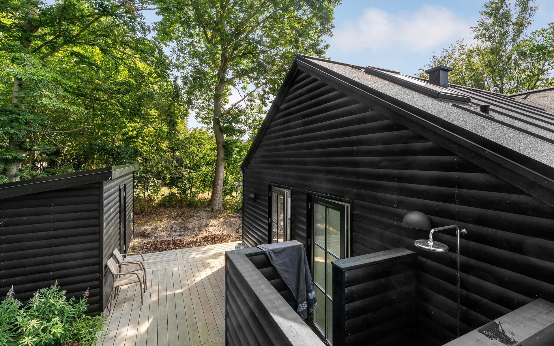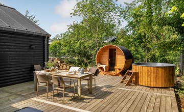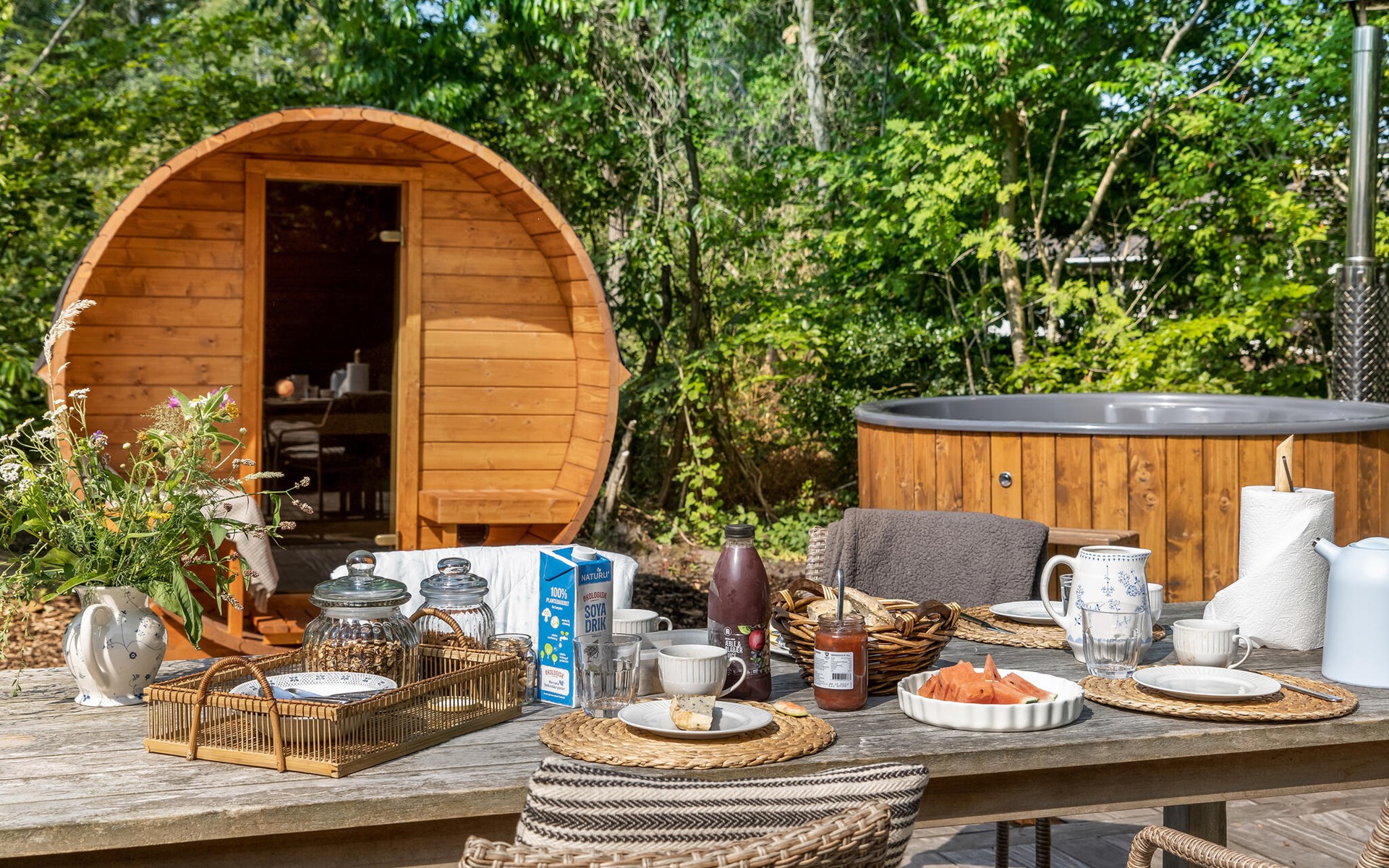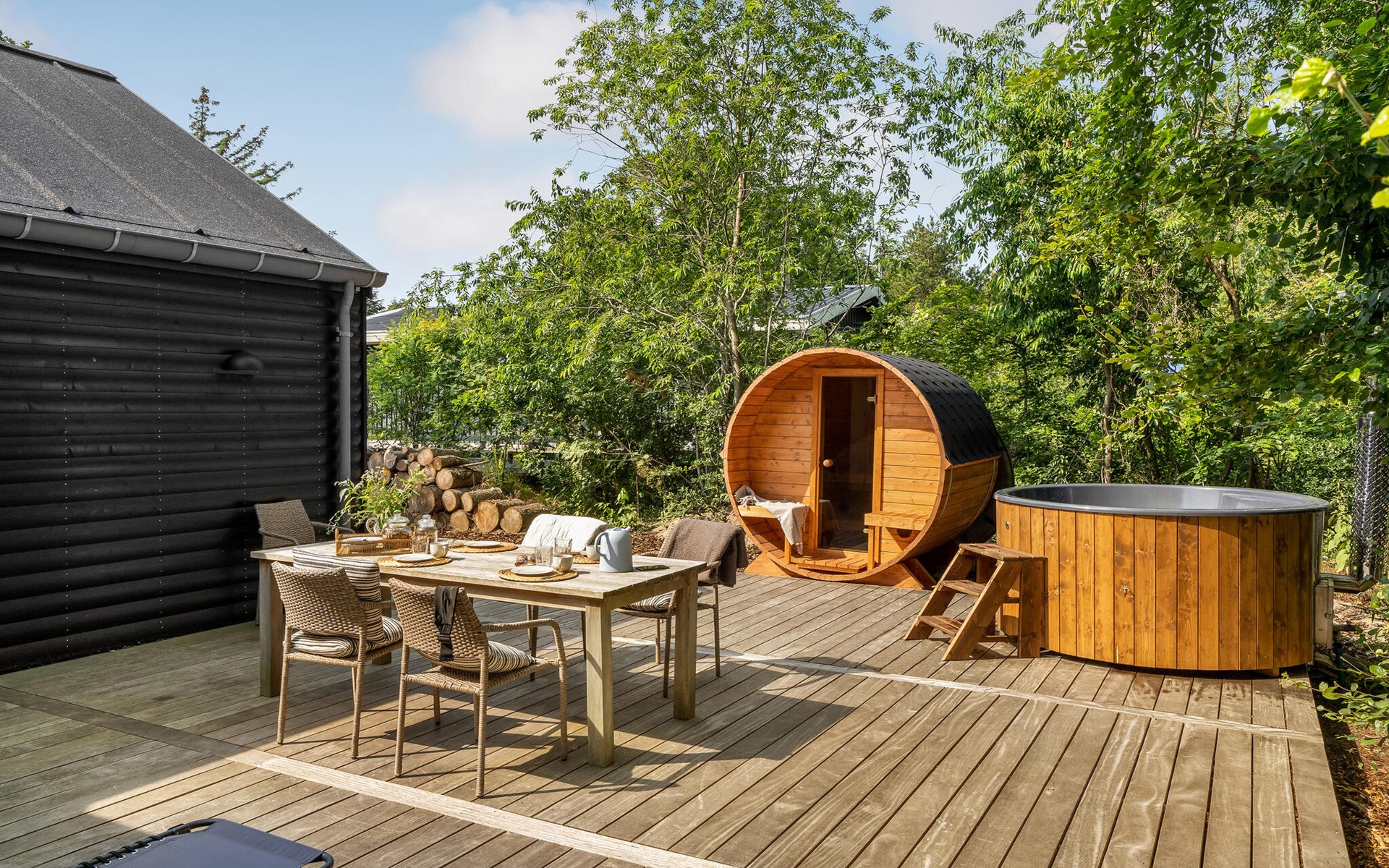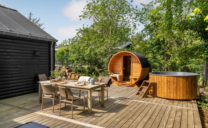 The open terrace with garden furniture and barbecue is a great place to enjoy a barbecue or a delicious breakfast. The Finnish wooden bath and outdoor sauna invite you to relax.