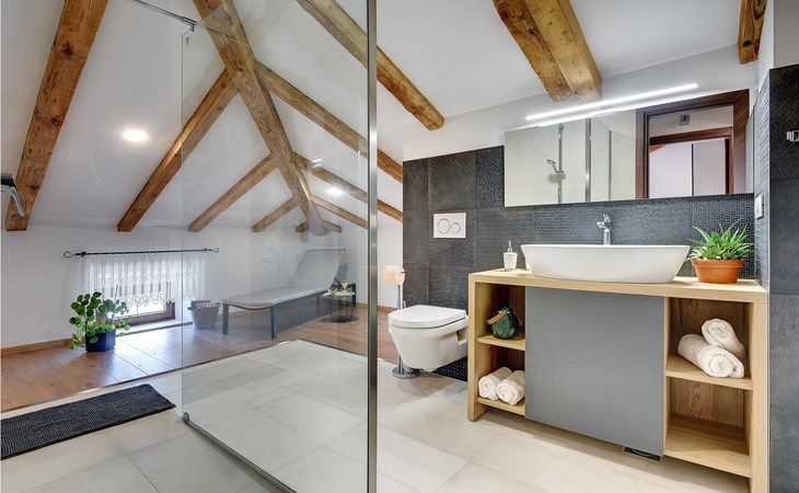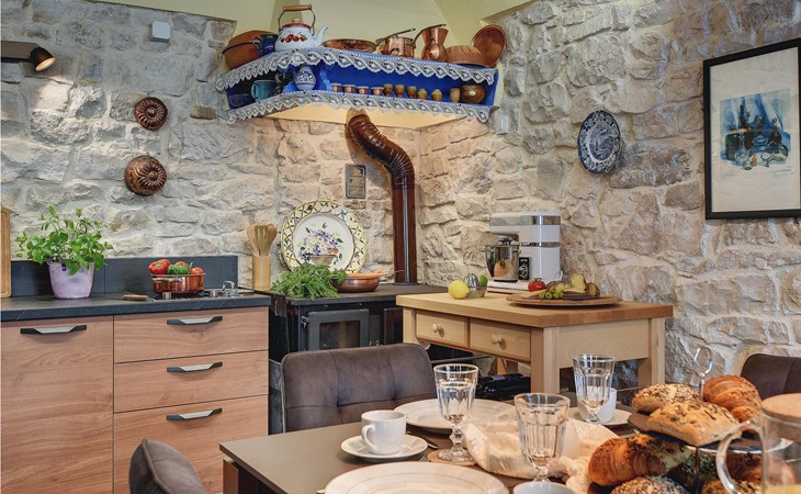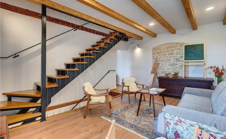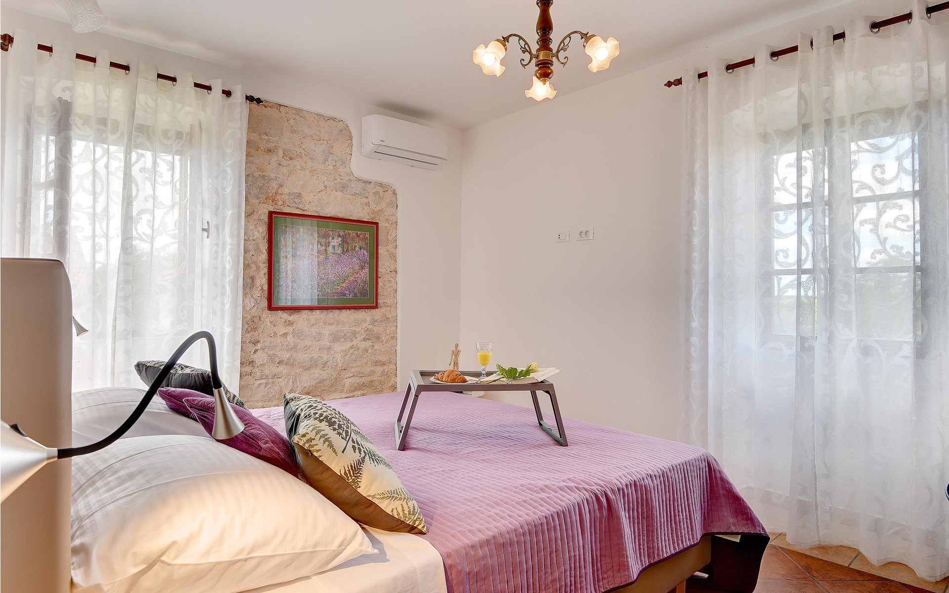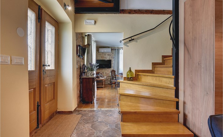 To enter this wonderful building, go through the monumental courtyard gate ("portun") made of profiled stone and wrought iron, above which the name of the founder was carved. On the ground floor of the house, following the example of the two-story baroque palace, there is the living room, which consists of a large dining room and the modernly furnished kitchen and the beautiful country-style living room with the large fireplace, which dates back to the construction period. On the second floor there are two modern furnished bedrooms with air conditioning and each with its own bathroom. On the second floor there is the large master bedroom with private bathroom and a large living room where you can relax, listen to music, paint, watch TV and play Playstation. On the top floor there is a beautiful bedroom with a 3.5m high ceiling made of wooden beams, with private bathroom and a room for meditation and relaxation.