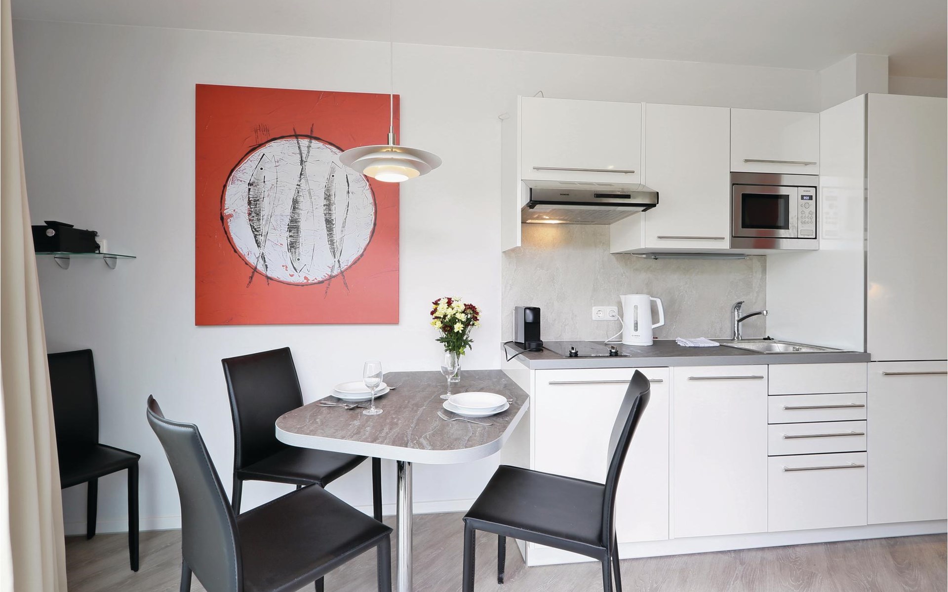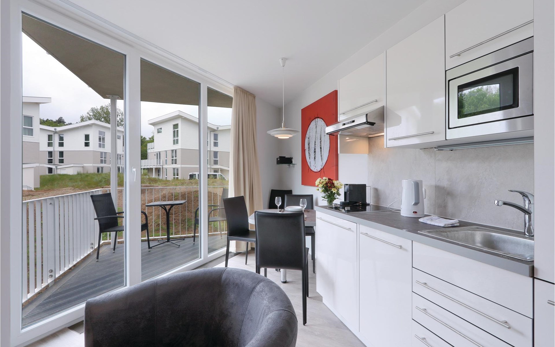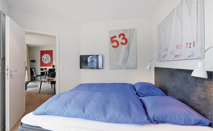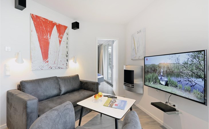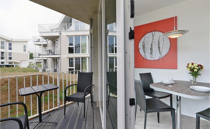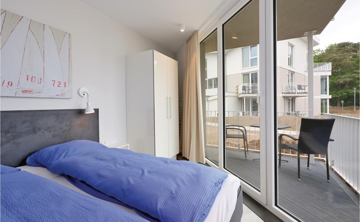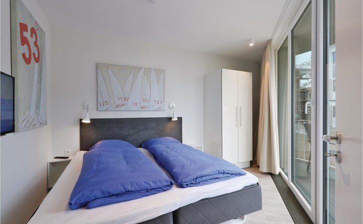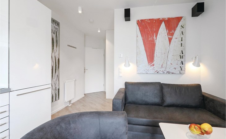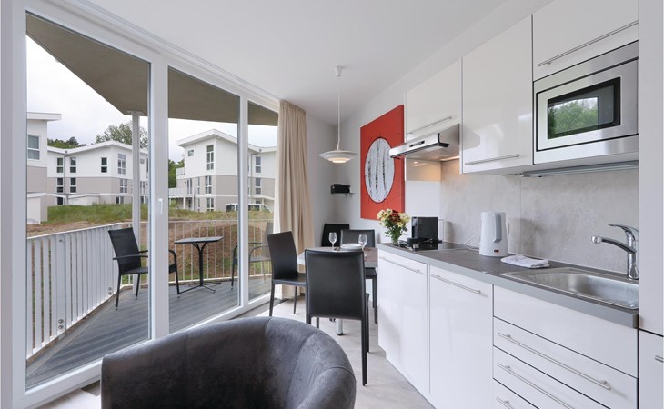 The modern holiday apartment offers enough space for four people. The bedroom is furnished with a cosy double bed and there is a sofa bed in the living area, which can sleep two more people. The kitchenette and dining area are also located here. You can make yourself comfortable in front of the bio-ethanol fireplace. It bathes your holiday apartment in a pleasant light. The two balconies are accessible from either the bedroom or the living area. Here you can enjoy the first rays of sunshine and the fresh Baltic Sea air in the morning.