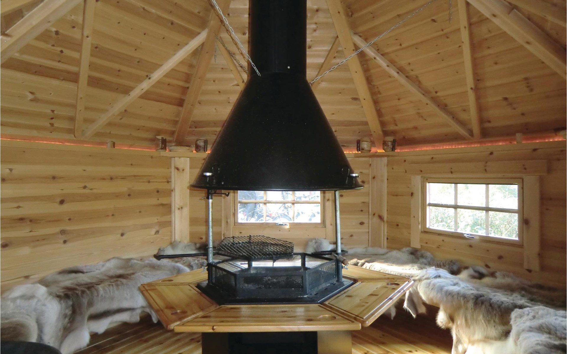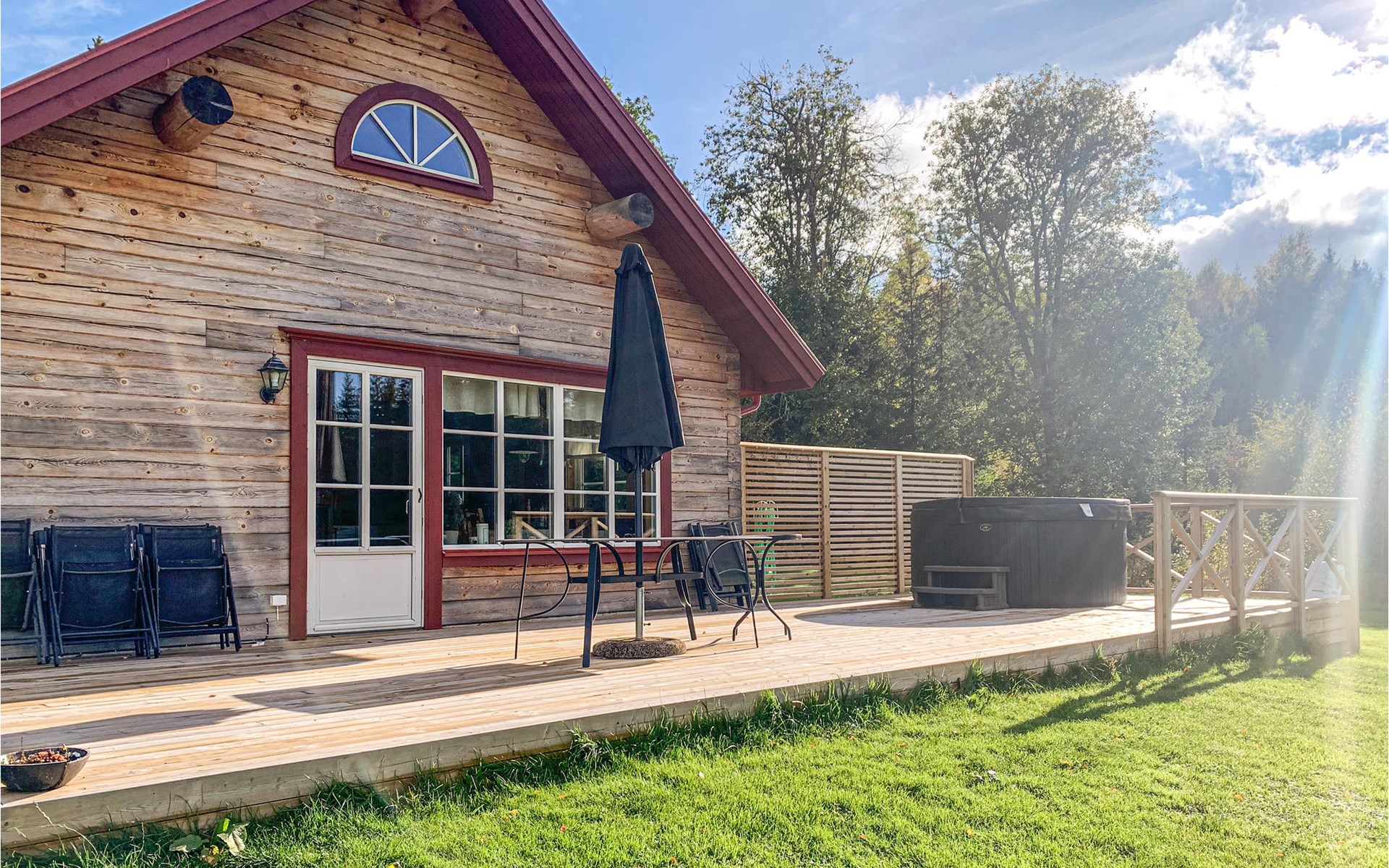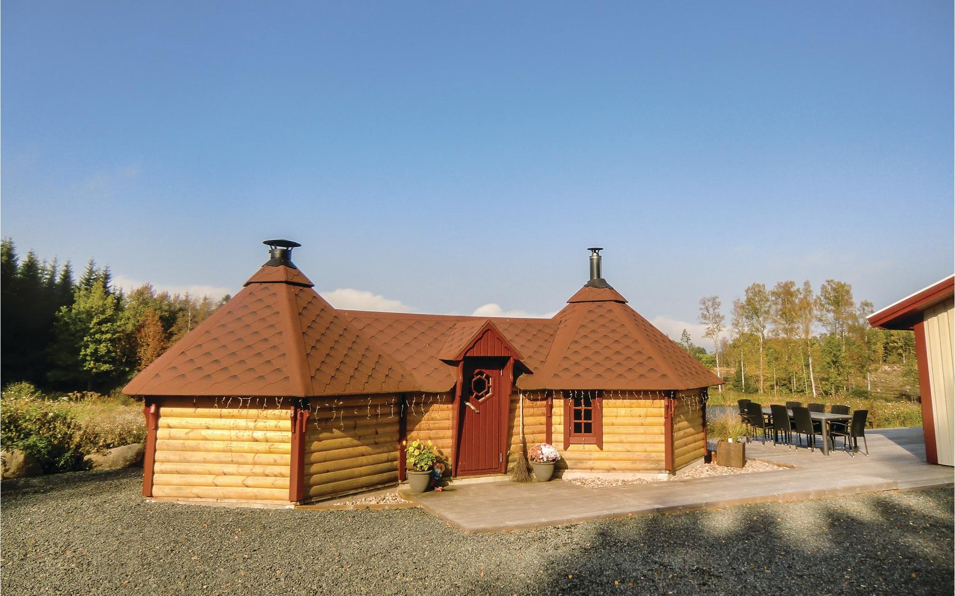 Enjoy the peace and quiet and the view of the pond from this cosy wooden house with barbecue and sauna hut.