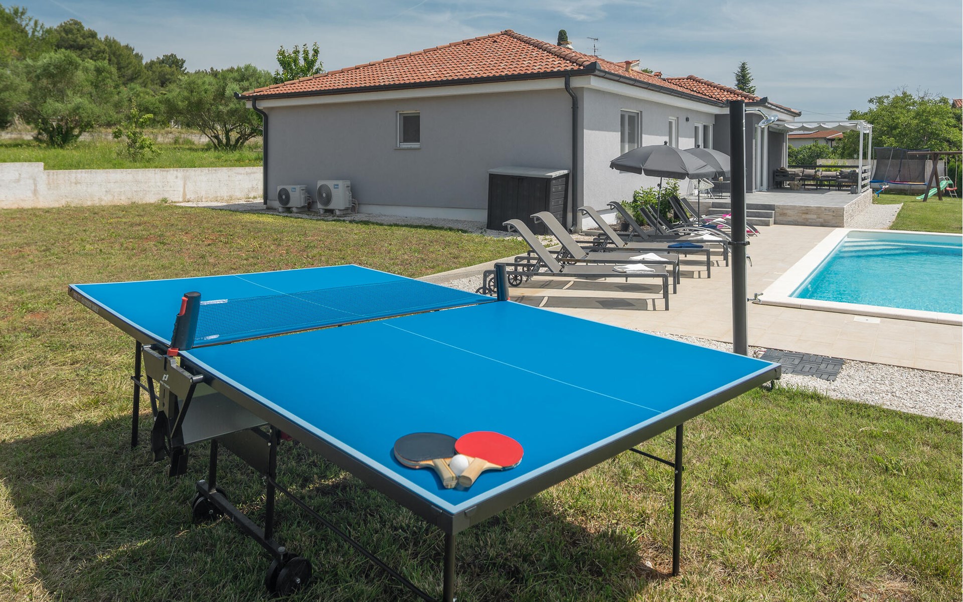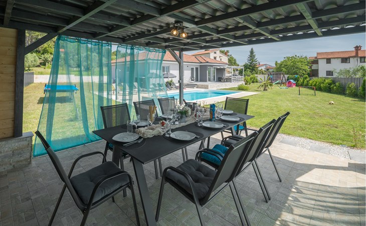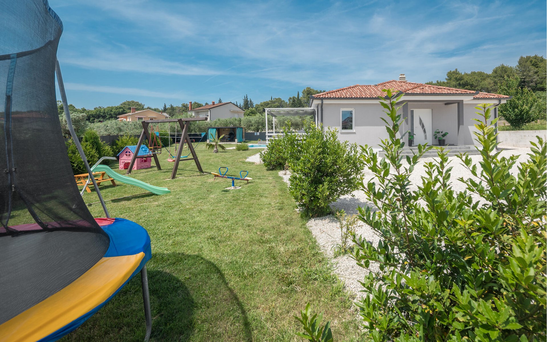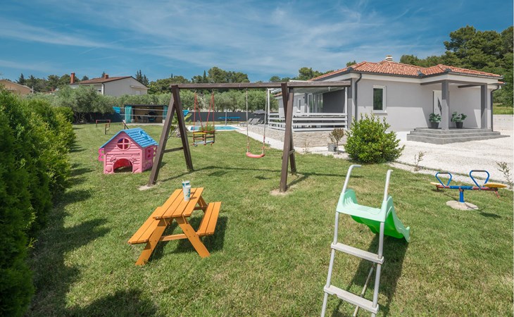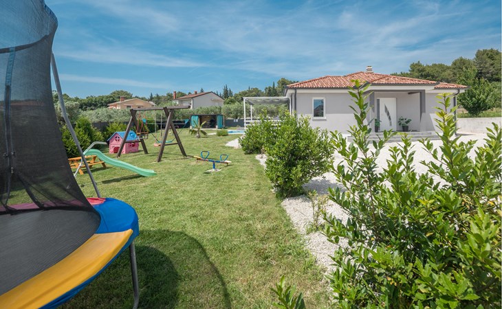 This attractive holiday home with pool is located in a quiet residential area of Pula, on one of the seven hills on which the city is situated. Here you live close to the city centre, surrounded by greenery, on a well-kept and fenced property with children's play equipment, where you are sure to spend a relaxing holiday with family and friends. The host has made sure that your children also have a great time and you can watch them play on the slide, trampoline and swings. Enjoy sunbathing and swimming in the sea on the town's surrounding beaches as well as in Valbandon and Faana. Visit the aquarium in Pula and try go-karting on the Green Garden track.