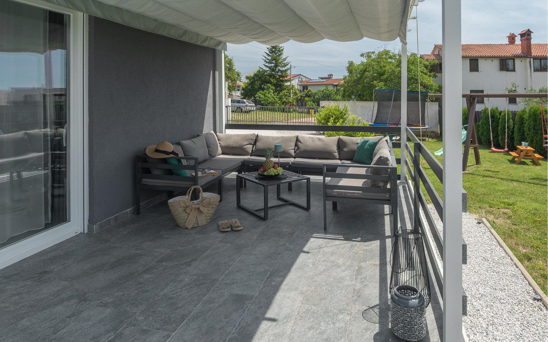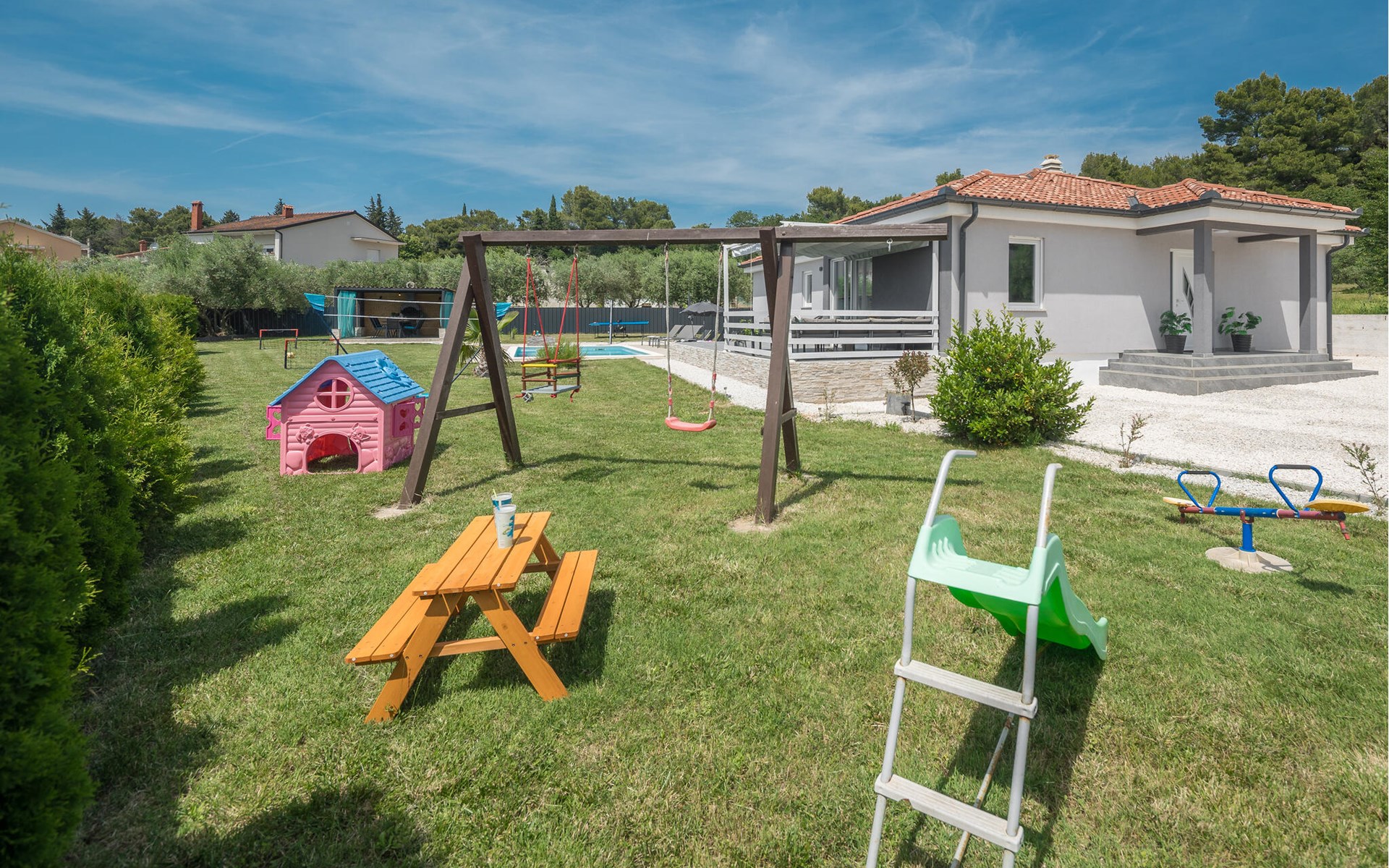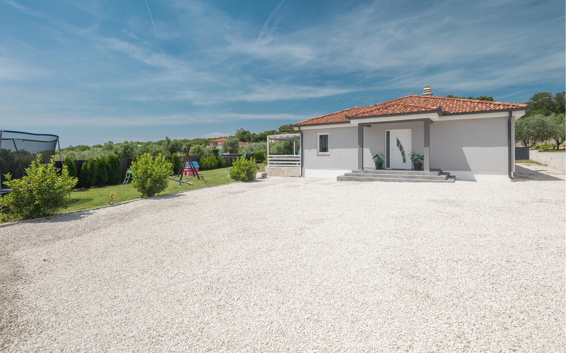 This attractive holiday home with pool is located in a quiet residential area of Pula, on one of the seven hills on which the city is situated. Here you live close to the city centre, surrounded by greenery, on a well-kept and fenced property with children's play equipment, where you are sure to spend a relaxing holiday with family and friends. The host has made sure that your children also have a great time and you can watch them play on the slide, trampoline and swings. Enjoy sunbathing and swimming in the sea on the town's surrounding beaches as well as in Valbandon and Faana. Visit the aquarium in Pula and try go-karting on the Green Garden track.
