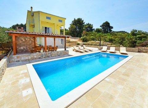 This tastefully furnished vacation home is located on a hilly terrain with a beautiful panoramic view of the sea and the old town of Omis. It consists of two apartments, with outdoor stairs. The house is ideal for a group of friends or several families. The larger apartment has two floors and in its attic (minimum ceiling height 60 cm) there are two bedrooms. In the offer are still a pool, the mini-gym, facilities for children and the barbecue. The town of Omis is surrounded by the river, islands, mountains and sea, so it is an ideal base for your vacation. The owner is waiting for you with a welcome snack and drink.
