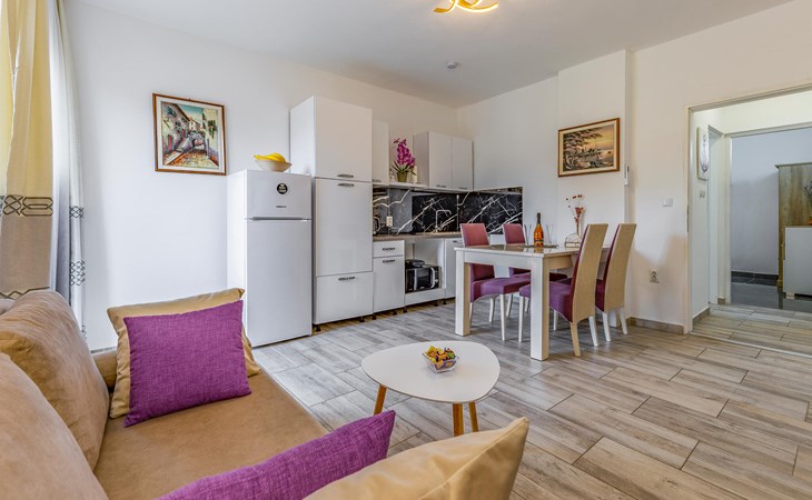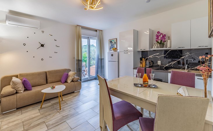 If you are planning a holiday close to the sea and want to experience the surrounding area, this apartment is the right choice. It welcomes its guests not far from the beach and, with its inviting rooms and beautiful views, offers the ideal setting for your time out as a couple. After an active day, make yourself comfortable in the living room, eat together with the patio door open and chat on the sofa for a long time.