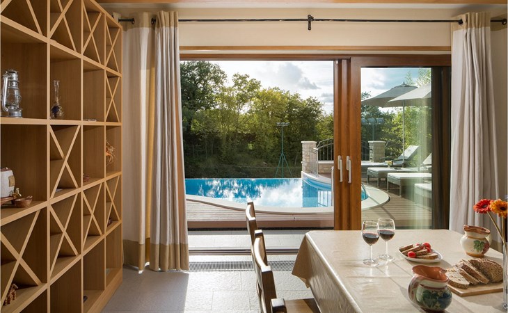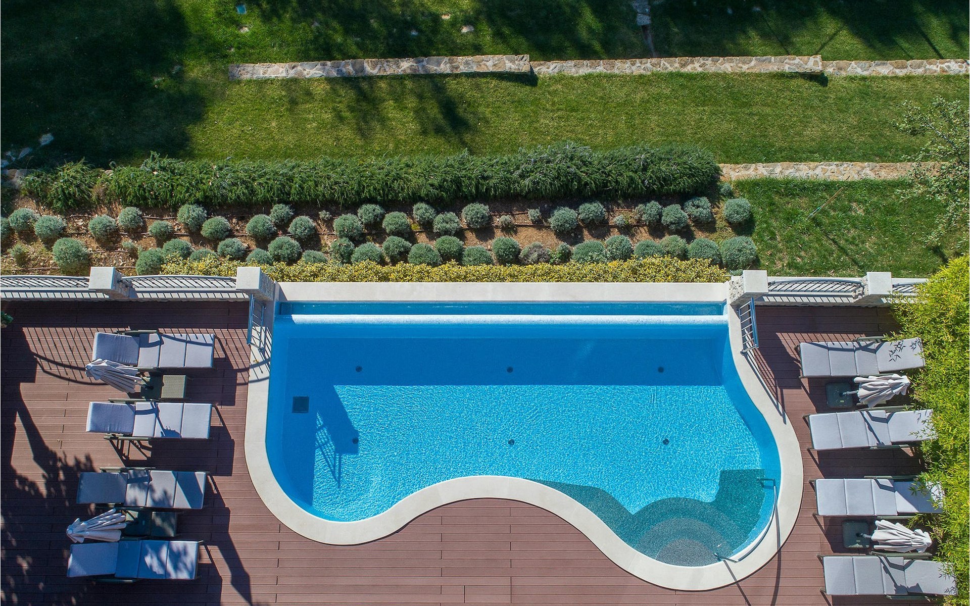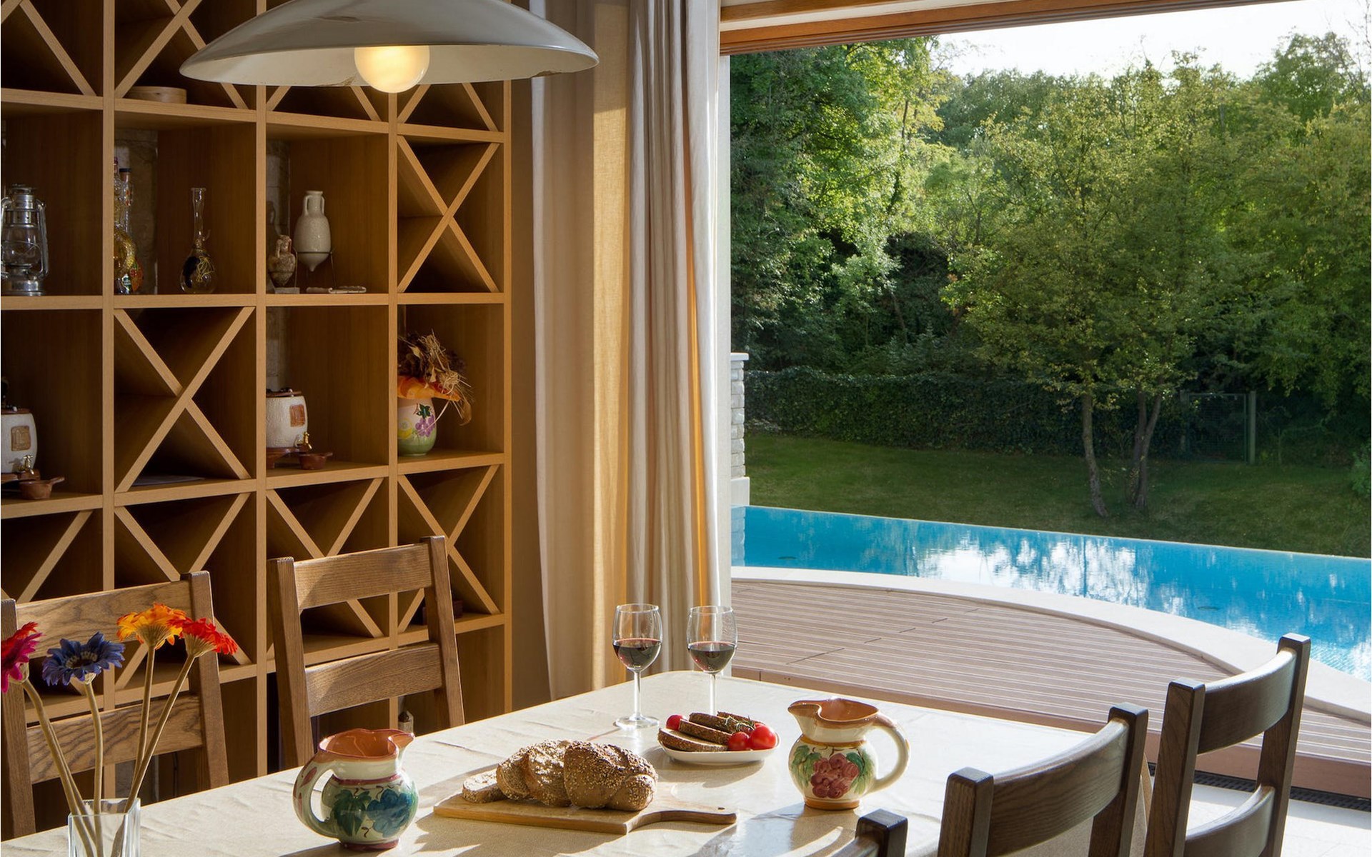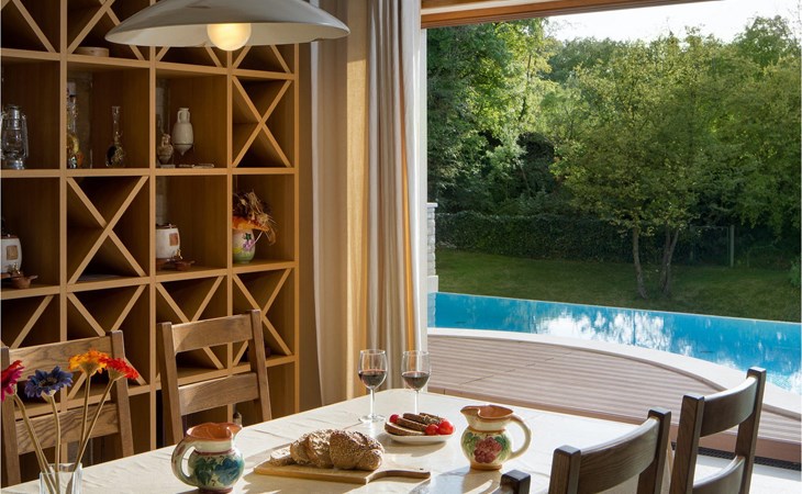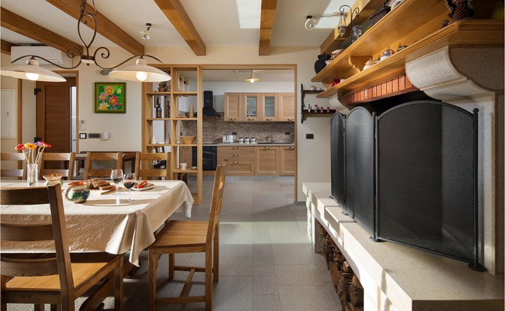 On the first floor is a stunning living area with a fully equipped open concept kitchen. The wonderful living room offers a cozy family corner with a fireplace for cold days and air conditioning for warm ones as well as a Play Station game console for children. On the first floor there is another room with a double bed and an en-suite bathroom. If you like to cook and try new specialties, this villa offers a unique spacious tavern with a fully equipped kitchen. Ideal for long evenings with the family, meals fresh from the fireplace but also quiet coffee breaks overlooking the inviting pool. On the second floor there are 3 spacious, stylishly furnished bedrooms with double beds, air conditioning, central heating, TV and en-suite bathrooms with underfloor heating. 2 rooms have access to 13 m2 terraces with seating and beautiful views of the garden and the green, mountainous surroundings.