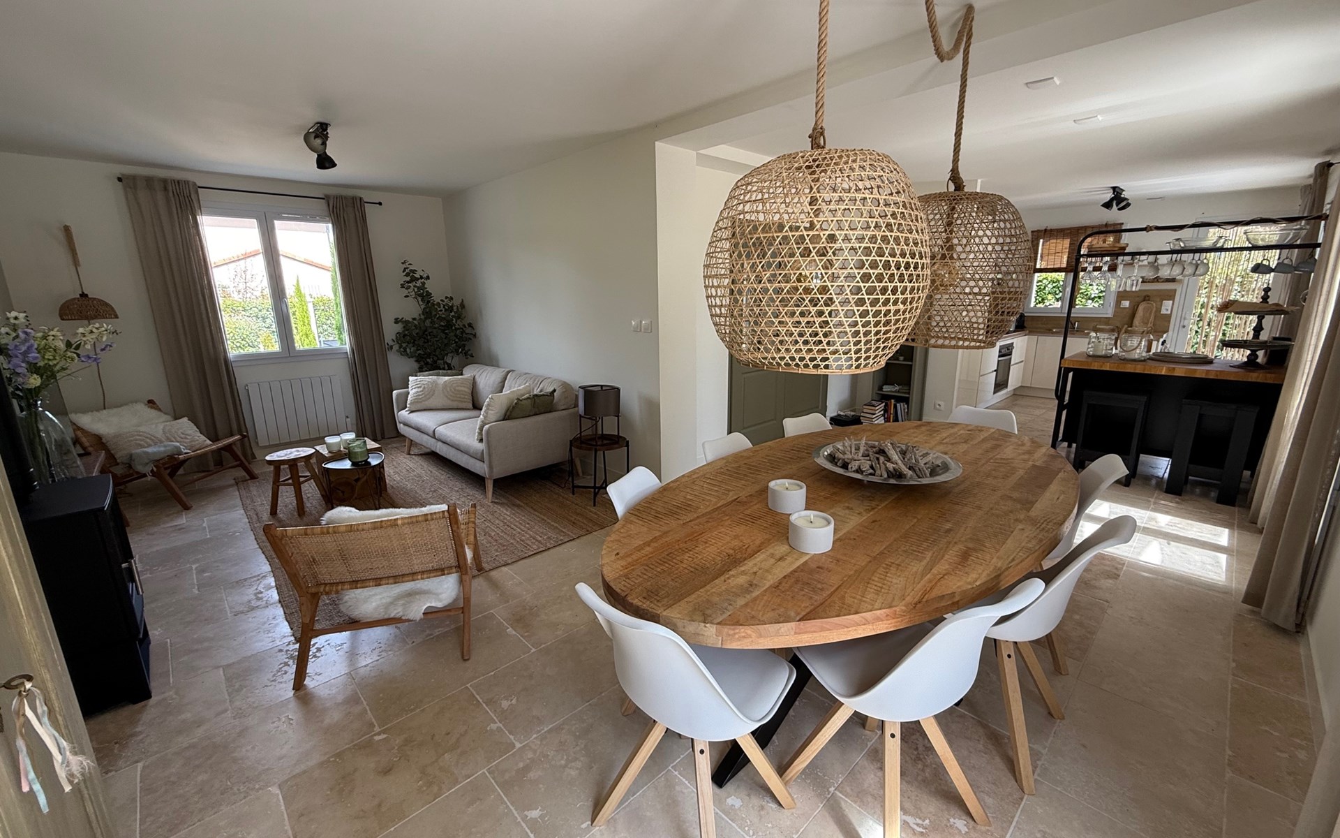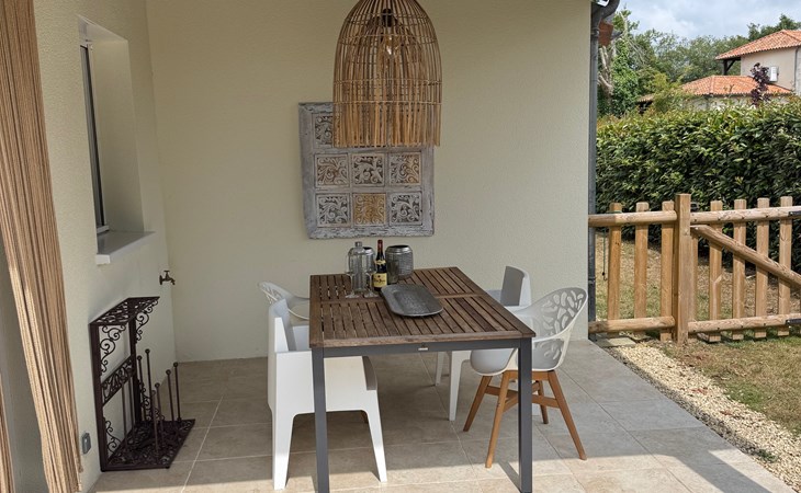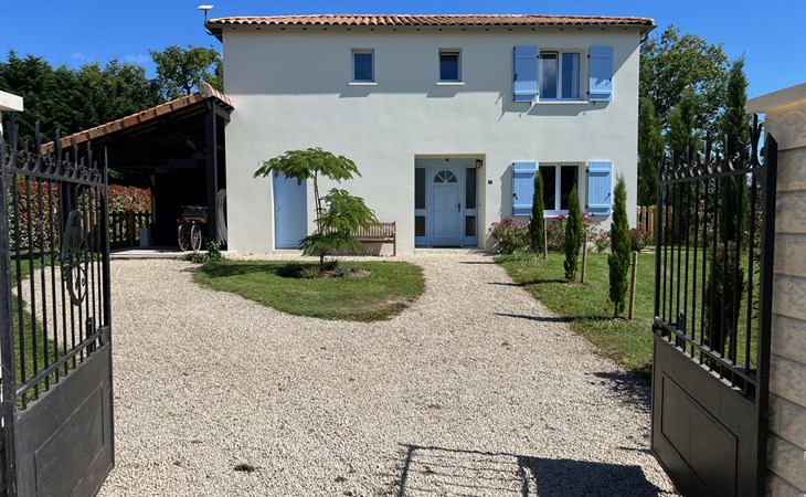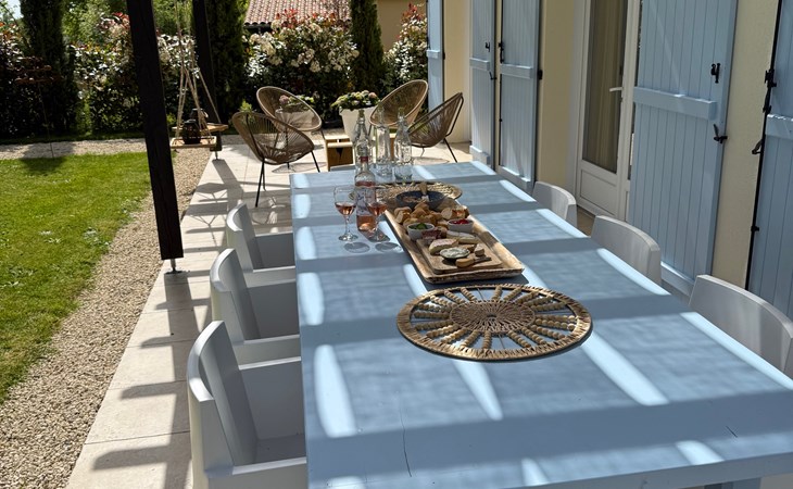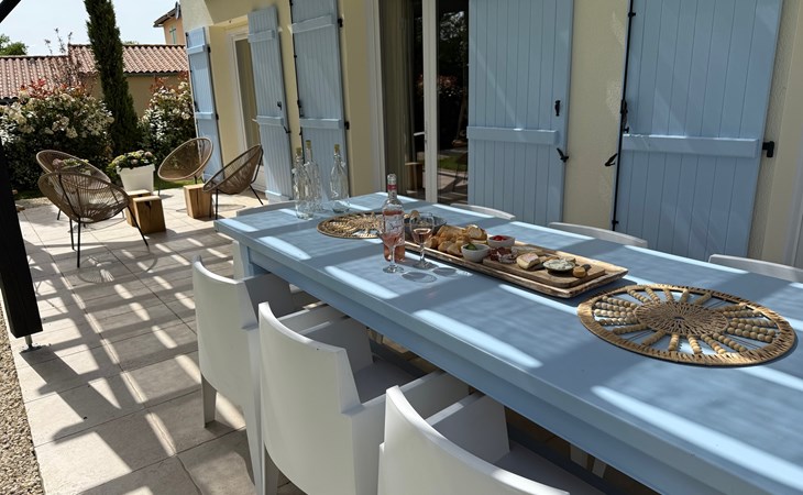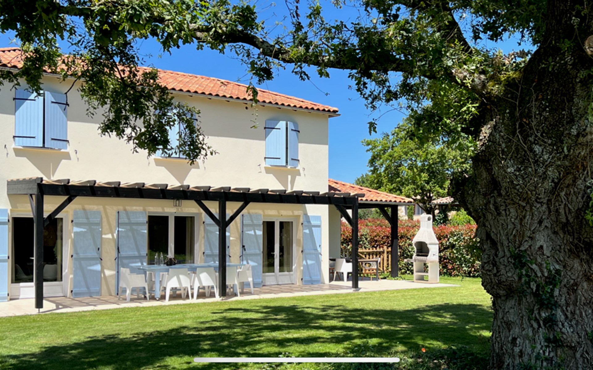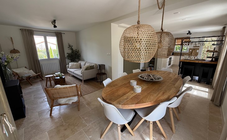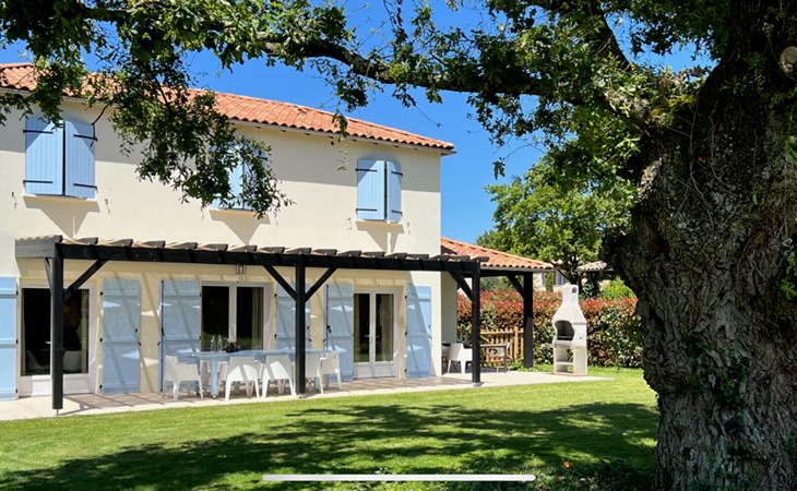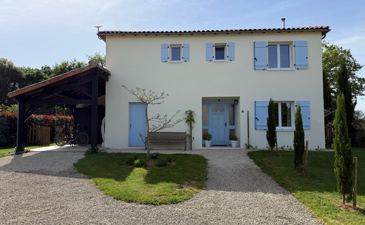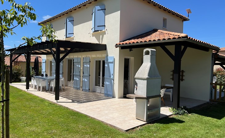 Light, modern and comfortable! The newly built villa of 140 m² with a large garden, spacious terrace with dining area offers peace and tranquility amidst the greenery of the French countryside. The villa has 4 bedrooms, 2 bathrooms and can comfortably accommodate up to 8 guests. The indoor dining area has a large wooden table with 8 chairs. The outside dining area on the terrace has a large table with 8 chairs. The spacious living room is tastefully decorated and filled with lots of natural light. All windows have wooden shutters outside and curtains inside. Parking spaces for several cars are available in front of the house.